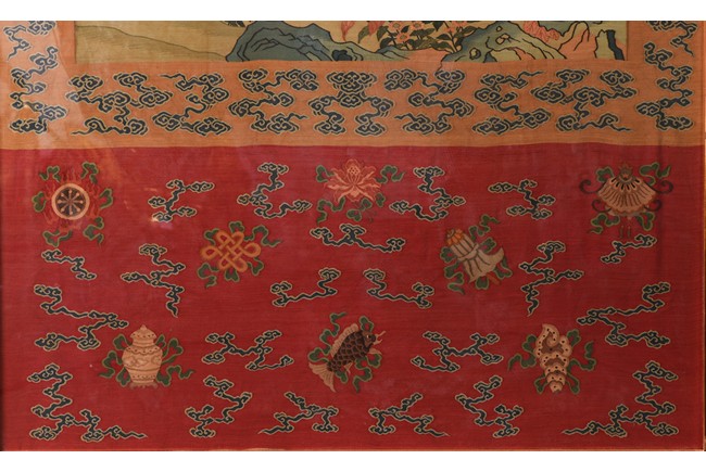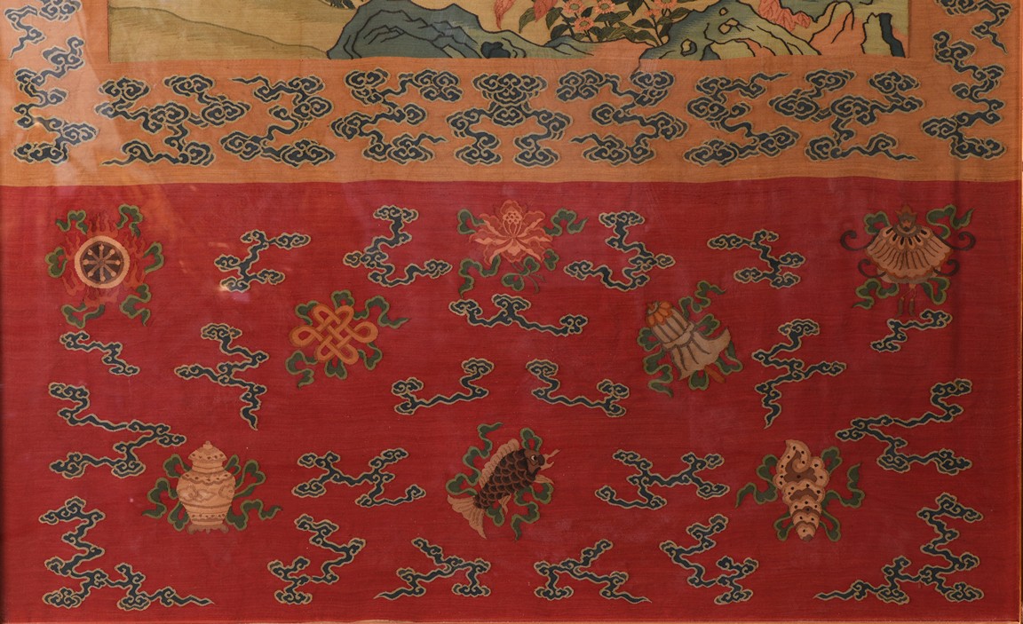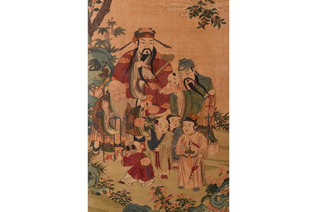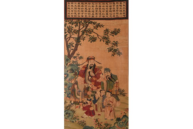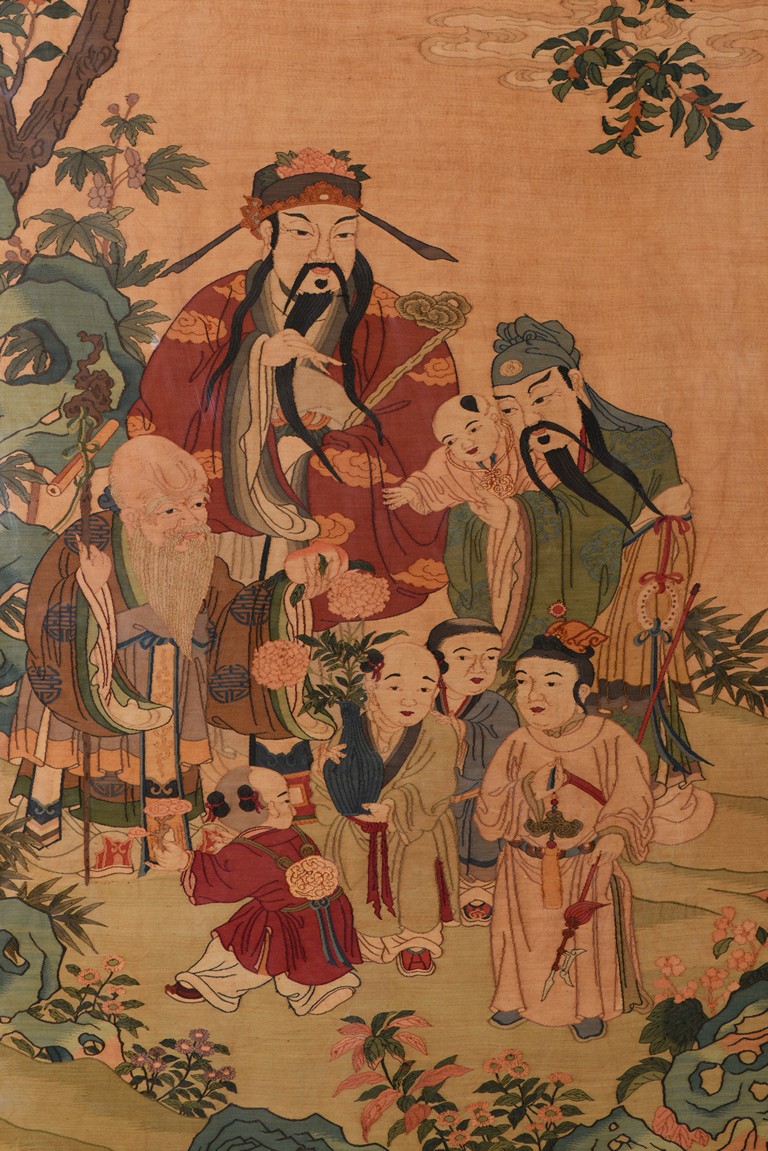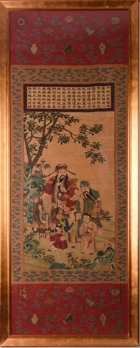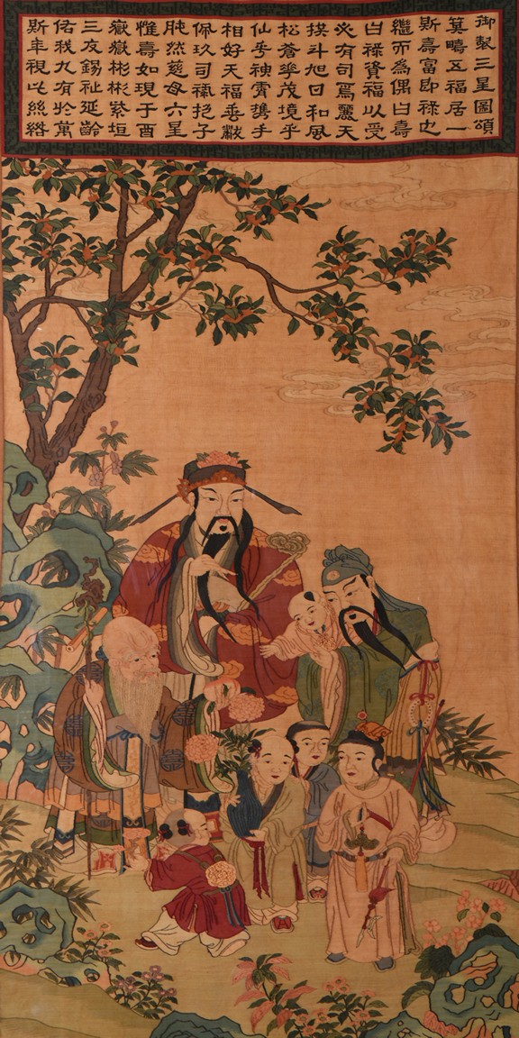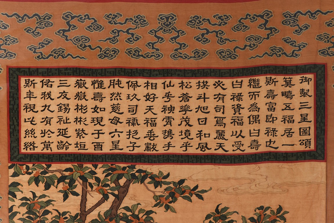 The rectangular panel delicately woven and enhanced with painted details of a scene of Three Star gods, the god of good fortune, longevity, and emoluments holding a baby in arms, surrounded by and four well-dressed children, all set in an idyllic garden landscape with tall trees and rocky landscape, on the top of woven with an imperial poem inscription praising the Three Star gods. Qing Dynasty period.