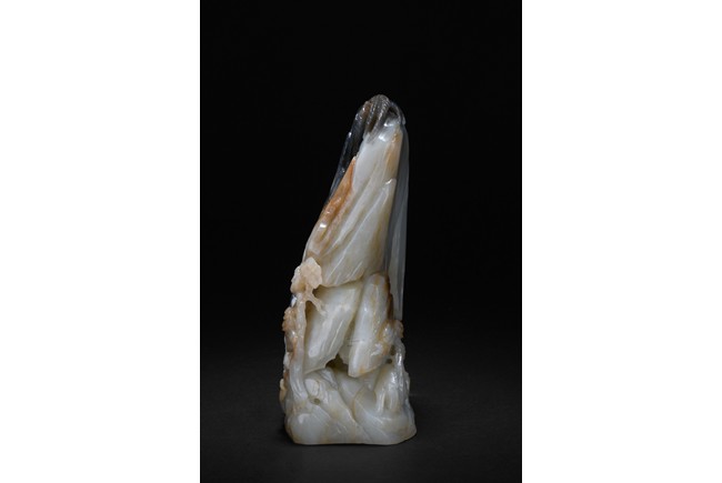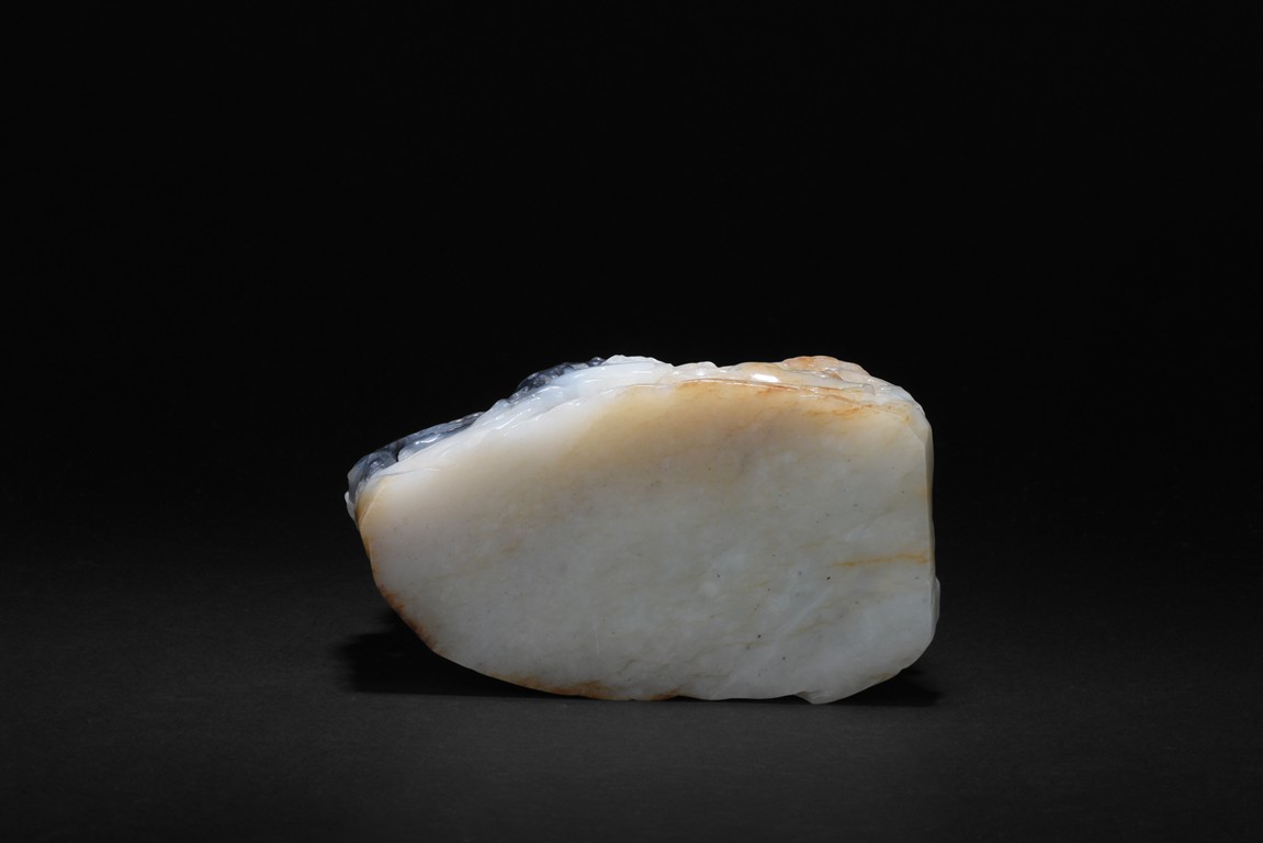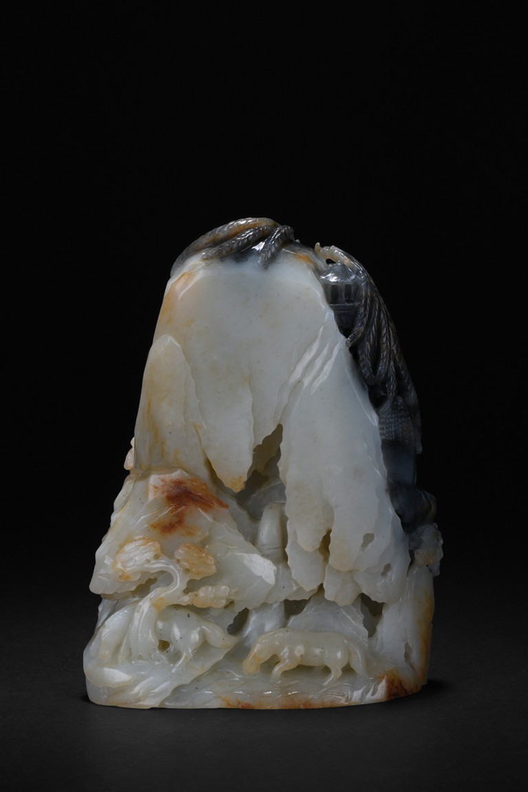 Of irregular boulder form, finely worked in openwork to one side with tall willow tree in black jade and an official riding on a horse along the mountain path near pine trees in russet color jade, the reverse close to the bottom with two running horses in the mountain setting, the stone of even white colour with grey inclusions and russet skin skillfully incorporated into the design of the boulder.