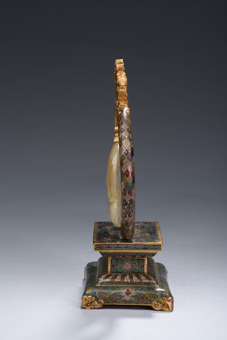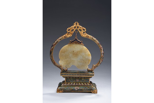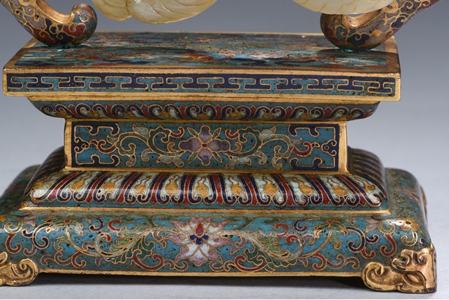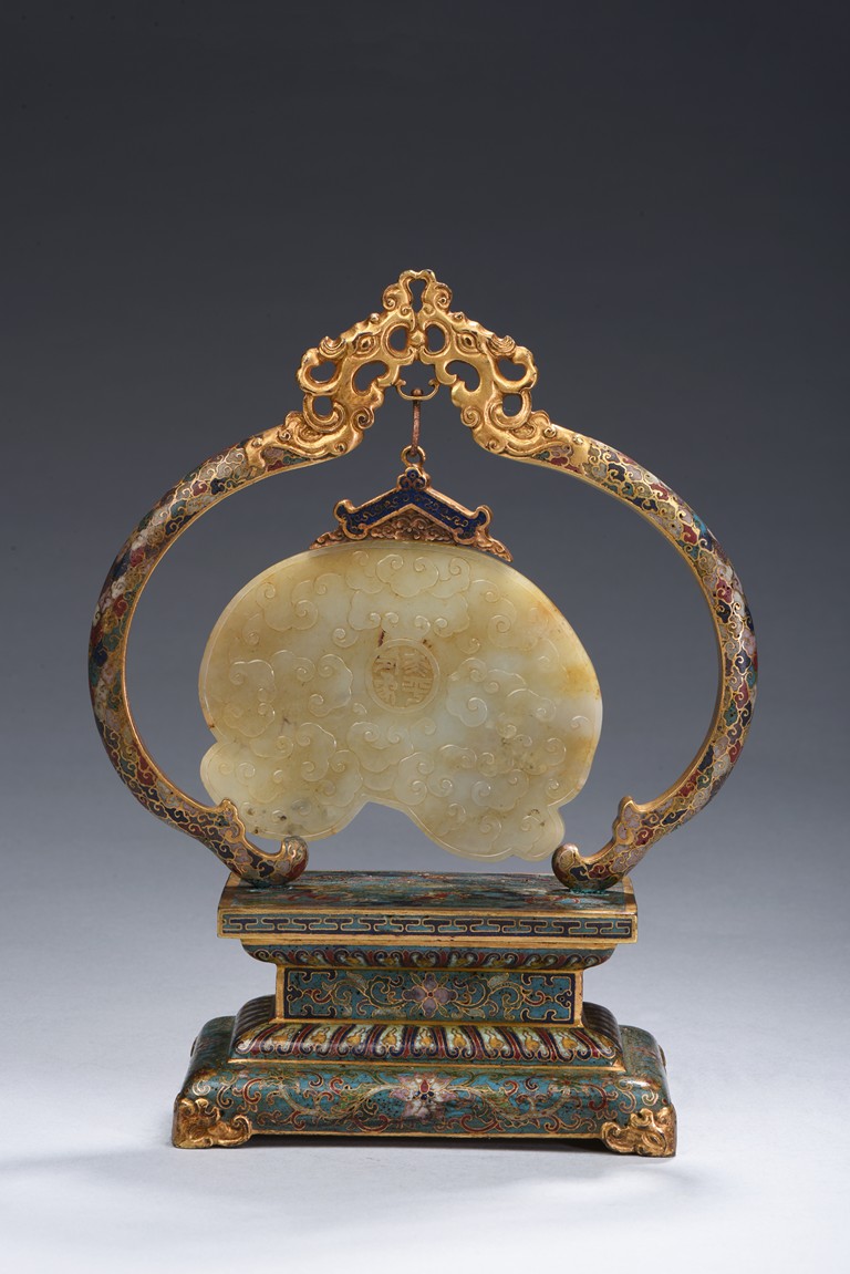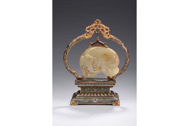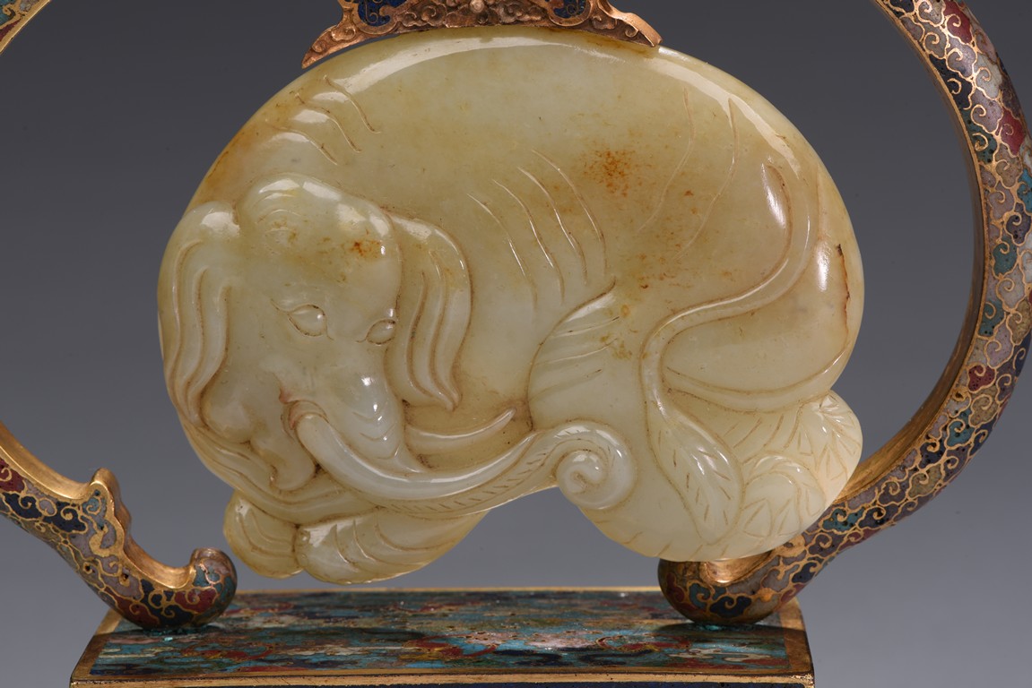 Raised on a rectangular cloisonne enamel stand surmounted with an arch-shaped frame with gilt pierced dragon finial, below it hanging a stylized 'pebble-form' white jade elephant standing foursquare with its trunk curling up to left hind leg between projecting tusks, with naturalistic markings to the feet,ears and tail and accented with incised wrinkles overall, the stone of even white tone with irregular patches of russet inclusion. Qing Dynasty period.