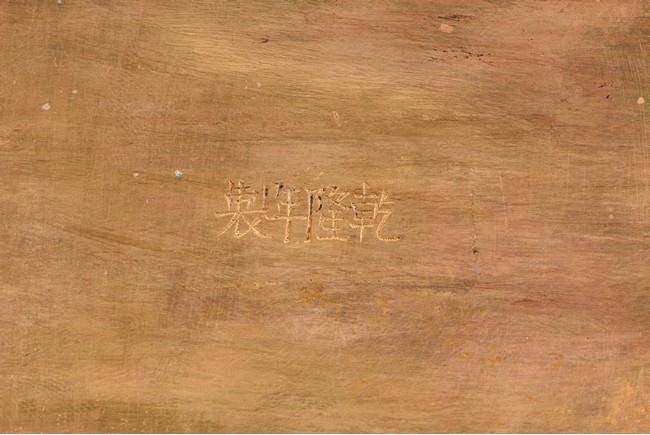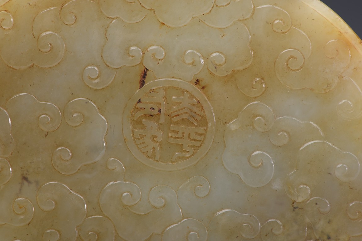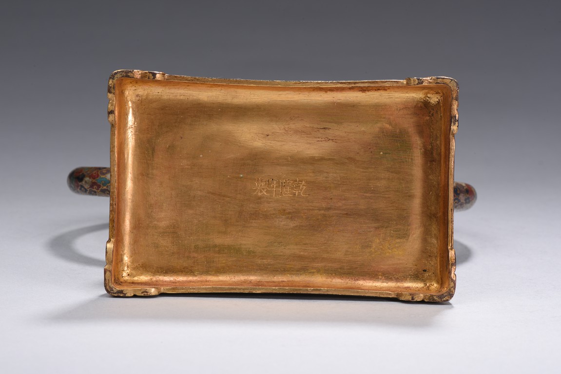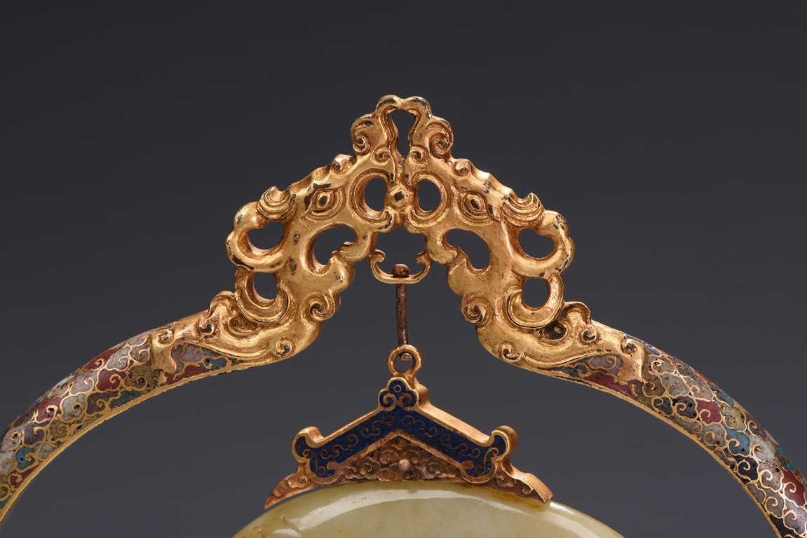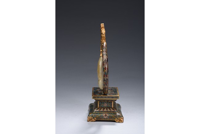 Raised on a rectangular cloisonne enamel stand surmounted with an arch-shaped frame with gilt pierced dragon finial, below it hanging a stylized 'pebble-form' white jade elephant standing foursquare with its trunk curling up to left hind leg between projecting tusks, with naturalistic markings to the feet,ears and tail and accented with incised wrinkles overall, the stone of even white tone with irregular patches of russet inclusion. Qing Dynasty period.