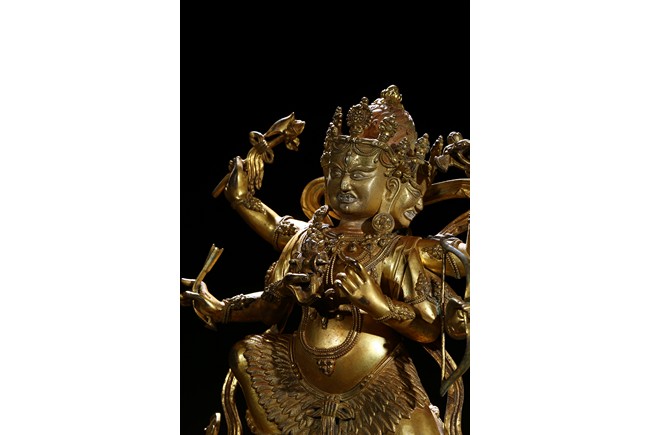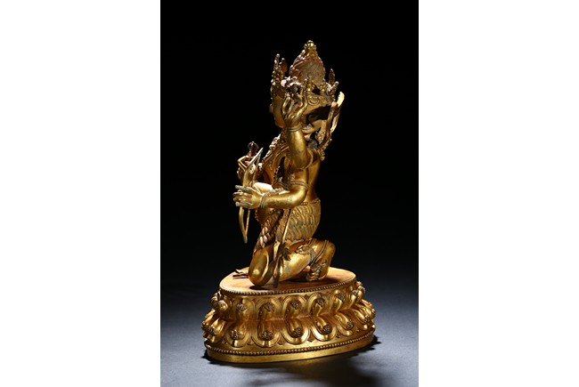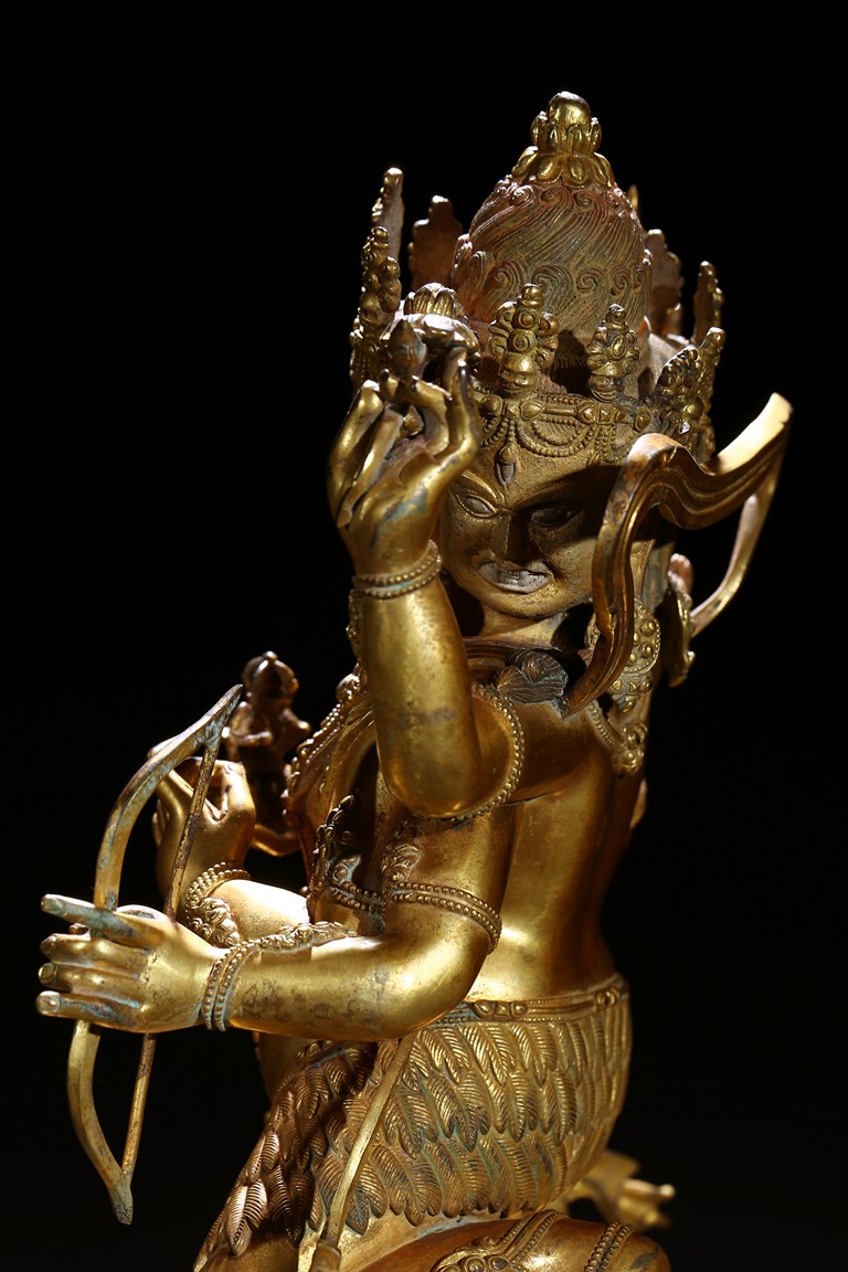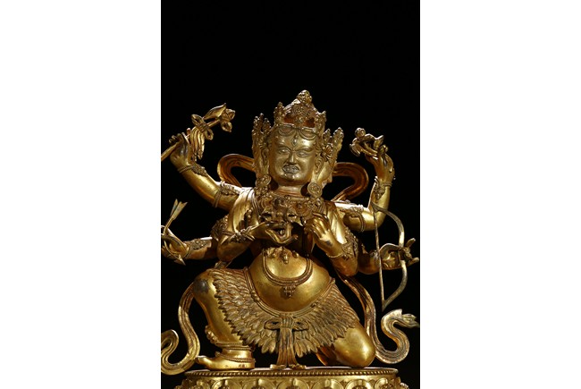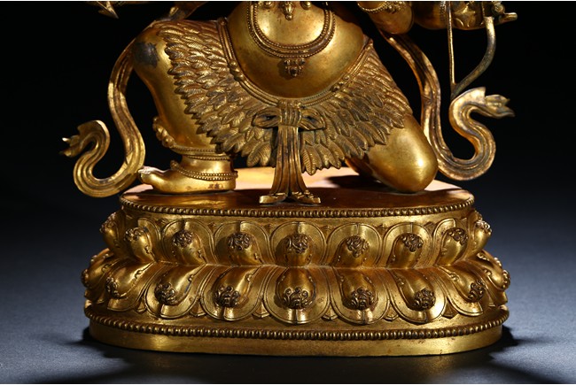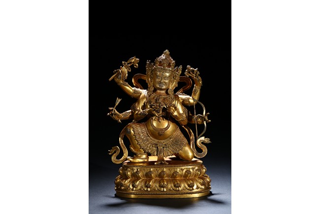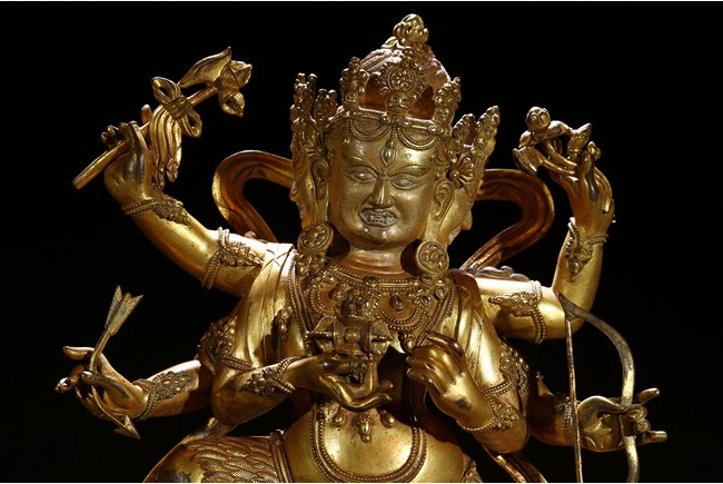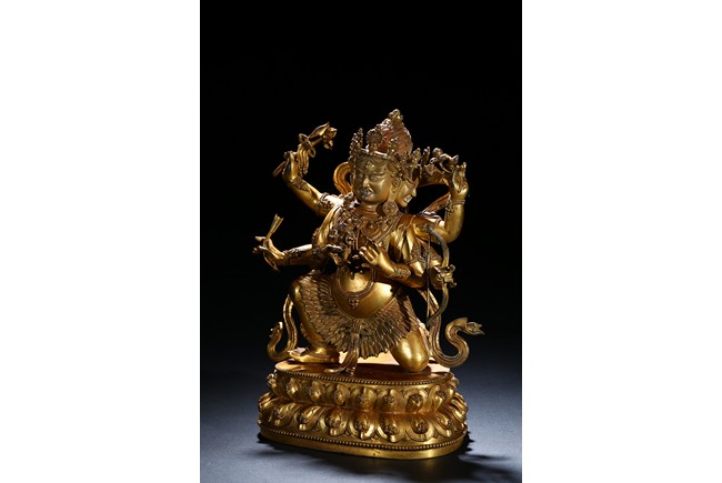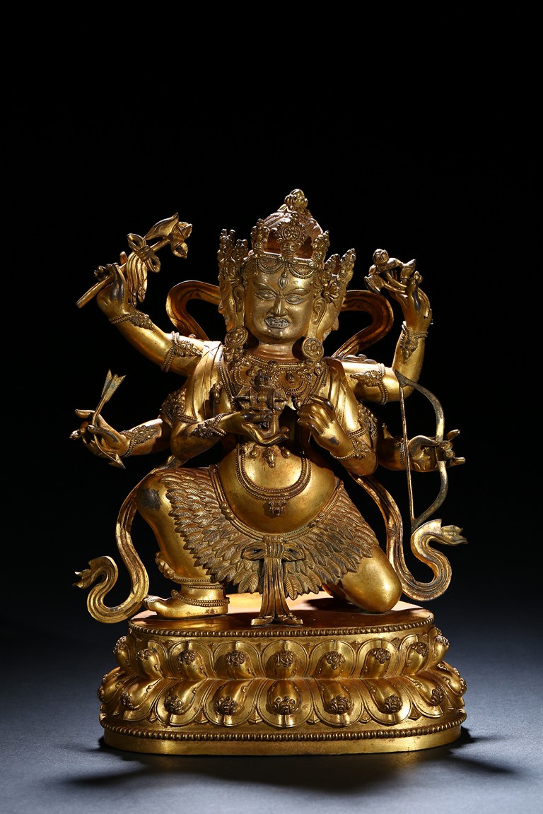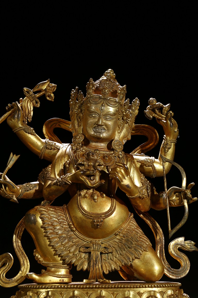 大黑天原為印度教中的神祗, 後被納入佛教, 成為佛教中的守護神。藏傳佛教認為大黑天為大日如來降魔時呈現出的忿怒相, 在西藏受到廣泛尊崇。此尊罕見大黑天造像呈三頭六臂, 咧口呲牙, 左右手各持法器, 雙層蓮花排列規則, 花瓣飽滿, 做工極為精細, 鎏金纯正, 極具收藏價值。
