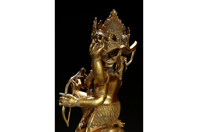 Finely gilt and cast, the Tibetan bodhisattva is shown standing with one foot kneeled upon a double lotus throne, the six arms radiating around her and holding various implements, including a vajra in primary hand, a fresh leave and bow in left secondary hands, an axe and arrow in right secondary hands, wearing elaborate jewellery, his three face with intense expression and topped by a jeweled tiara, his hair tied in high chignon. The six character 'Yongle' mark is inscribed in a line on the top of the base . Ming Dynasty period.