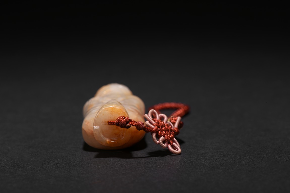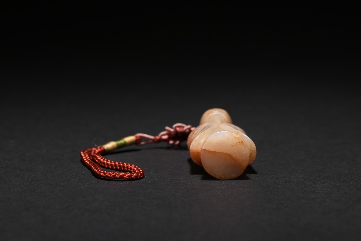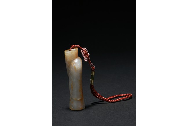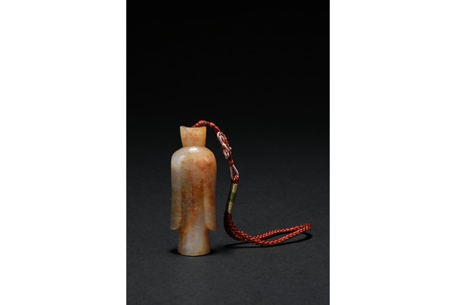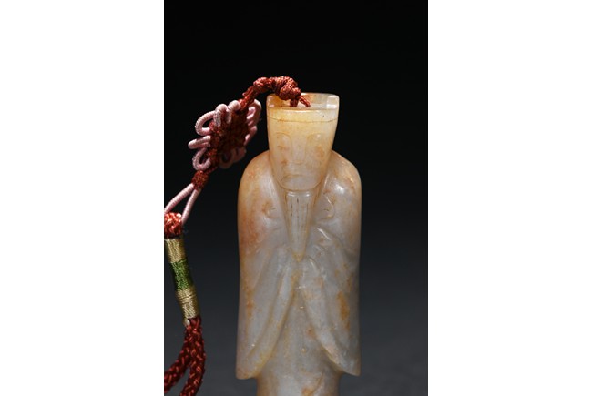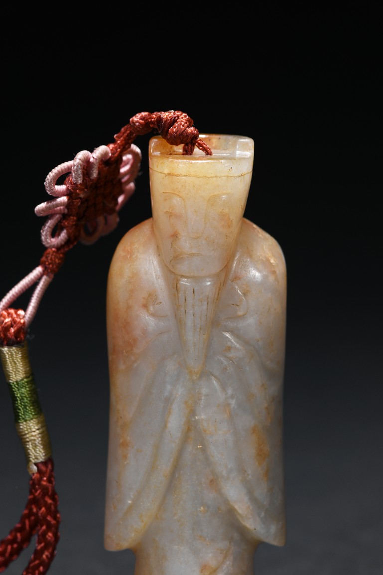 The white stone carved in the form of a standing official wearing long robes, with russet inclusion and mounted as a pendant,pierced for threading a string. Ming Dynasty period.