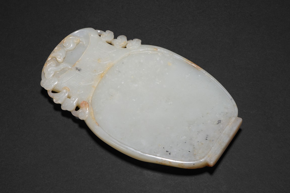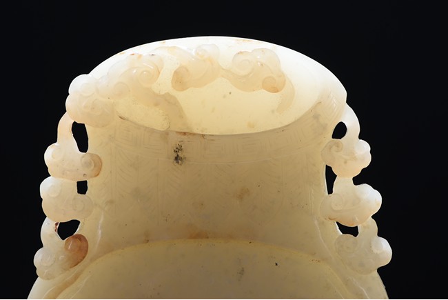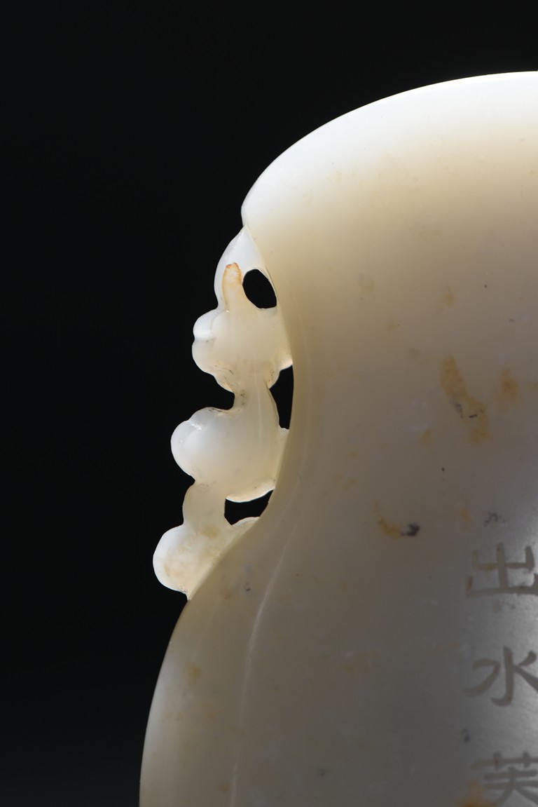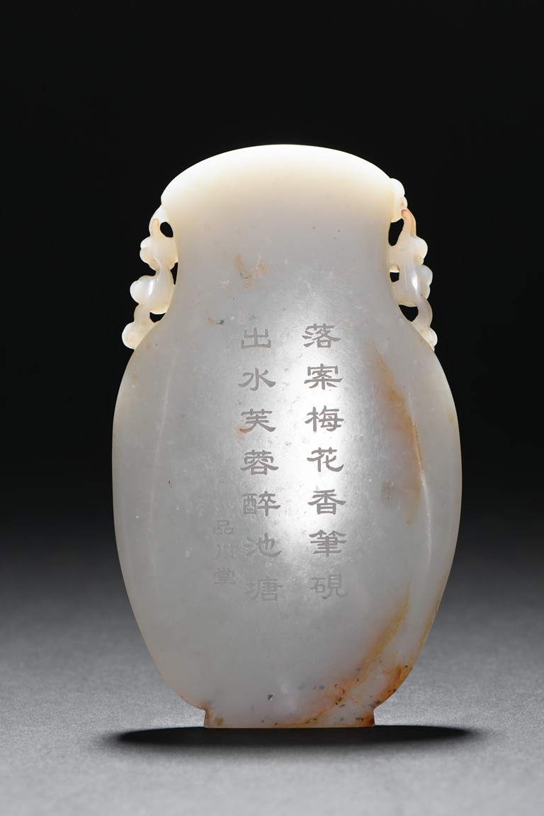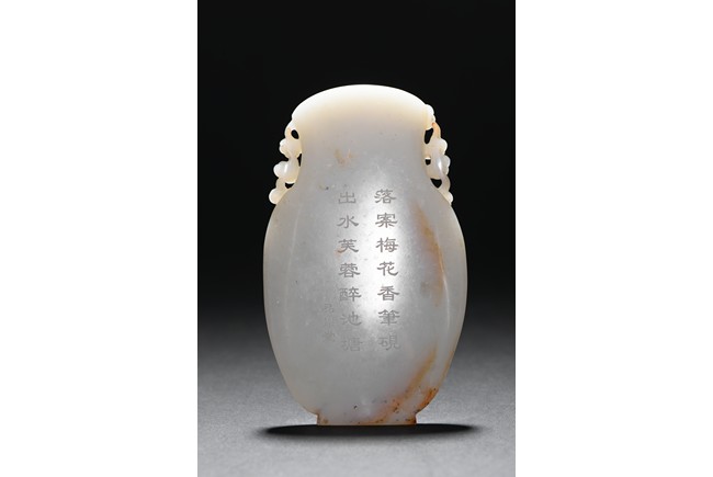 In the form of a flattened ovoid vase supported on a short spreading foot, rising to a neck flanked by a pair of three-lingzhi-shaped handles, the body finely carved with two lines of poem inscriptions, on the inkstone surface the neck encircled with a wide band of leaves blades lappet and framed below with scrolling lingzhi head and key-fret band, the stone of an even white tone with traces of russet flecks. Qing Dynasty period.