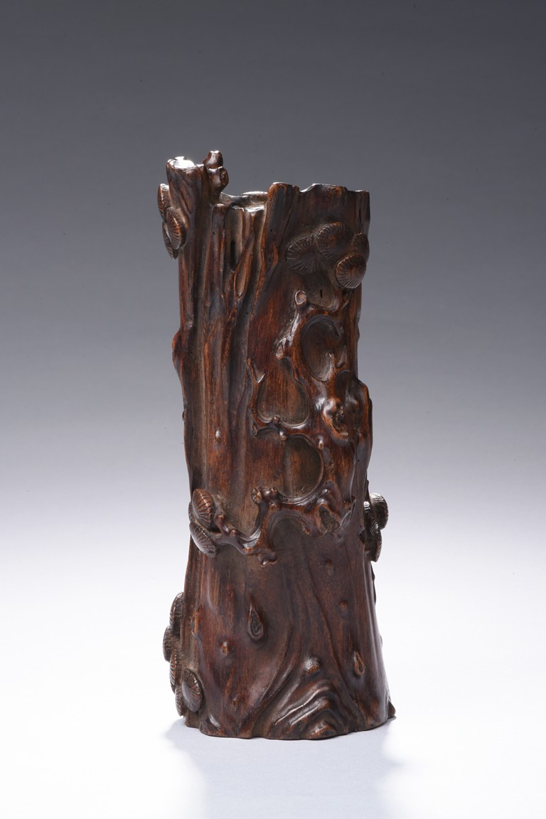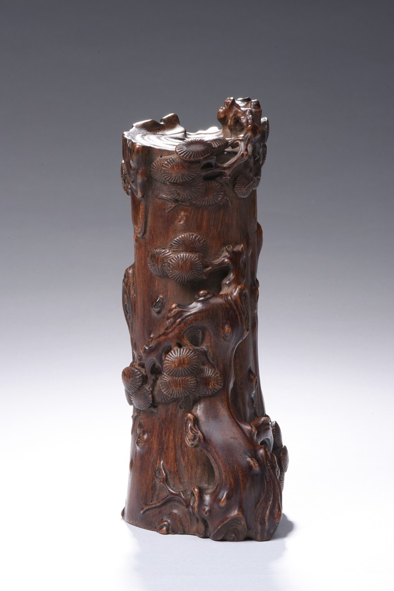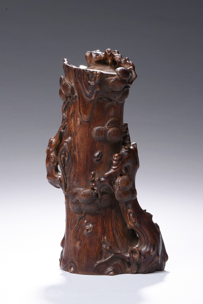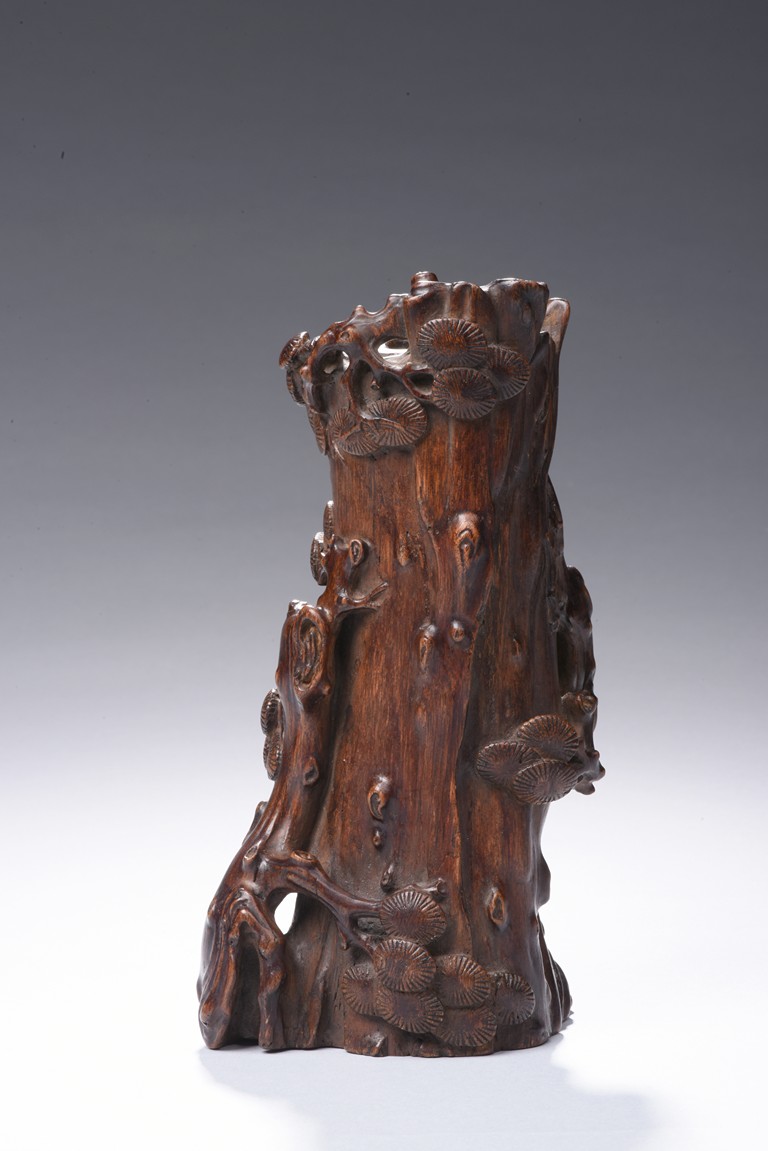 The slender vertical body naturalistically carved in the form of a gnarled pine tree trunk with subsidiary branches bearing clusters of pine needles, one issuing from the base before splitting on each side of the trunk, the other growing down from the top, the base and lip with irregular concentric rings to indicate weathered growth-lines. Qing Dynasty period.