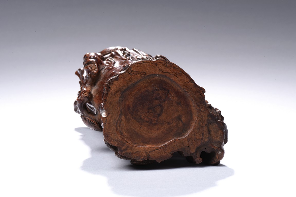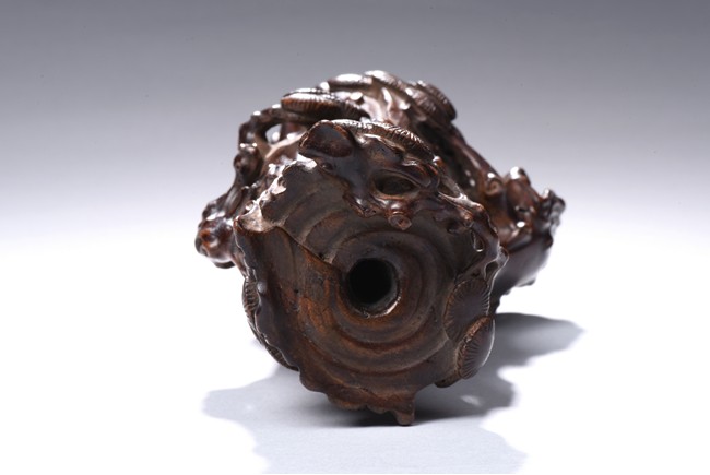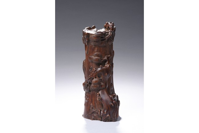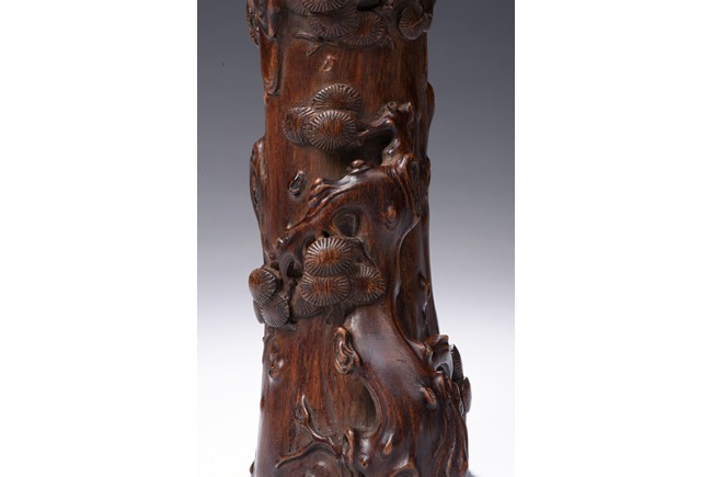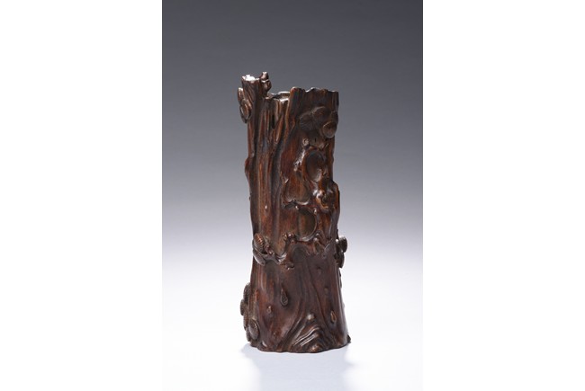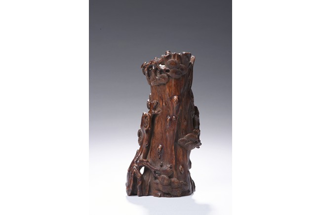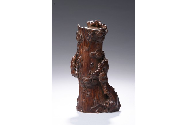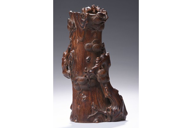 The slender vertical body naturalistically carved in the form of a gnarled pine tree trunk with subsidiary branches bearing clusters of pine needles, one issuing from the base before splitting on each side of the trunk, the other growing down from the top, the base and lip with irregular concentric rings to indicate weathered growth-lines. Qing Dynasty period.