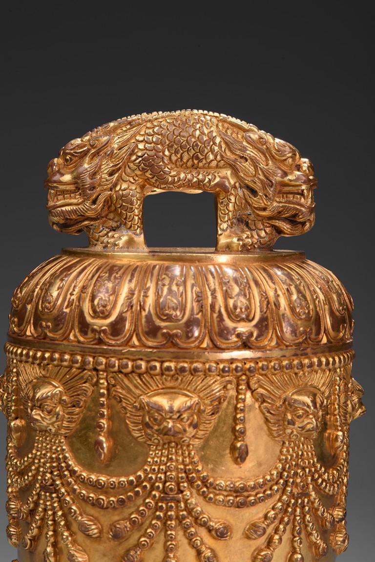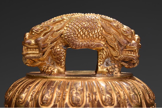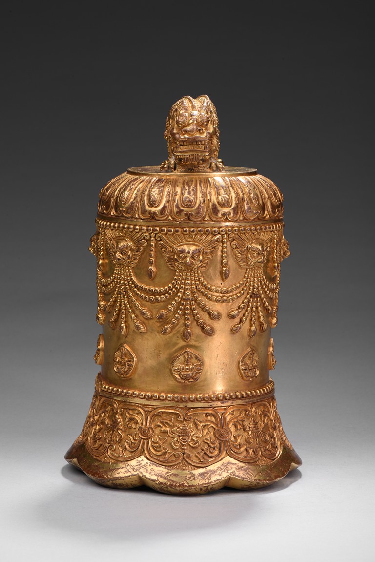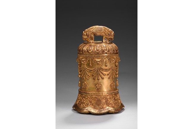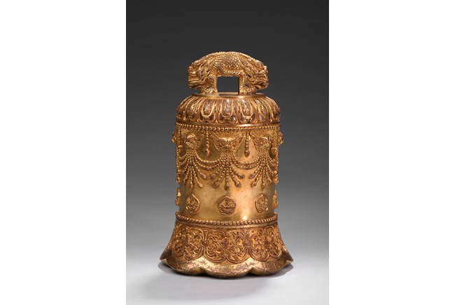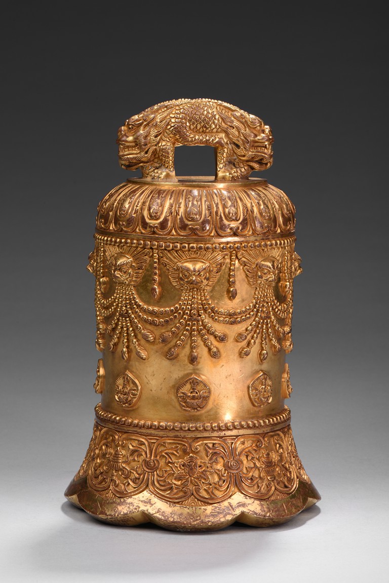 The bell solidly cast, suspended from a handle finely cast with a pair of intertwined crouching dragons, each ferocious beast powerfully cast, all encircled by lotus petals, the body slightly flaring at the bottom, decorated in low relief with a band of mythical beasts suspending decorations, above a six character 'QIANLONG' reign mark within a rectangular panel. Qing Dynasty period.