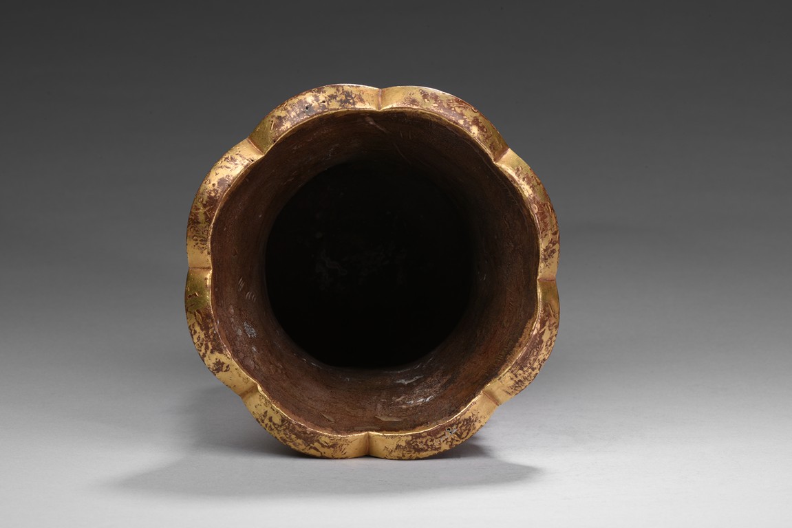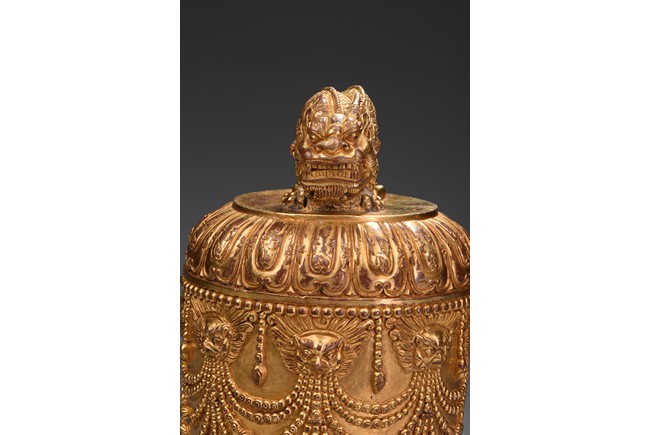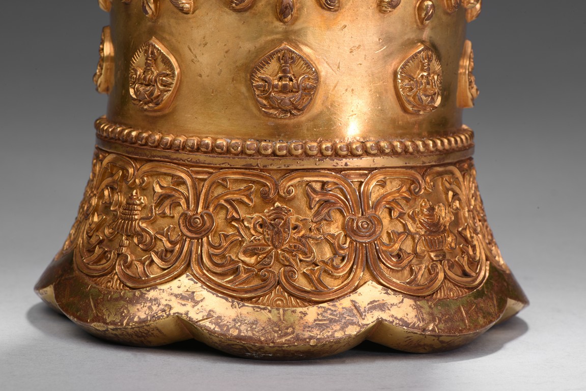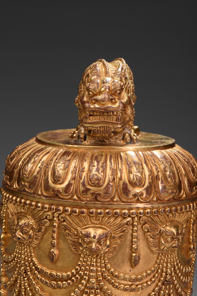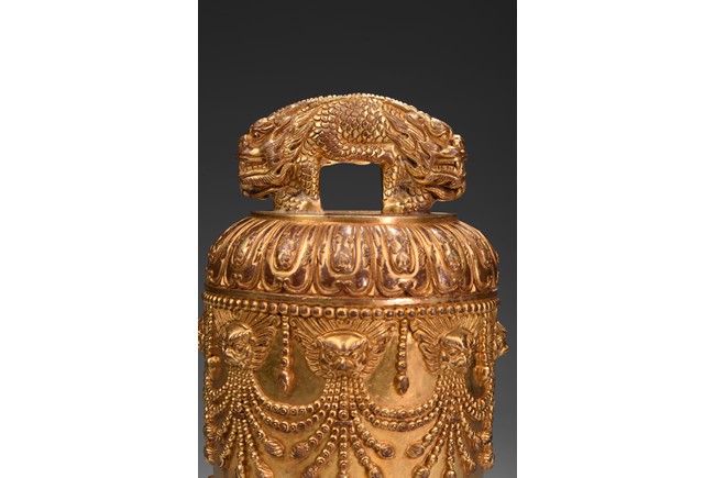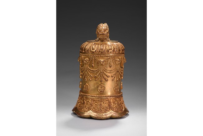 The bell solidly cast, suspended from a handle finely cast with a pair of intertwined crouching dragons, each ferocious beast powerfully cast, all encircled by lotus petals, the body slightly flaring at the bottom, decorated in low relief with a band of mythical beasts suspending decorations, above a six character 'QIANLONG' reign mark within a rectangular panel. Qing Dynasty period.