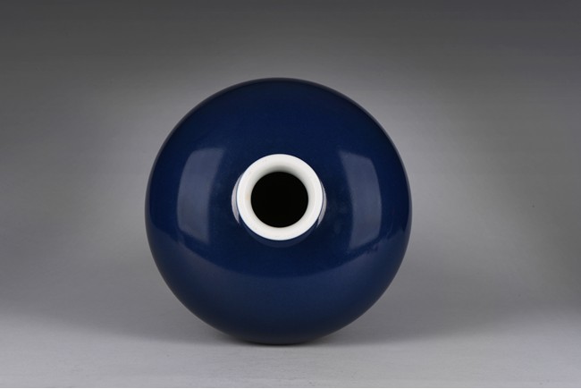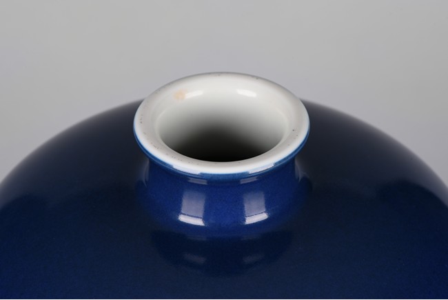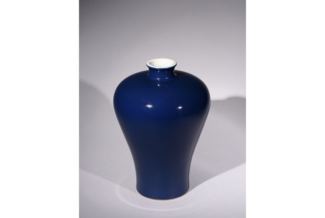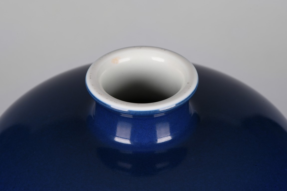 "Covered in brilliant cobalt-blue and stopping neatly above rim, the meiping vase has a high and wide rounded shoulder, elegantly tapering to slightly splayed feet, the interior and bottom glazed in white, and bottom bears six character ""DAQING QIANLONG NIANZHI"" mark. Qing Dynasty period."