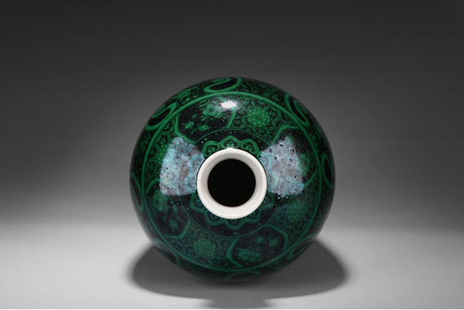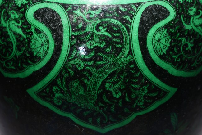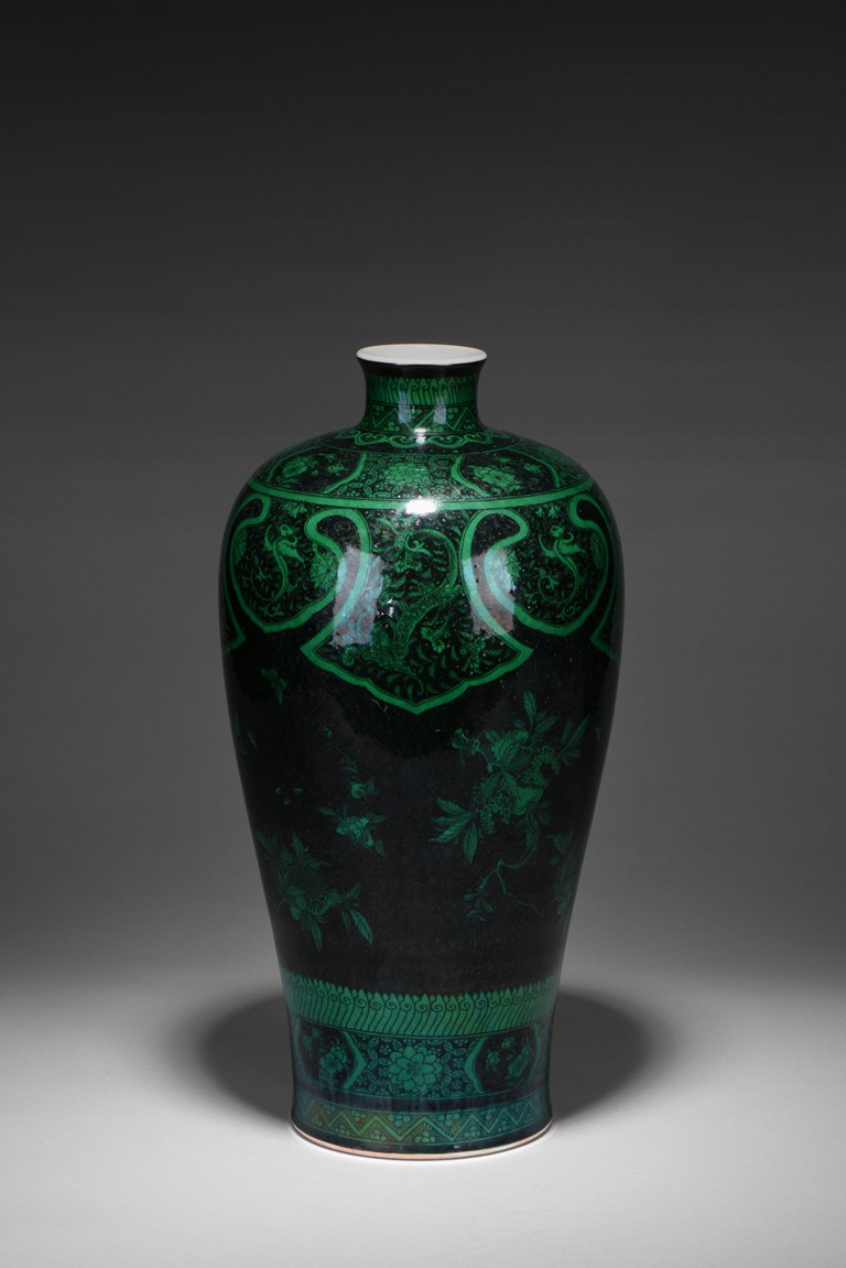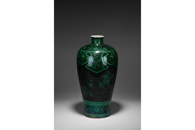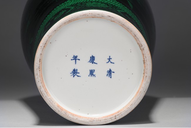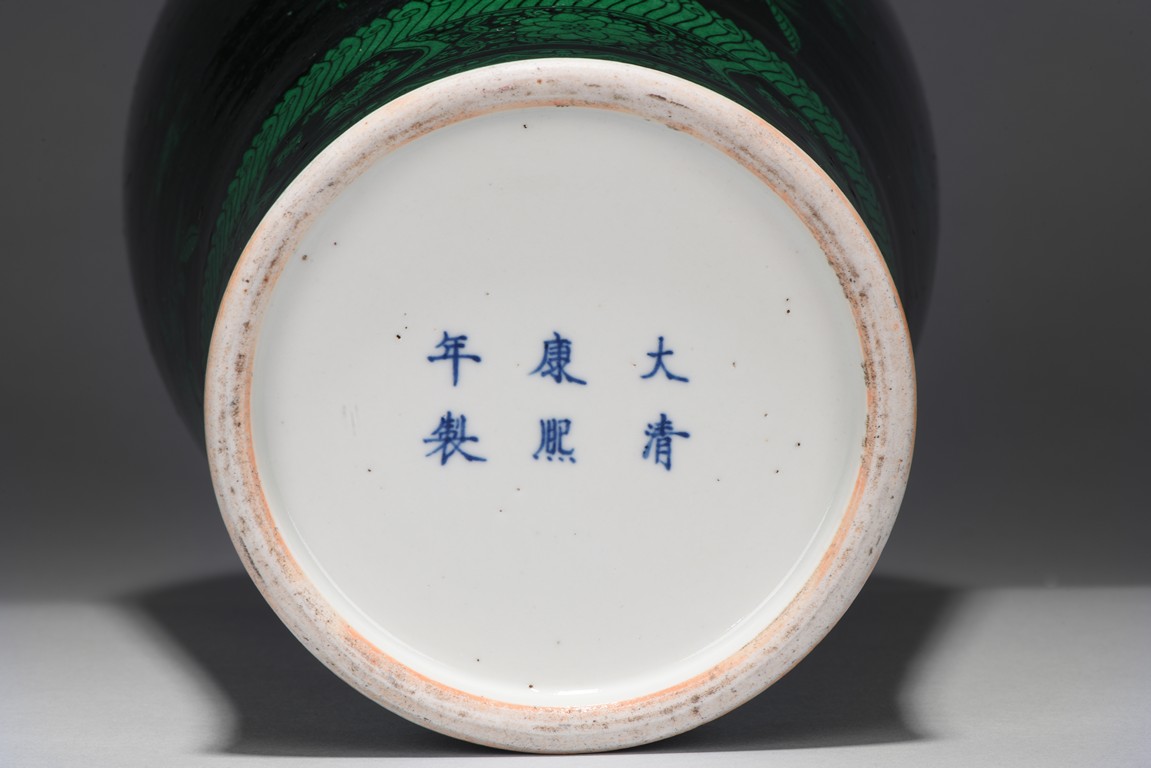 Potted with a broad shoulder and waisted neck, the vase is finely decorated in green with leafy fruit branches and sprays, flanked by alternating ruyi-shaped head band enclosing chilong and floral pattern above, and geometric bands around the base, all reserved on background. The bottom bears six character 'KANGXI' mark. Qing Dynasty period.