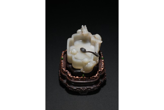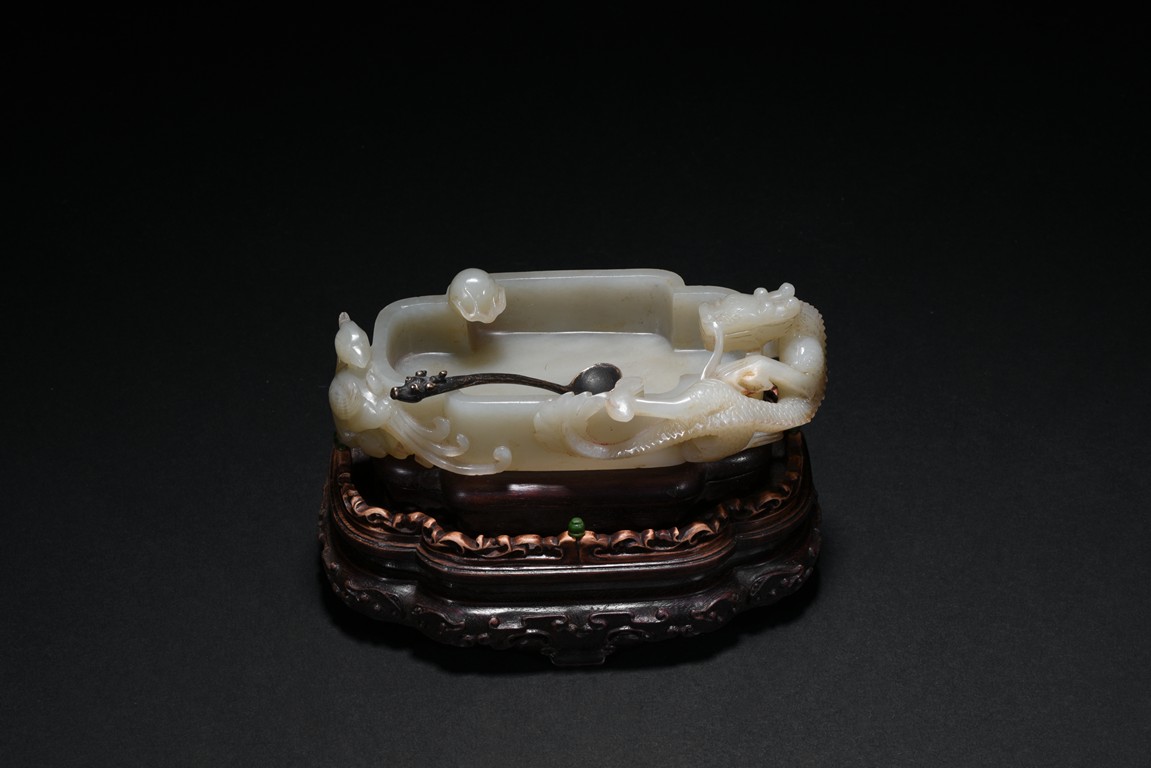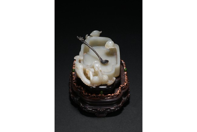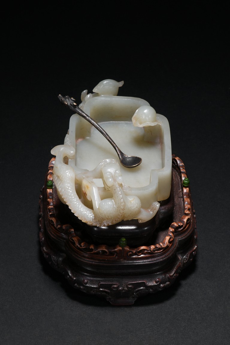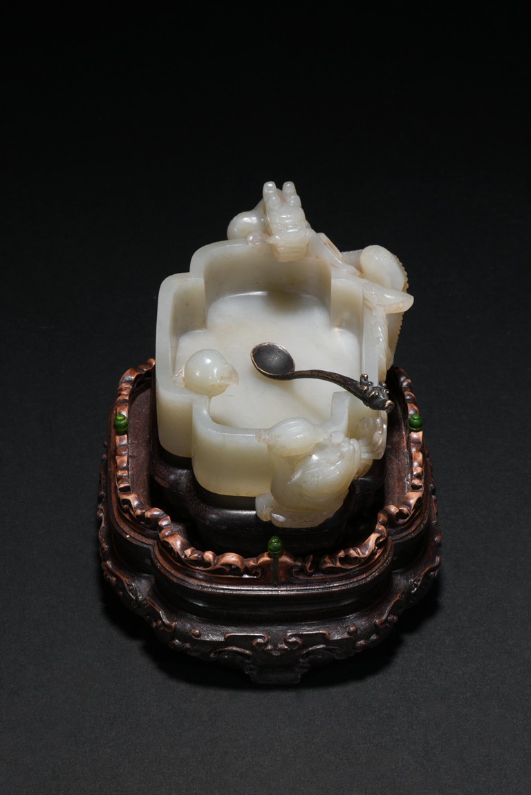 Of quatre lobed form, the white stone worked with straight tapering sides rising from a countersunk base to a straight-cut rim, the interior decorated a rounded ball with flame close to one side of the rim and with a small copper spoon in the center, finely carved to two confronting sides with openwork handles in the form of a climbing chilong with bifurcated tails and muscular limbs and a small standing phoenix with long scrolling tail, each resting its head on the mouth rim, the stone of a white tone, with fitted zitan stand and spoon. Qing Dynasty period.