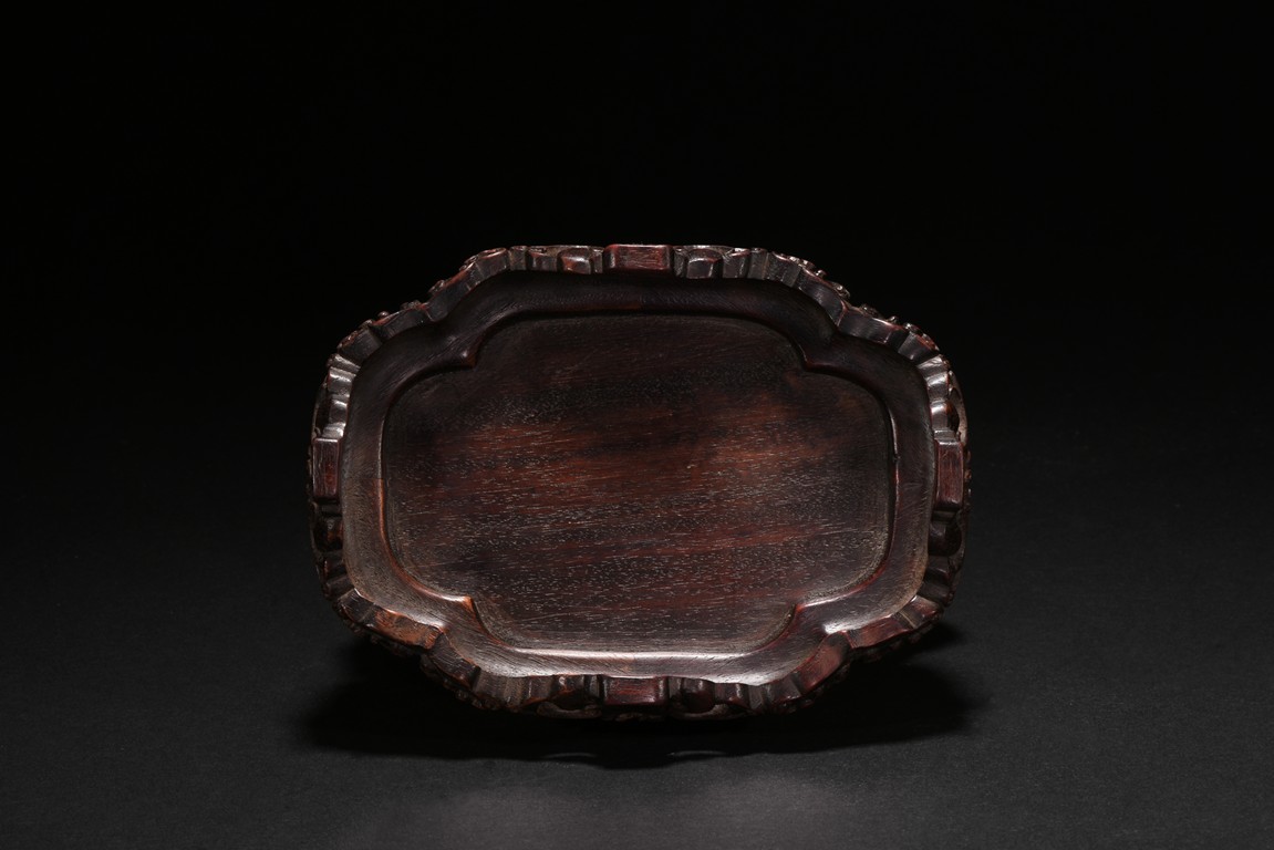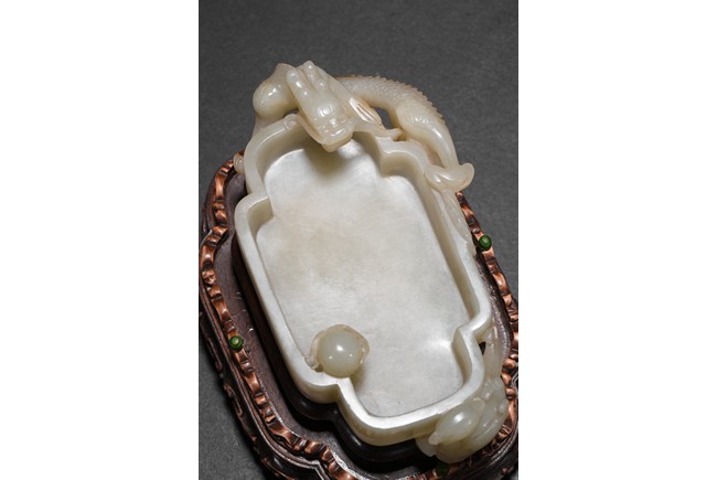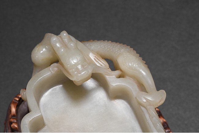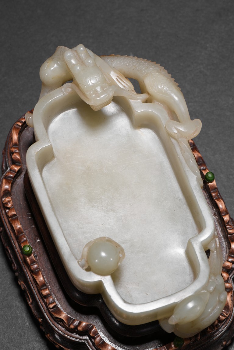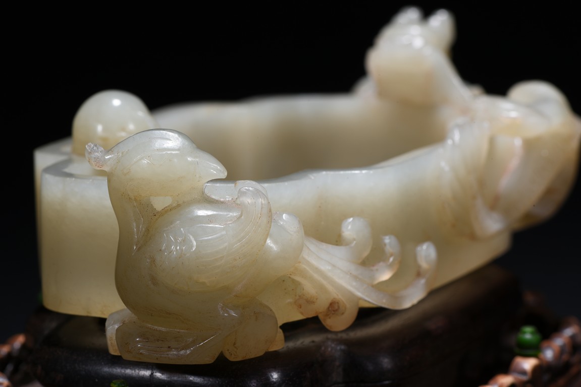 Of quatre lobed form, the white stone worked with straight tapering sides rising from a countersunk base to a straight-cut rim, the interior decorated a rounded ball with flame close to one side of the rim and with a small copper spoon in the center, finely carved to two confronting sides with openwork handles in the form of a climbing chilong with bifurcated tails and muscular limbs and a small standing phoenix with long scrolling tail, each resting its head on the mouth rim, the stone of a white tone, with fitted zitan stand and spoon. Qing Dynasty period.