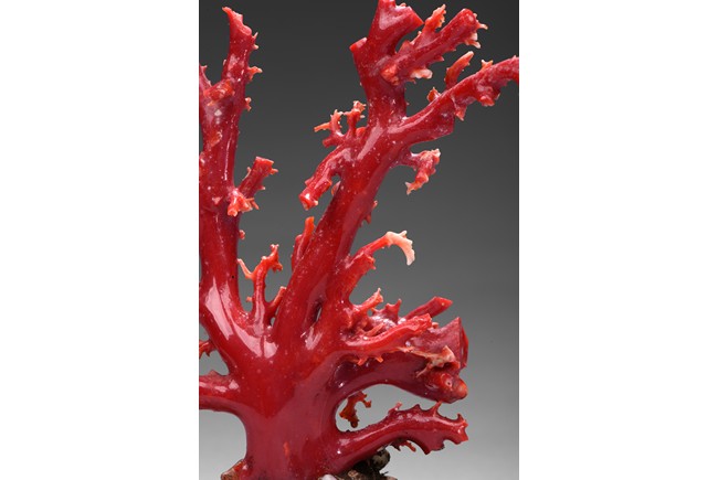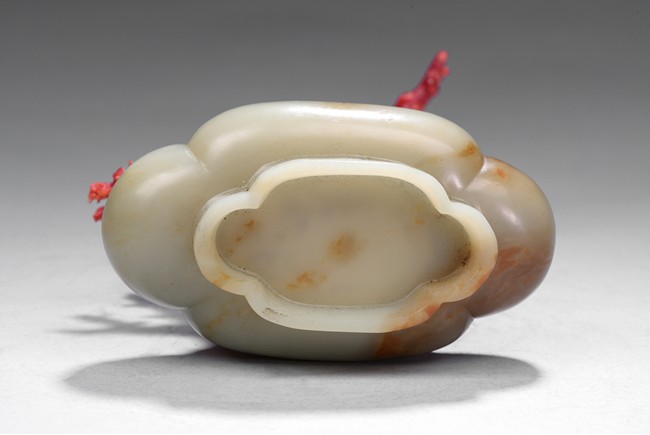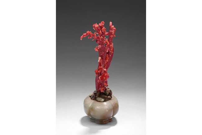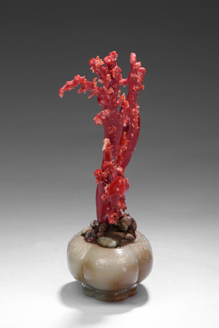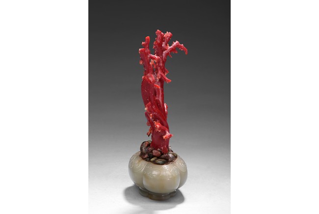 The white jade planter is of four lobed form, the exterior incised with a band of taotie mask, planted with natural Aka red coral of vivid red tone. The stone is of smooth polished white tone with russet inclusions. Republic period.