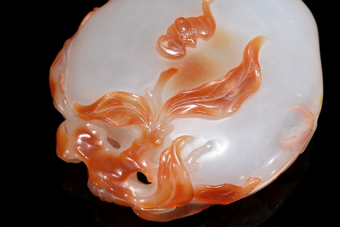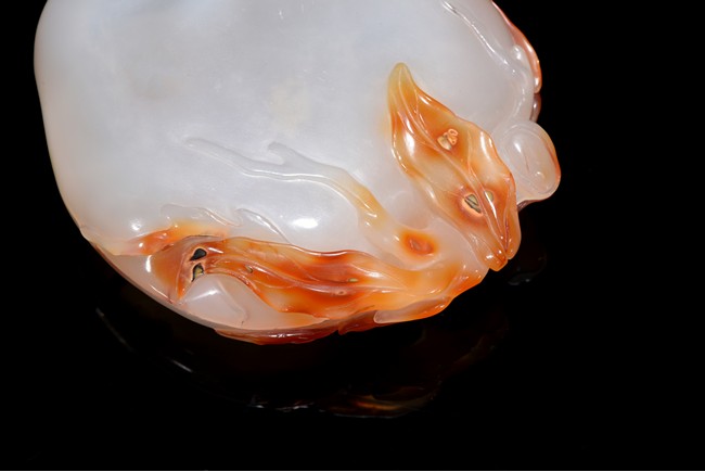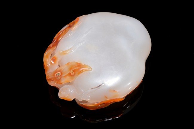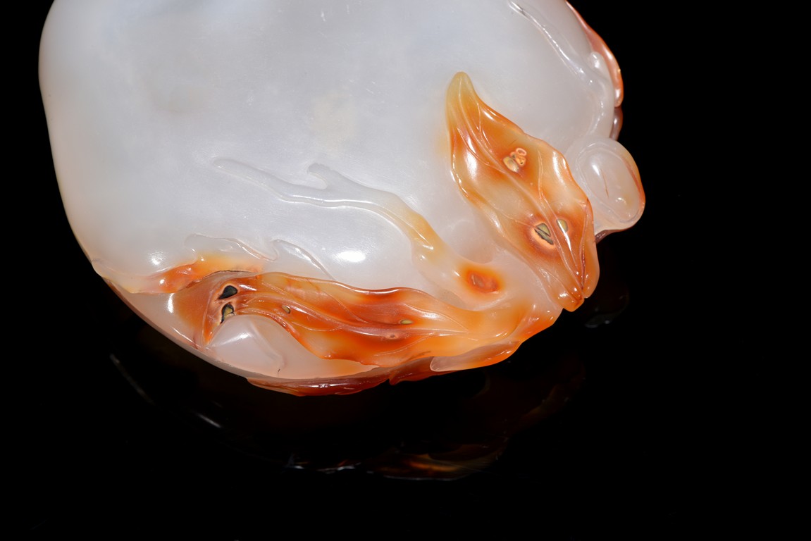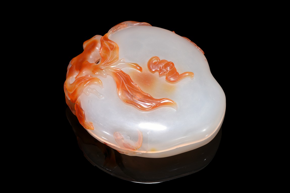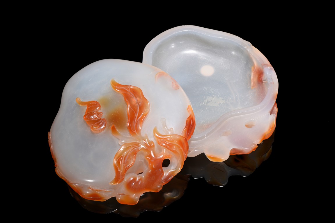 Naturalistically worked as a flattened peach with a leafy gnarled stem that curls up and around the fruit, the high-relief pierced stems cleverly worked to link the box and cover together, the cover surmounted with a bat's resting in the center. Qing Dynasty period.