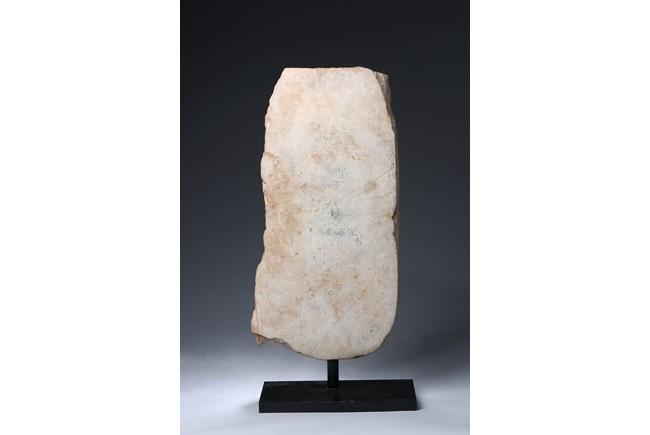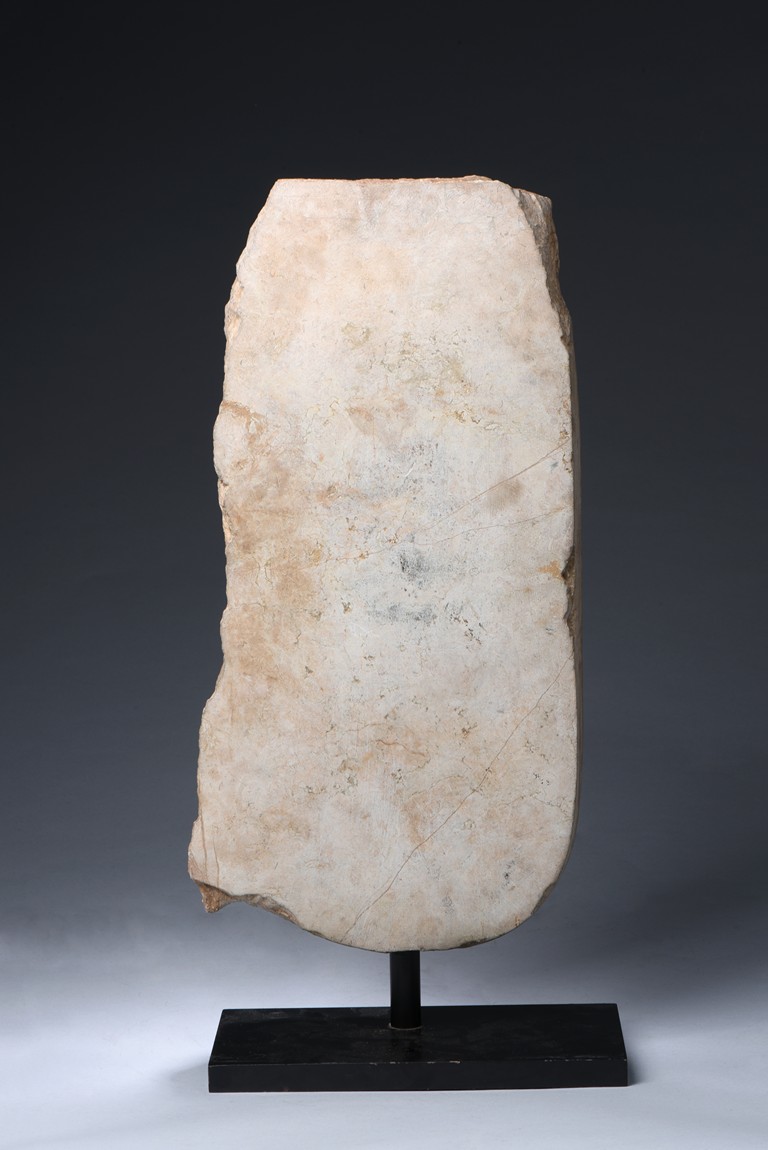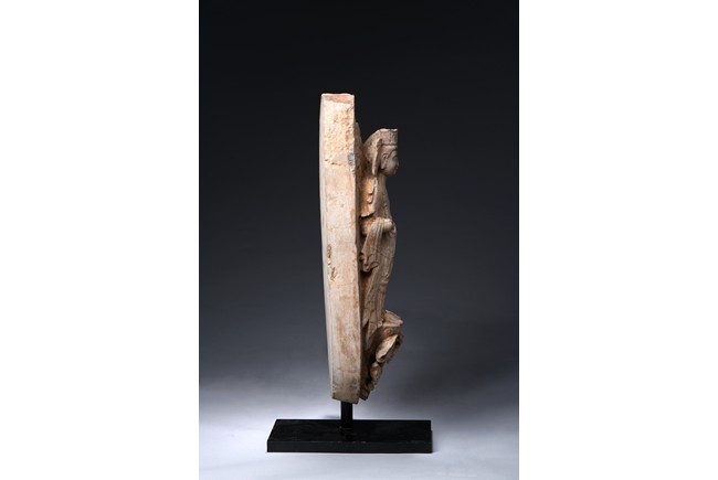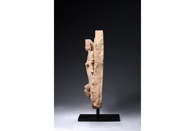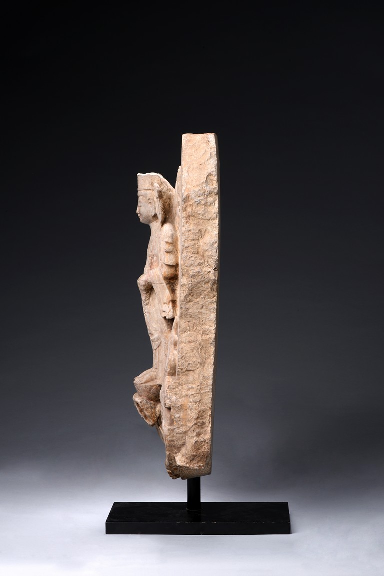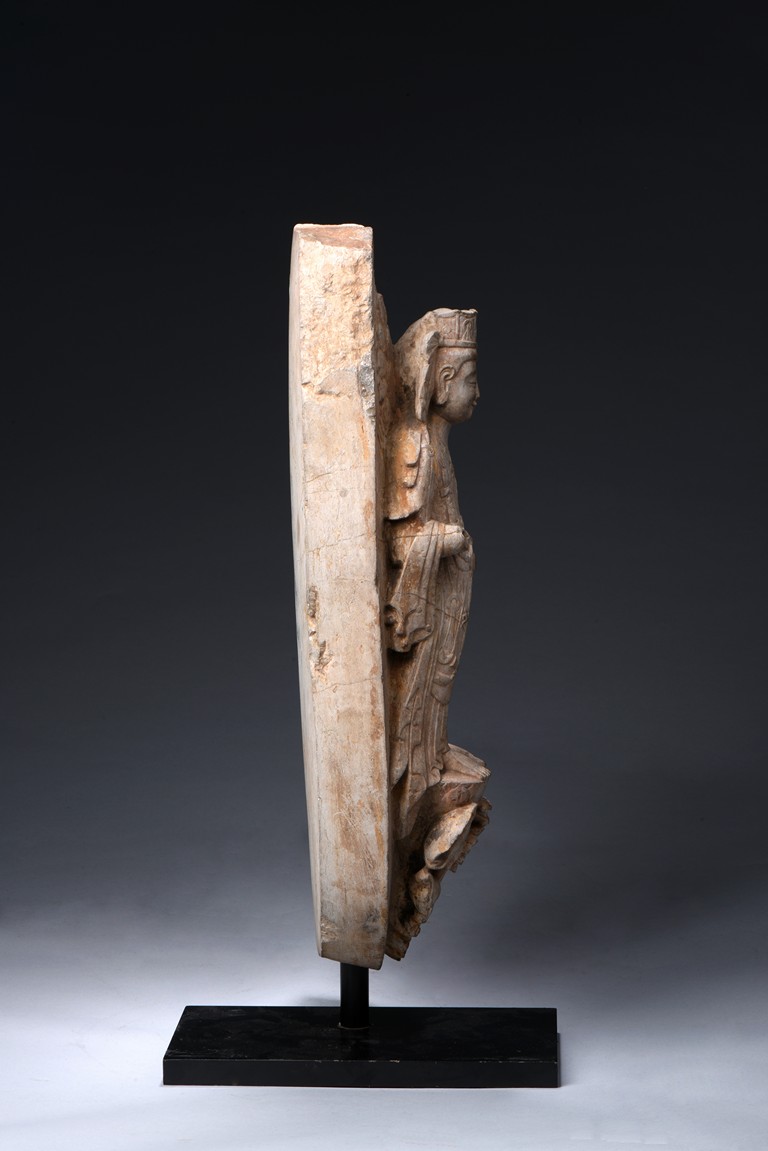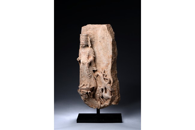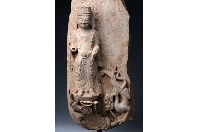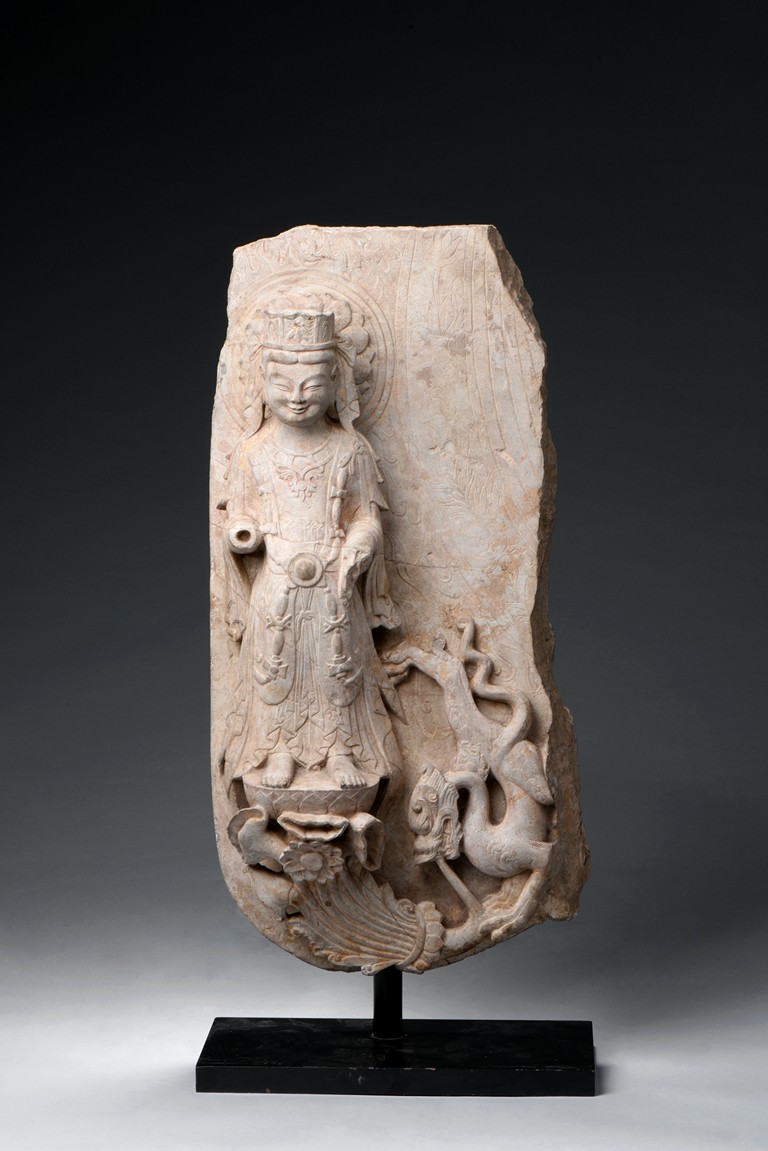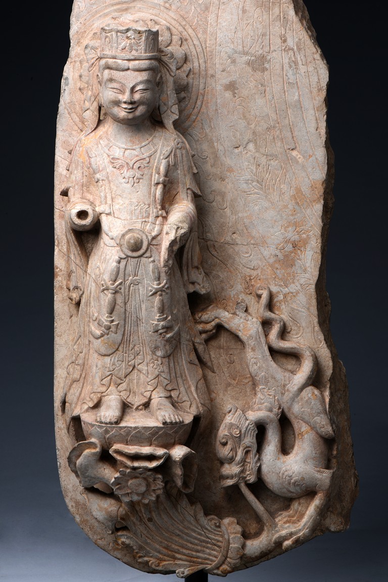 The stele depicting a bodhisattva standing upon a lotus stand, wearing long and diaphanous robes and tied into circular ornament on the stomach. His face with benevolent expression, wearing elaborate crown and backed by a circular mandorla. To his bottom left a carved mythical beast with hind legs and tail pointing upward, emanating a lotus flower pedestal from its mouth and supporting the bodhisattva. Sui/Tang Dynasty period.