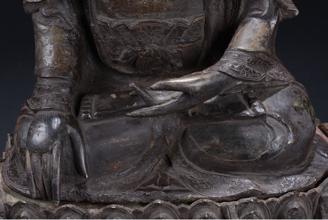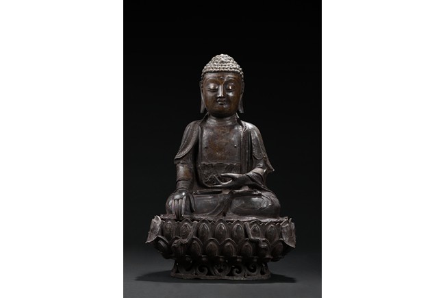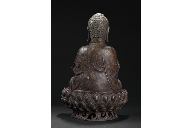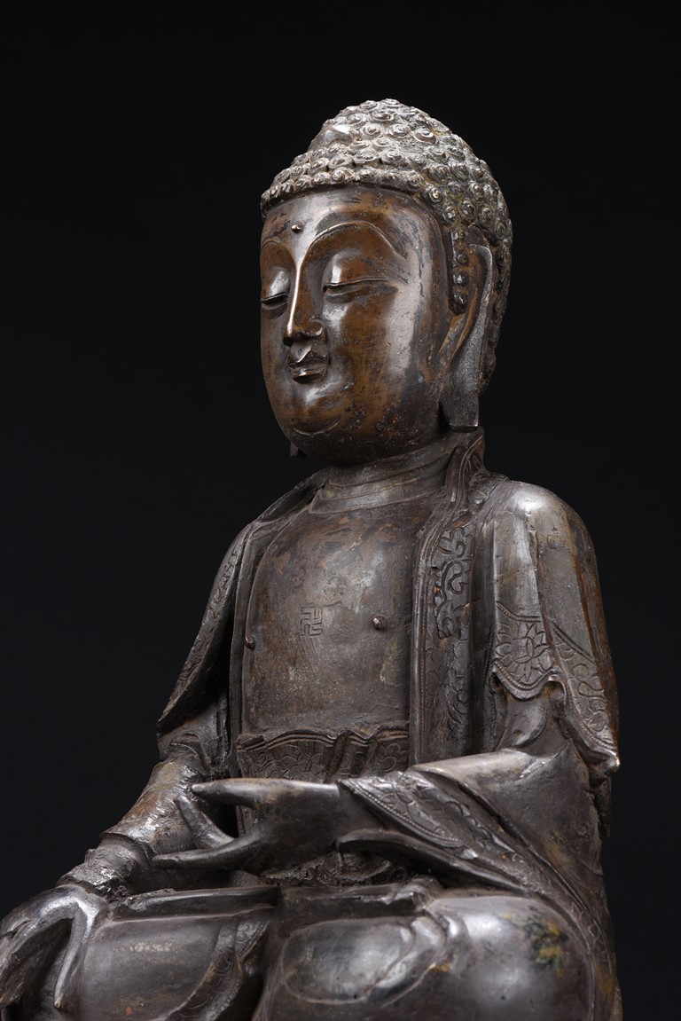 Heavily cast, the bodhisattva is shown seated upon a lotus petal throne, his hands in bhumisparsha mudra, wearing long robe incised on borders with floral scrolls, opened at the chest to reveal an incised wan character, the face with a serene expression, flanked by two pendulous ears, his coiffure of small curls covering his head. Ming Dynasty period.