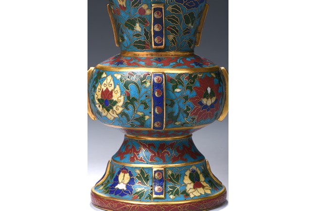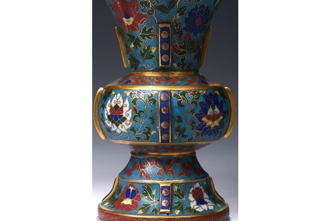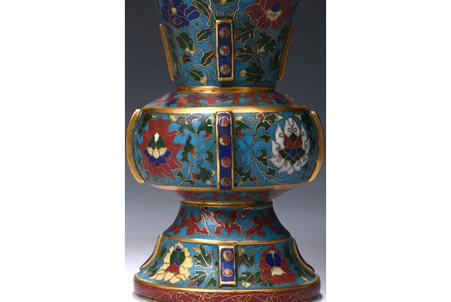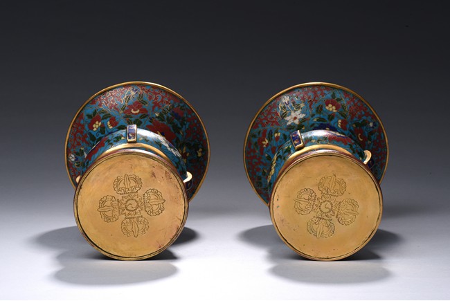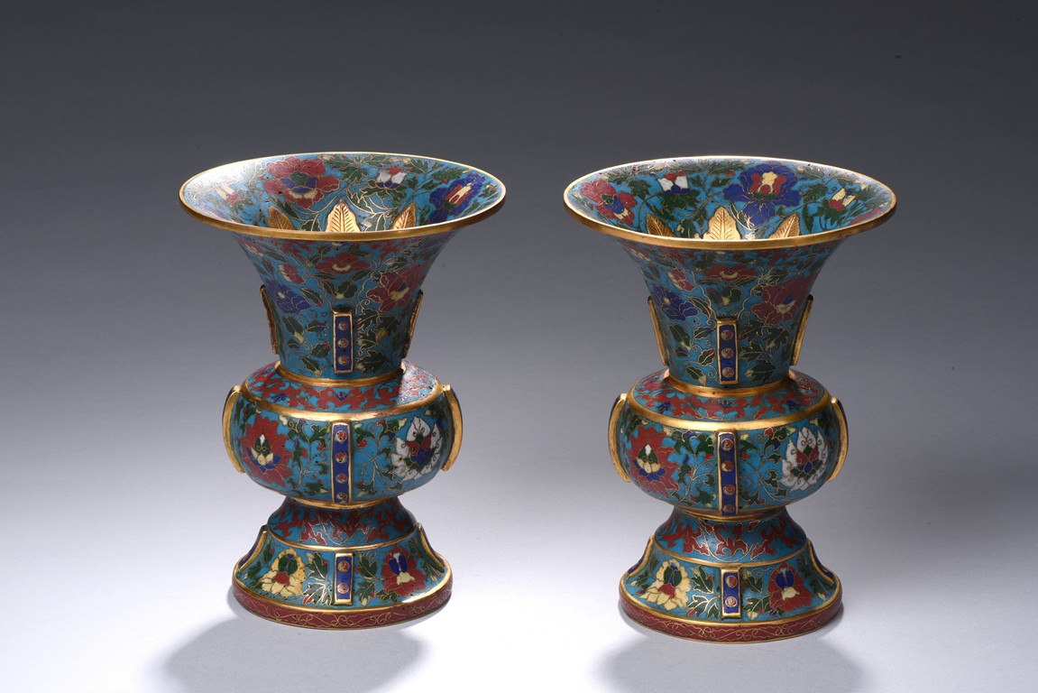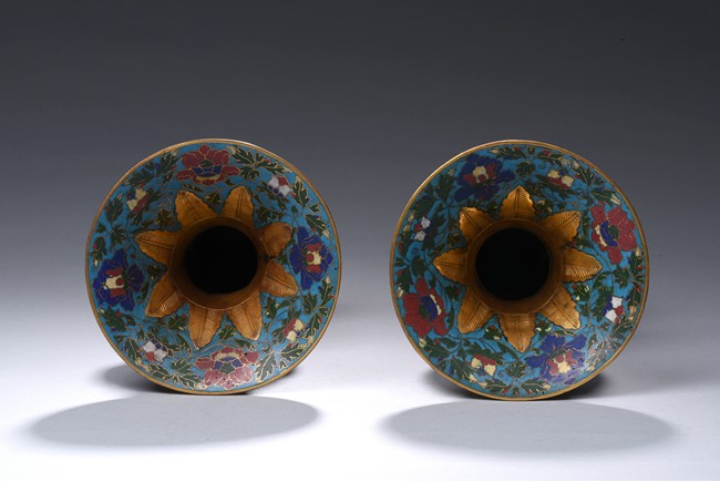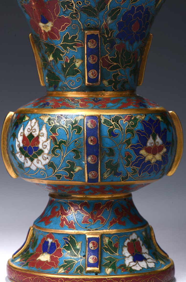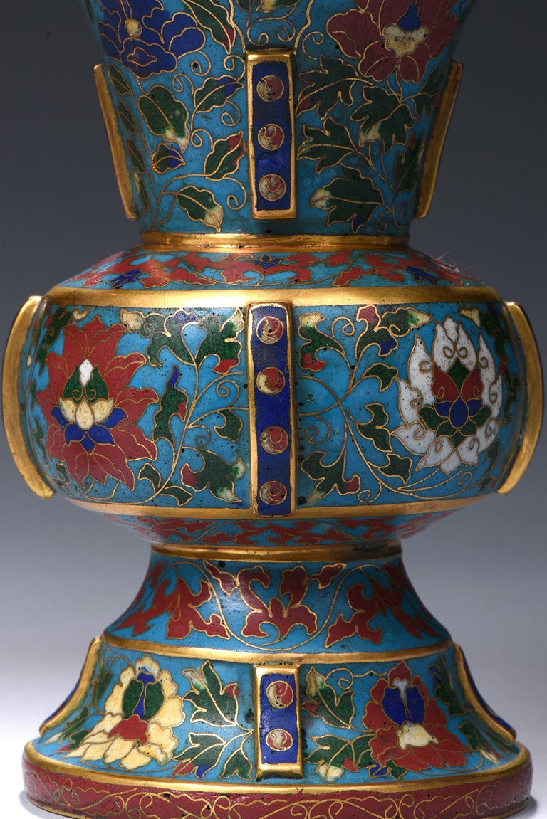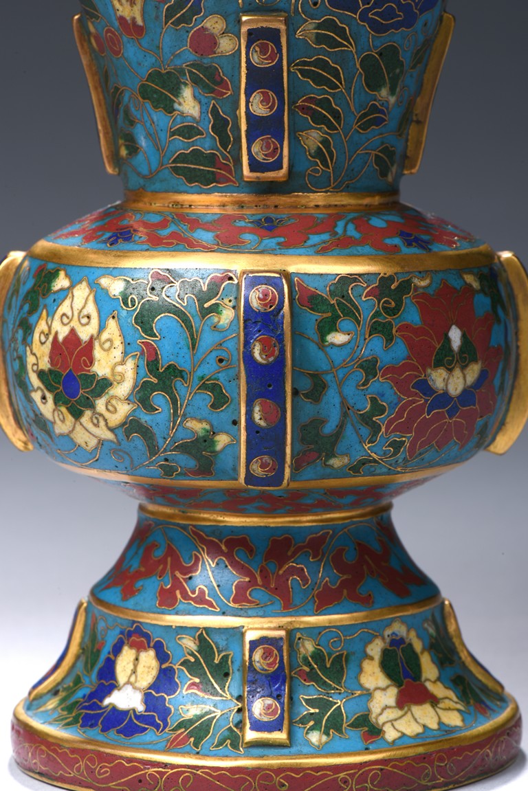 Each with a trumpet neck resting above a large central bulb and below it with a bell-shaped foot, the four sides applied with raised rectangular pattern enclosed with red dots, brightly enamelled on the exterior with large lotus blooms wreathed in scrolling foliage issuing curling leaves, all against a turquoise ground. Qing Dynasty period.