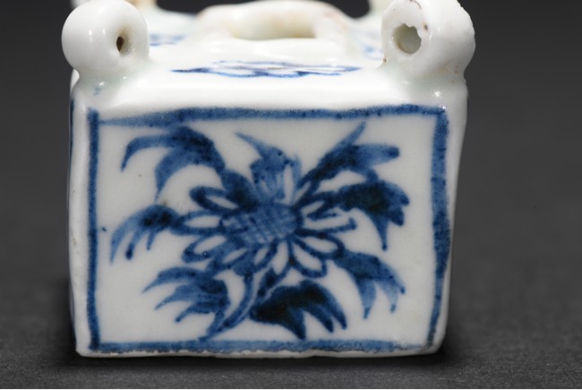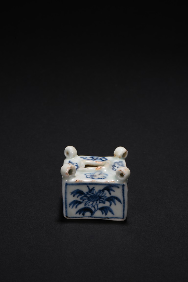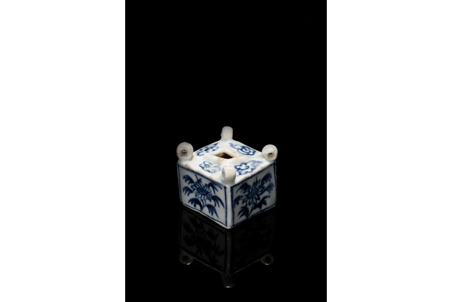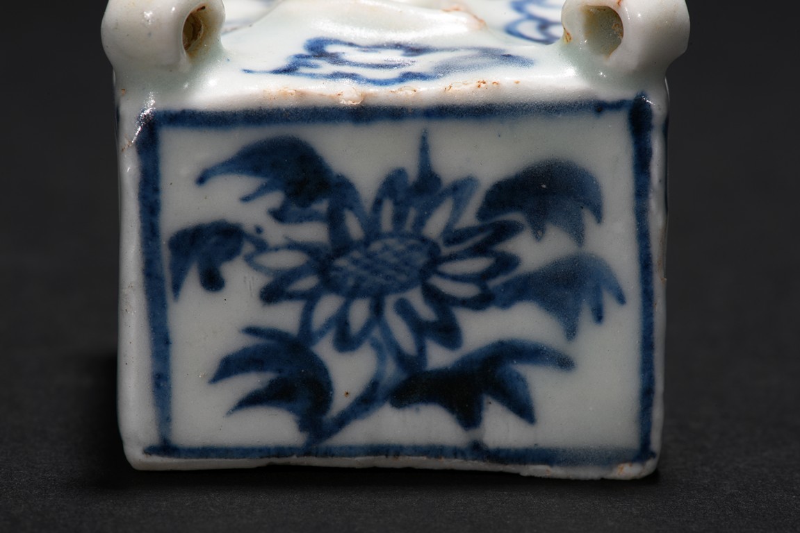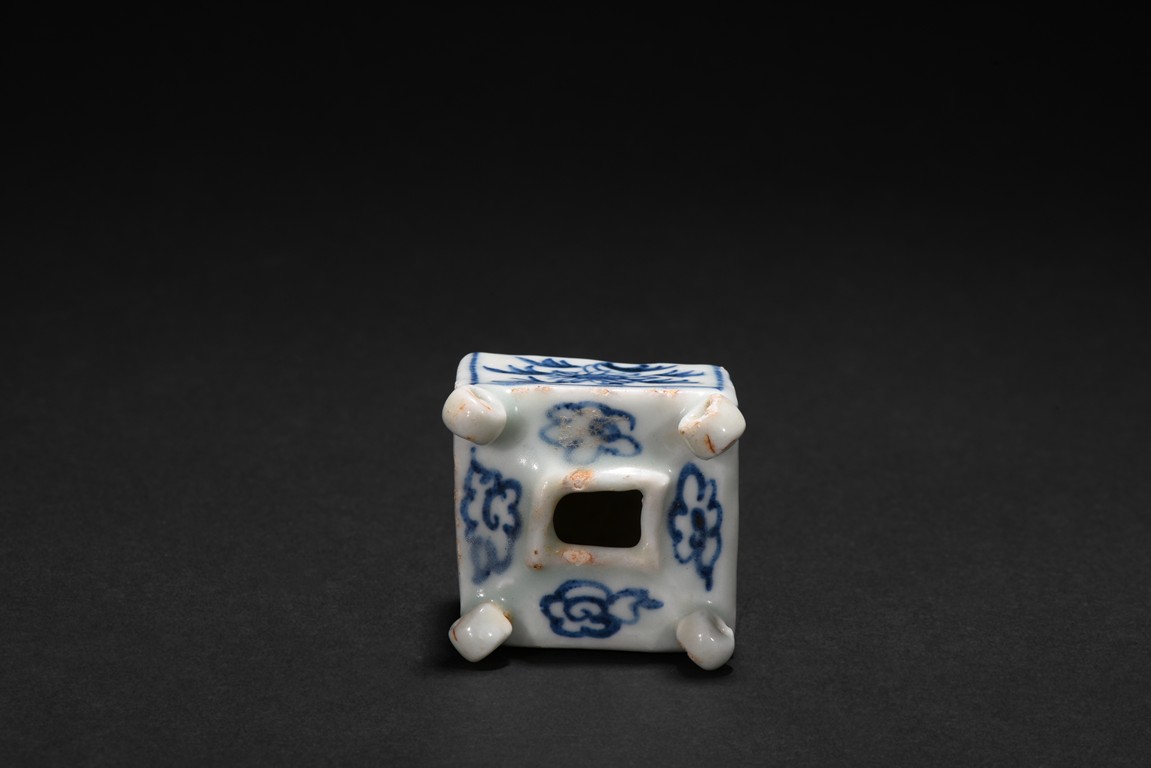 Of square cube form, each of the four sides decorated with a sunflower surrounded by bunches of leaves within a rectangular pattern in blue glaze, each of the four corner at the top surmounted by a small uprighting circle, the center with a rectangular form hole surrounded by four flowers pattern at each four sides. Early Ming Dynasty period.