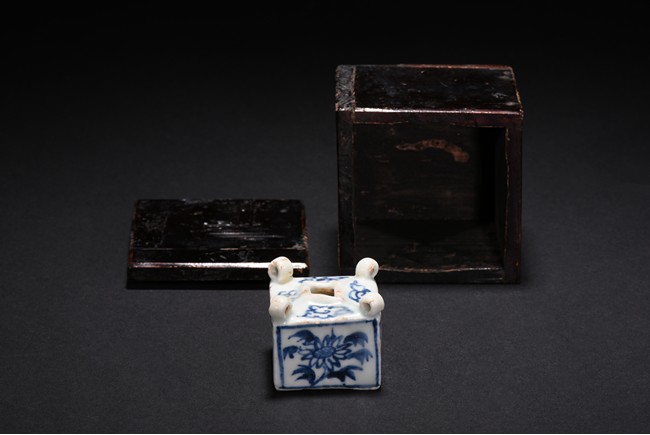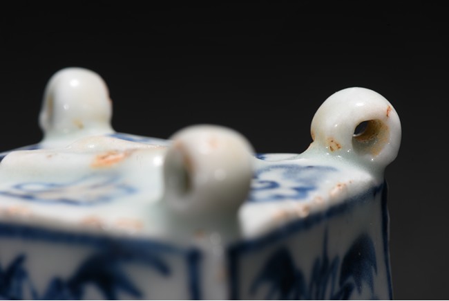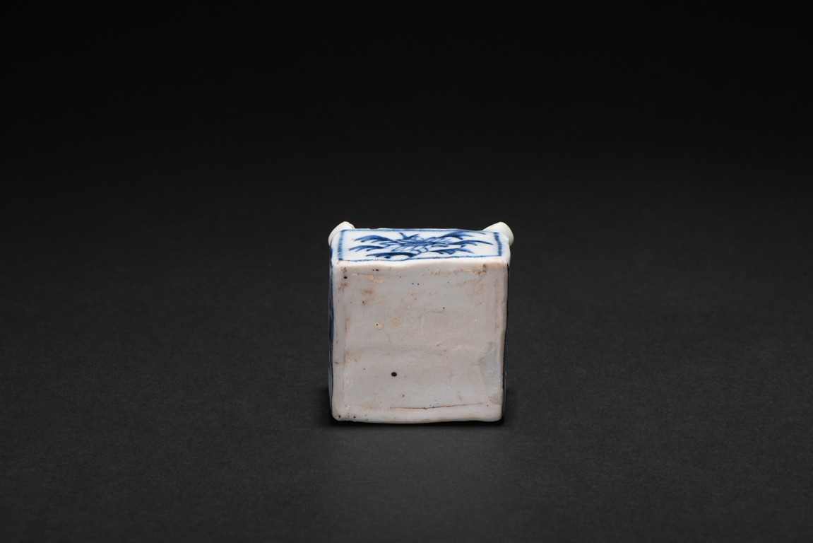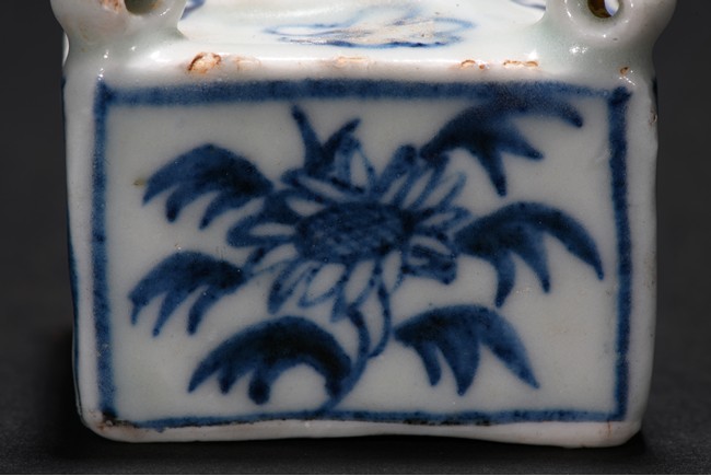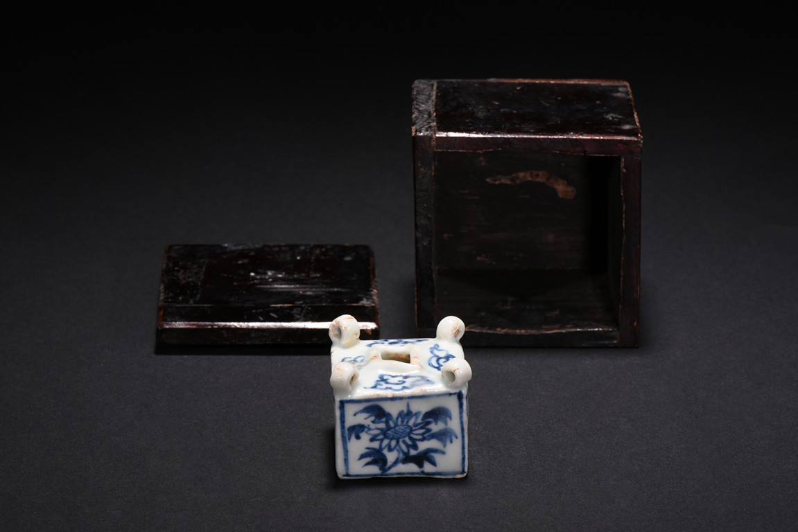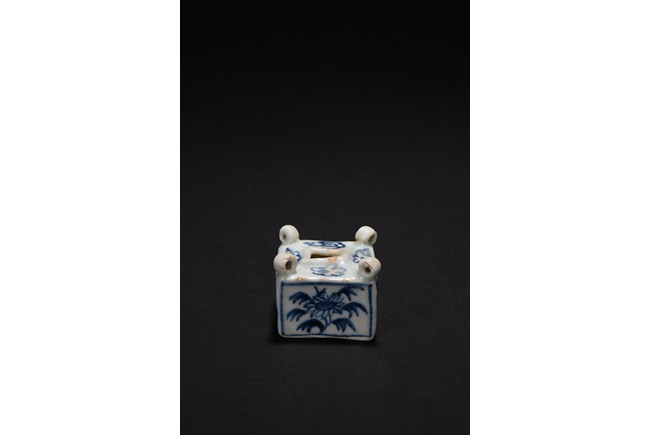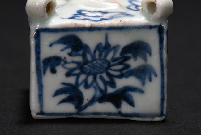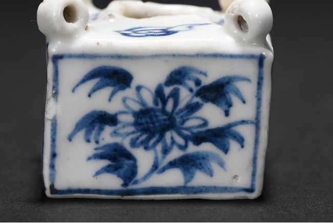Of square cube form, each of the four sides decorated with a sunflower surrounded by bunches of leaves within a rectangular pattern in blue glaze, each of the four corner at the top surmounted by a small uprighting circle, the center with a rectangular form hole surrounded by four flowers pattern at each four sides. Early Ming Dynasty period.