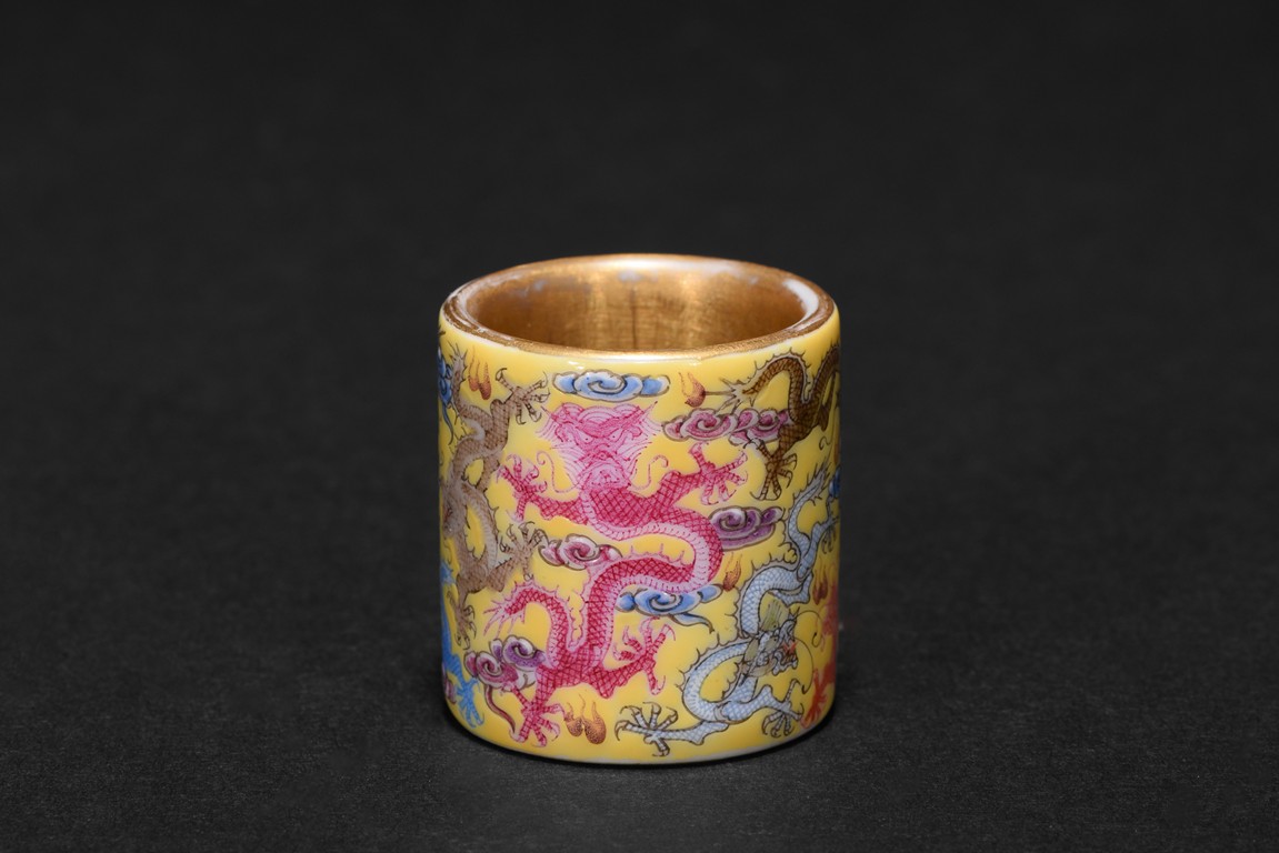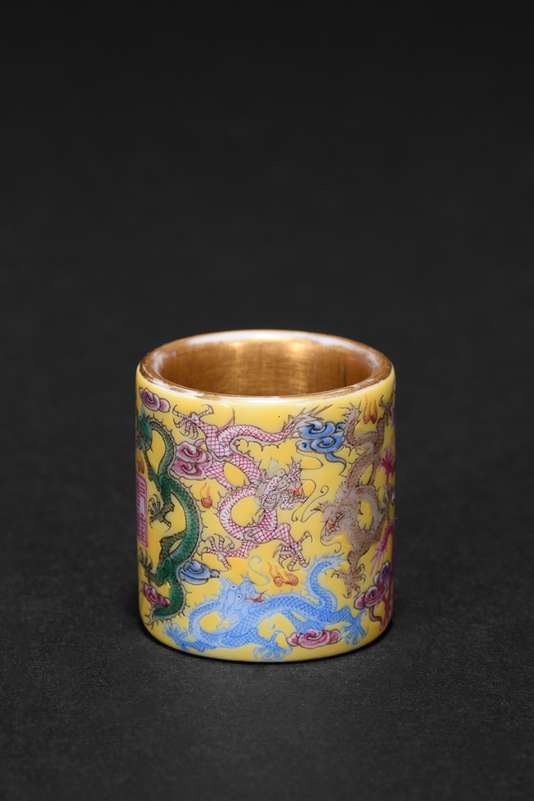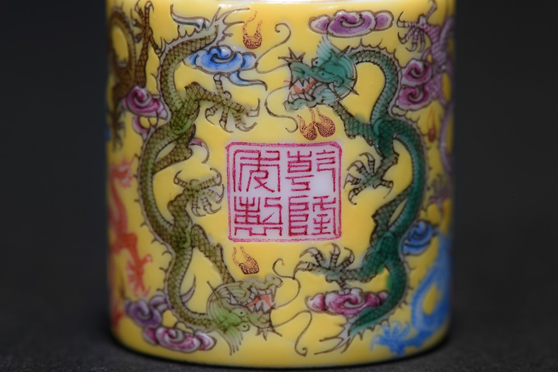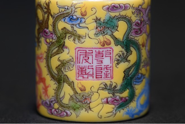 The hollowed cylindrical body carved around the exterior with colored five-clawed dragons writhing amidst multi-color scrolled clouds against a rich yellow ground, in the center of the exterior body with a four character 'QianLong' mark, the interior side covered with gilt tone. Qing Dynasty period.