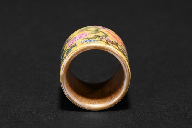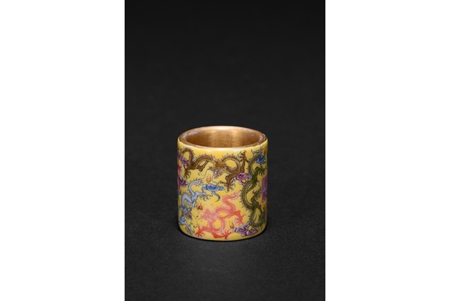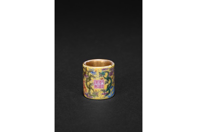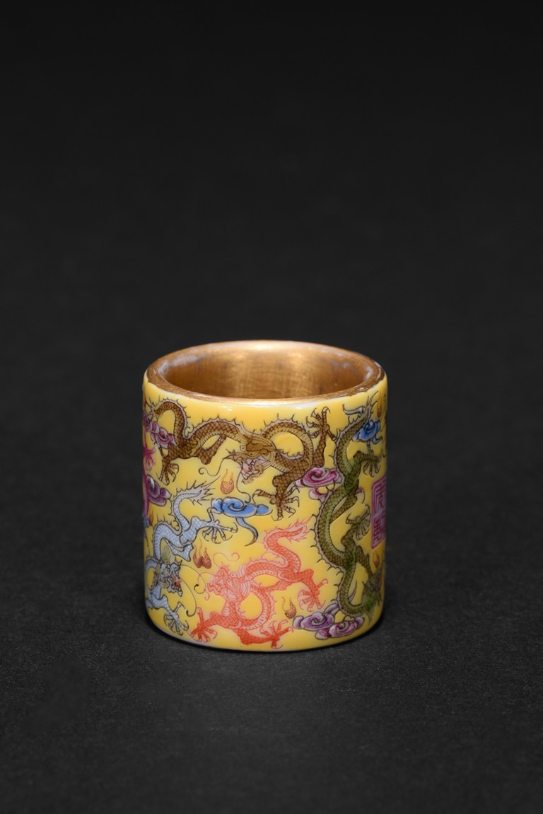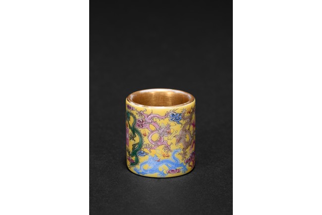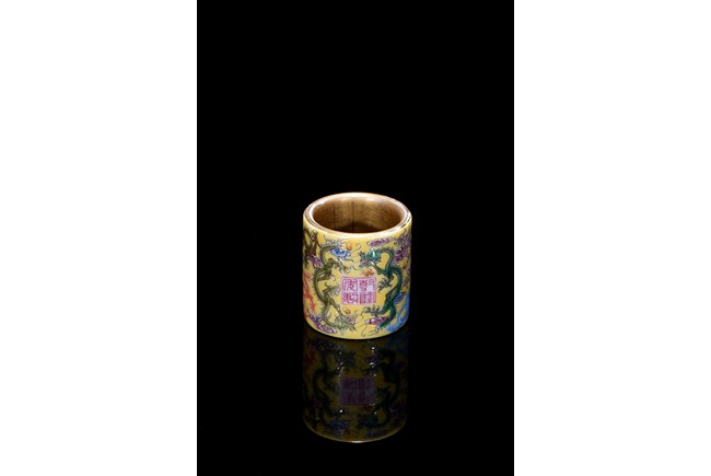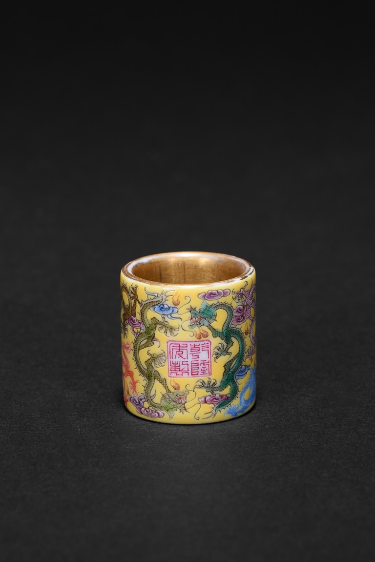 The hollowed cylindrical body carved around the exterior with colored five-clawed dragons writhing amidst multi-color scrolled clouds against a rich yellow ground, in the center of the exterior body with a four character 'QianLong' mark, the interior side covered with gilt tone. Qing Dynasty period.