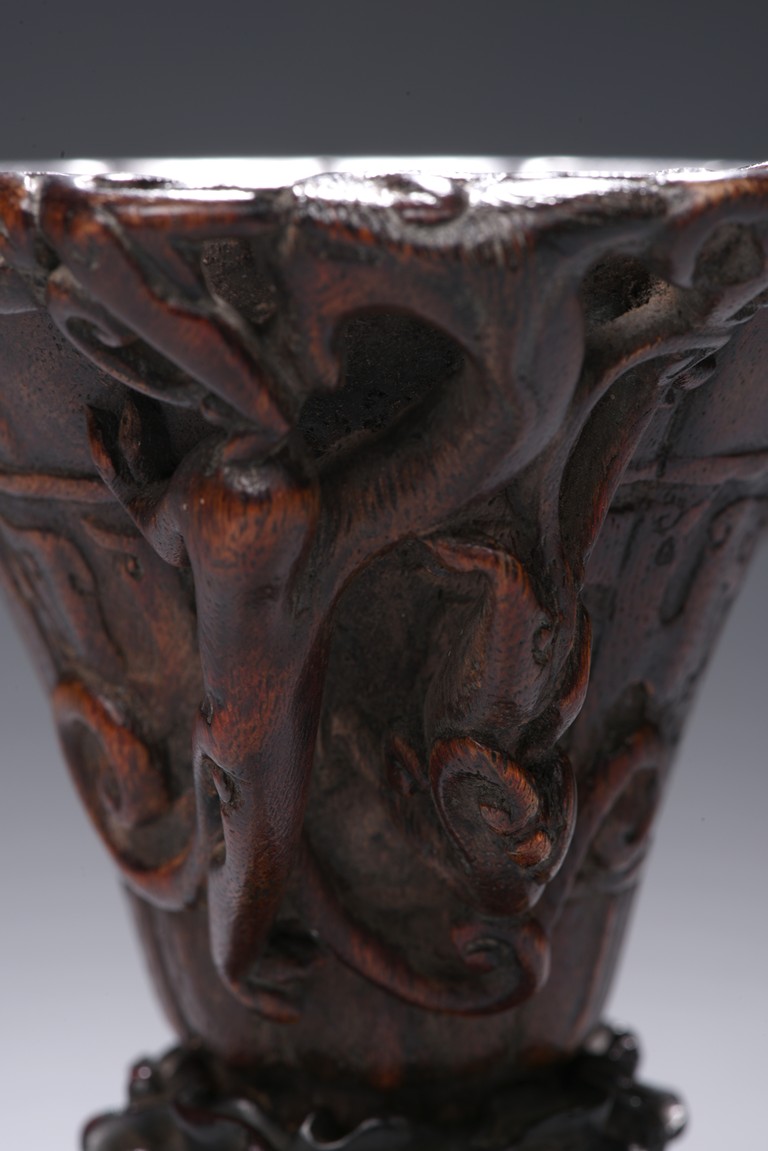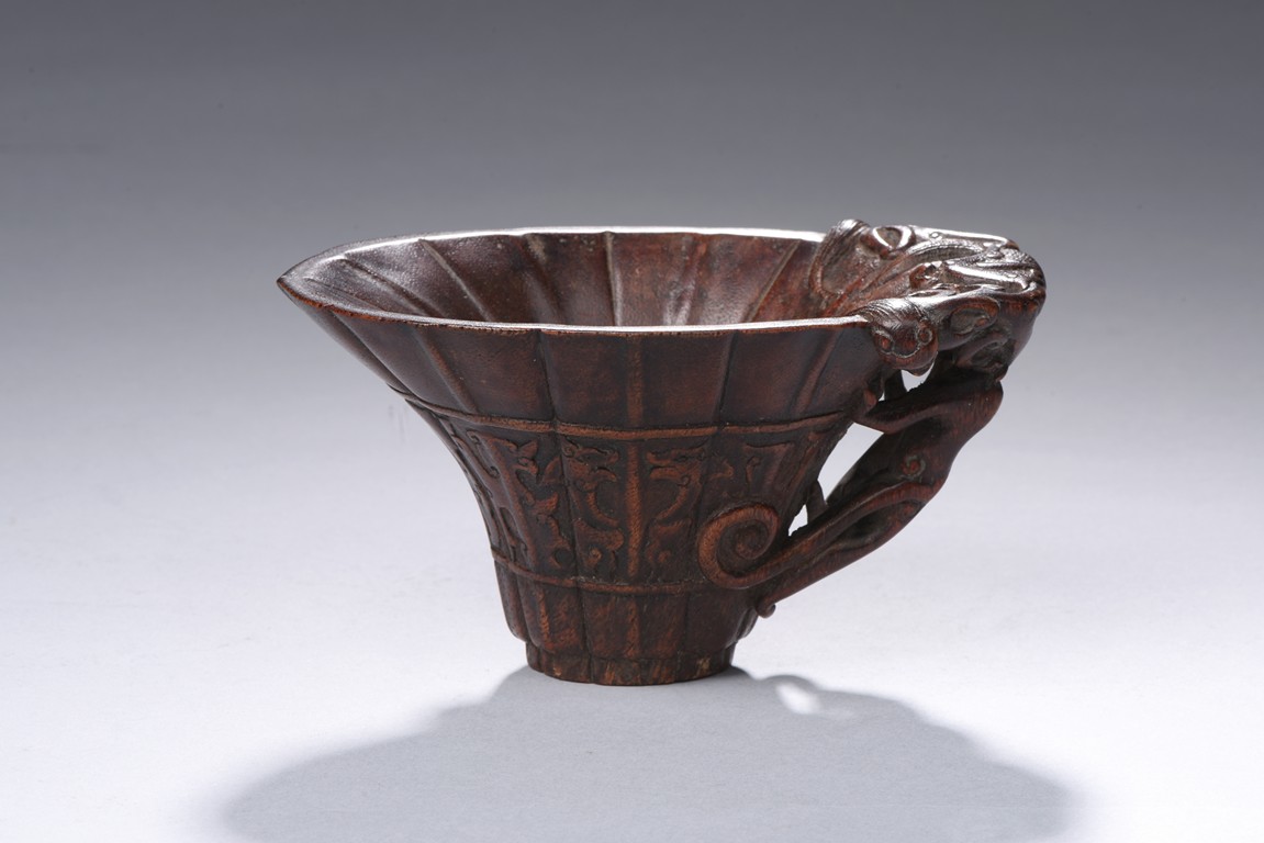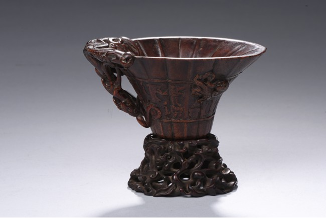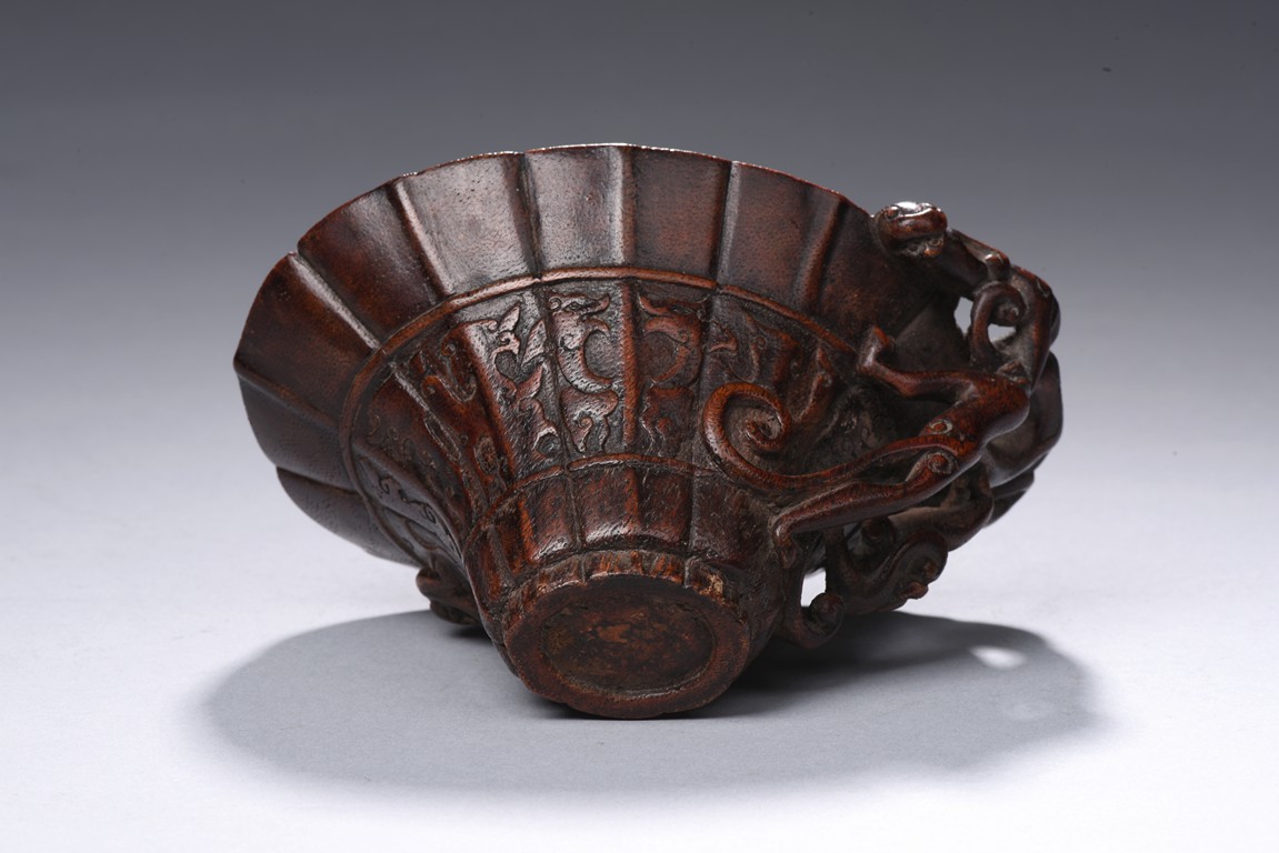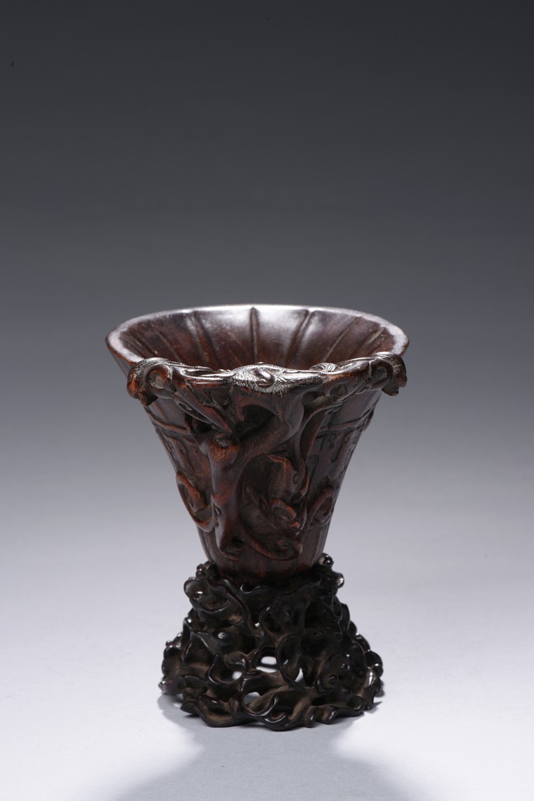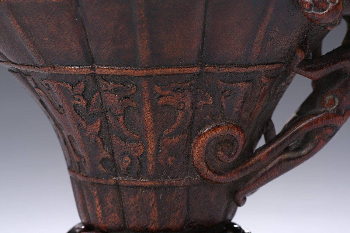 The central section resting on a slightly tapering foot raised to a wide flaring lotus leaf with a lobed rim, carved in low relief around the exterior middle section with a border enclosing archaistic kui dragons pattern, one side carved an openwork with climbing chilong forming the handle, the cup of an attractive warm reddish-brown tone, with fitted wood stand. Qing Dynasty period.