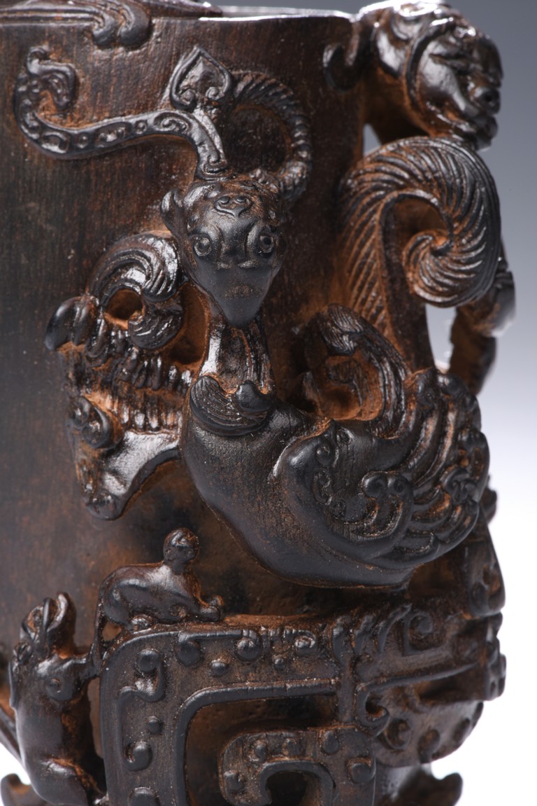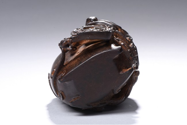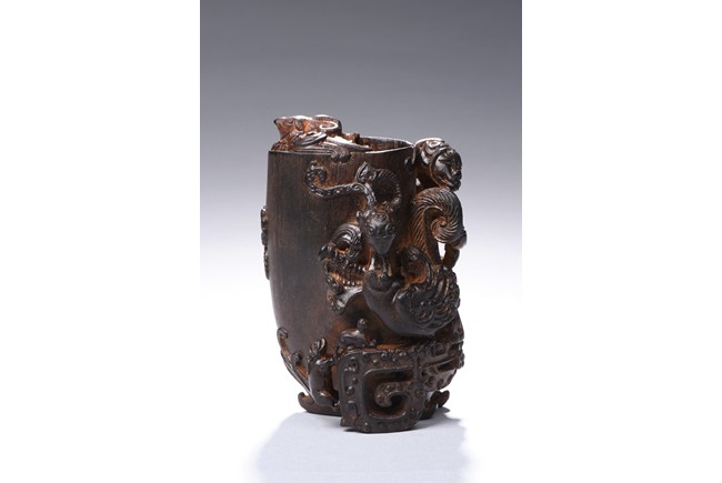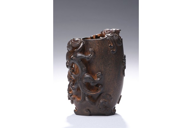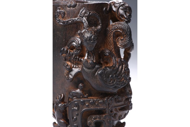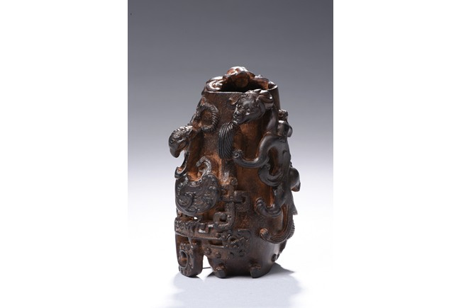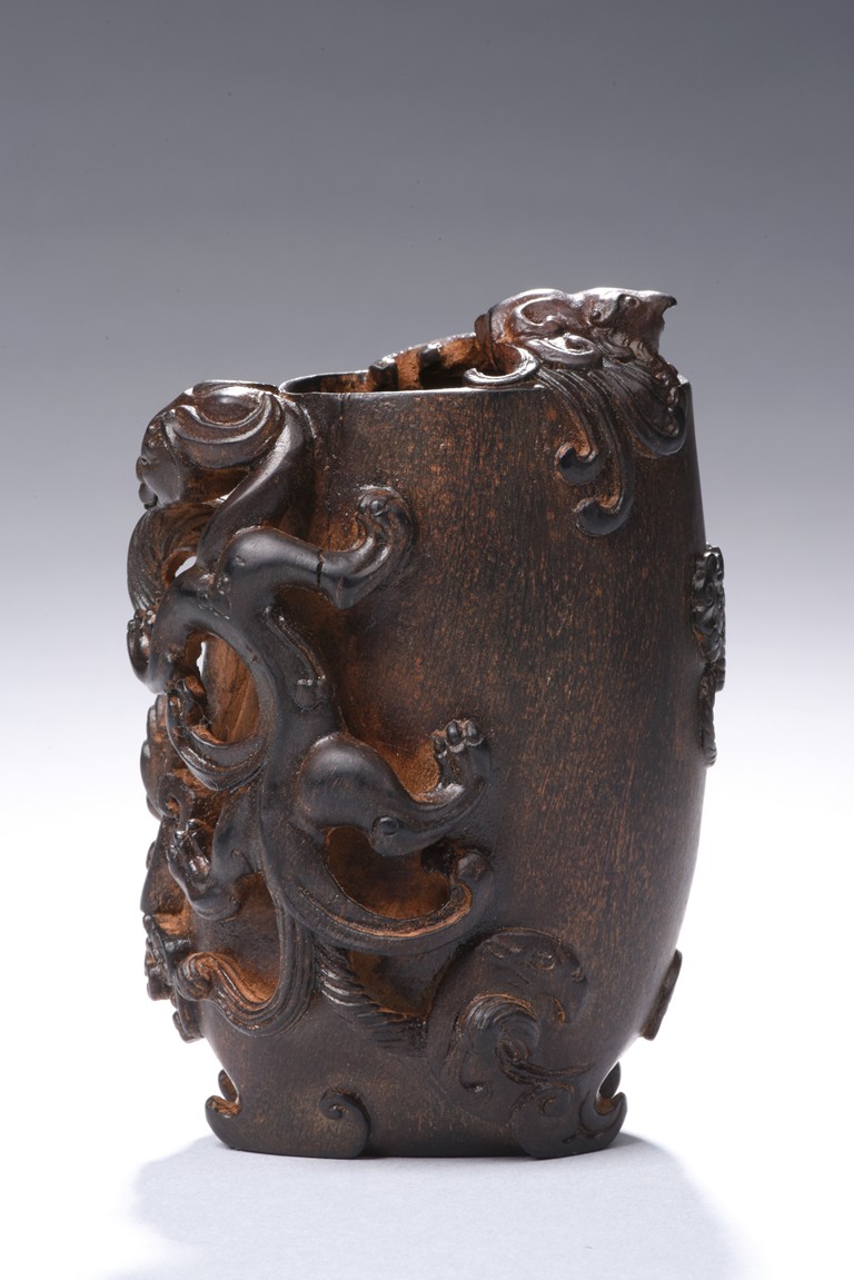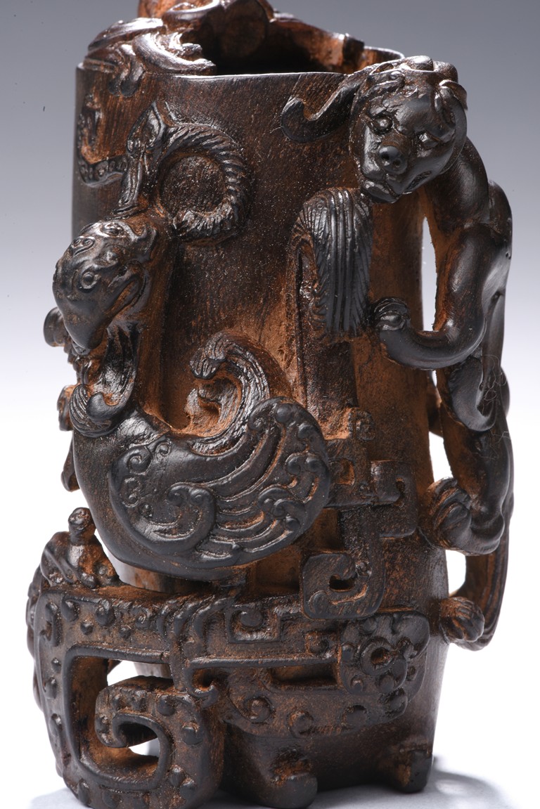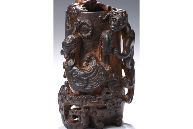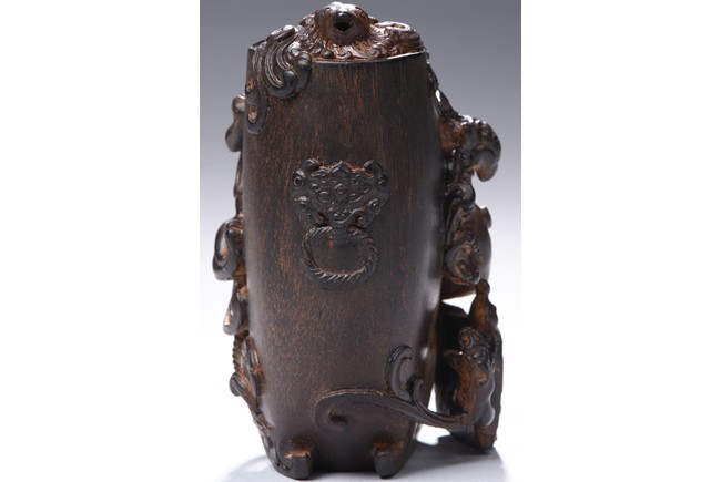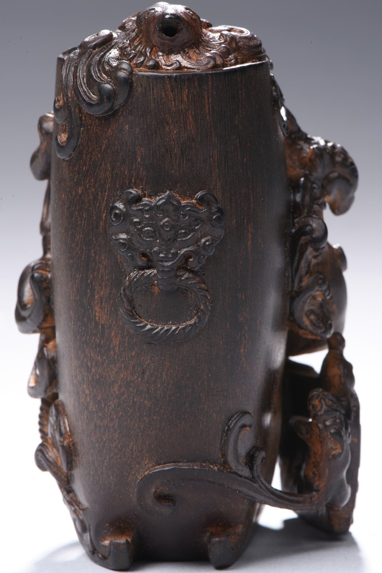 Modelled in the form of tree trunk with clambering chilong and phoenix to the exterior, and a ring mythical beast mask to the other side. Qing Dynasty period.