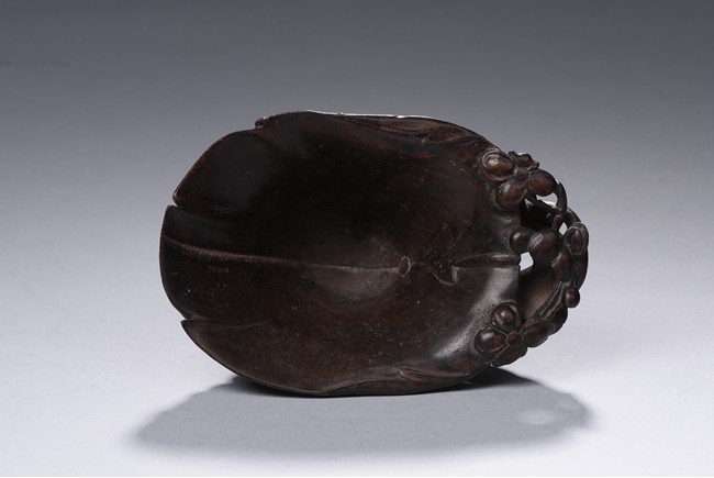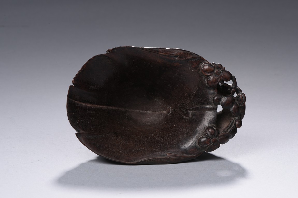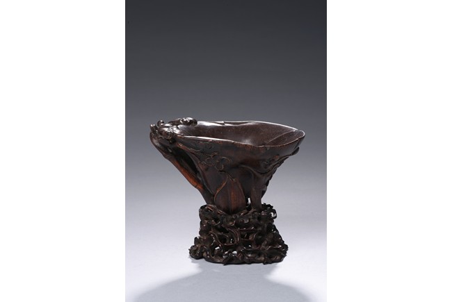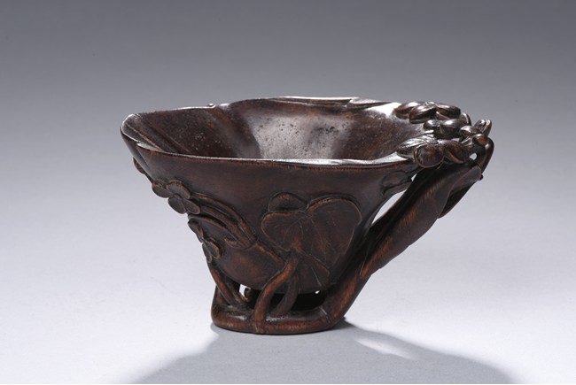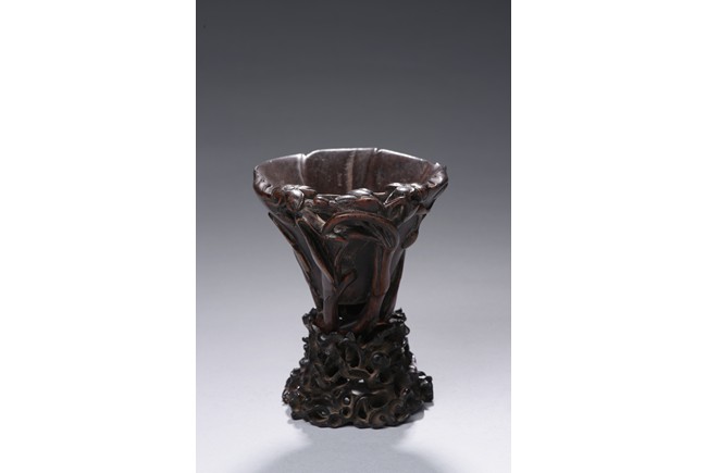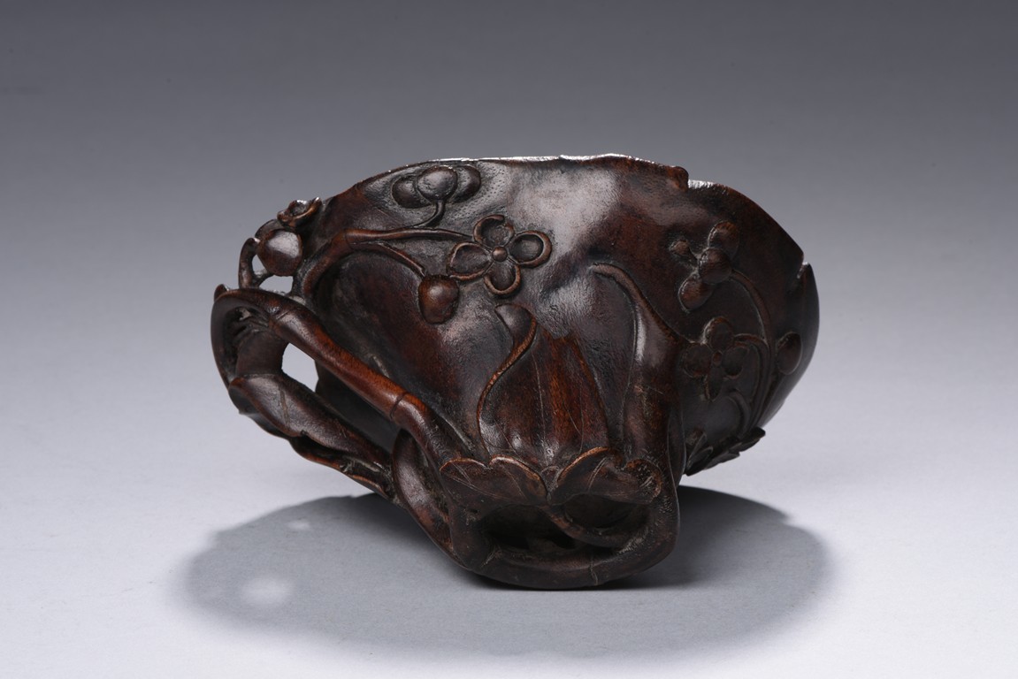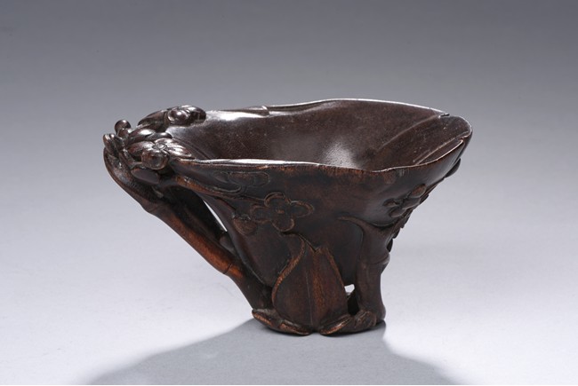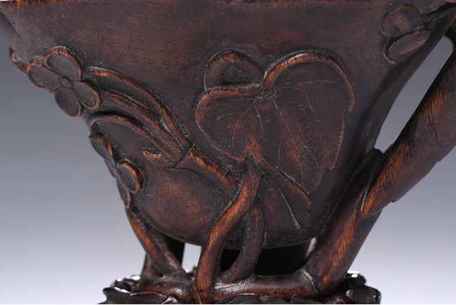 The tapered cup carved on the exterior with an irregular surface with subtle ridges and knots simulating a tree trunk, one side detailed in high relief with a gnarled branch and thin twigs issuing prunus blossoms of varying sizes and extending across the exterior, the base and onto the interior of the cup, with fitted carved wood stand. Qing Dynasty period.