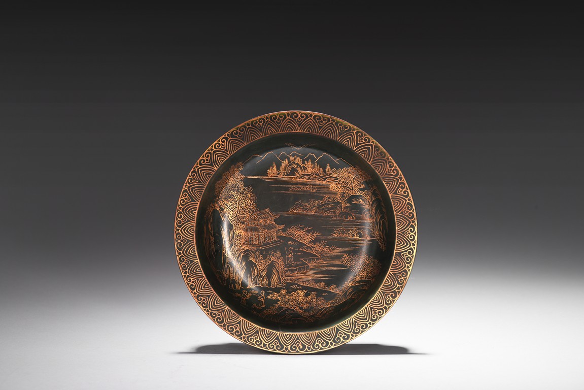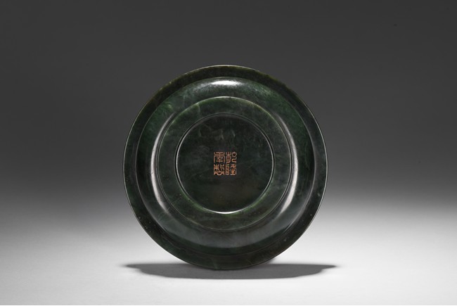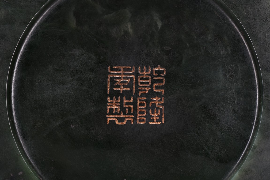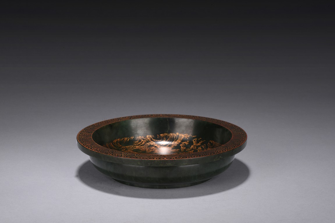 The green-glazed bowl with dark green mottling imitating spinach-green jade covering lightly incised bands of lappets and scrolled pattern on the exterior rim, painted in gilt with mountainous scene of figures outside pavilion and with rockwork and trees to the distance, the base with a four character 'Qianlong' mark in gilt. Qing Dynasty period.
