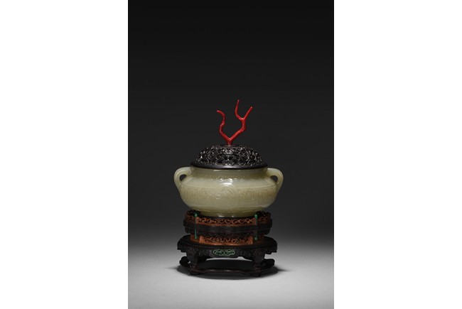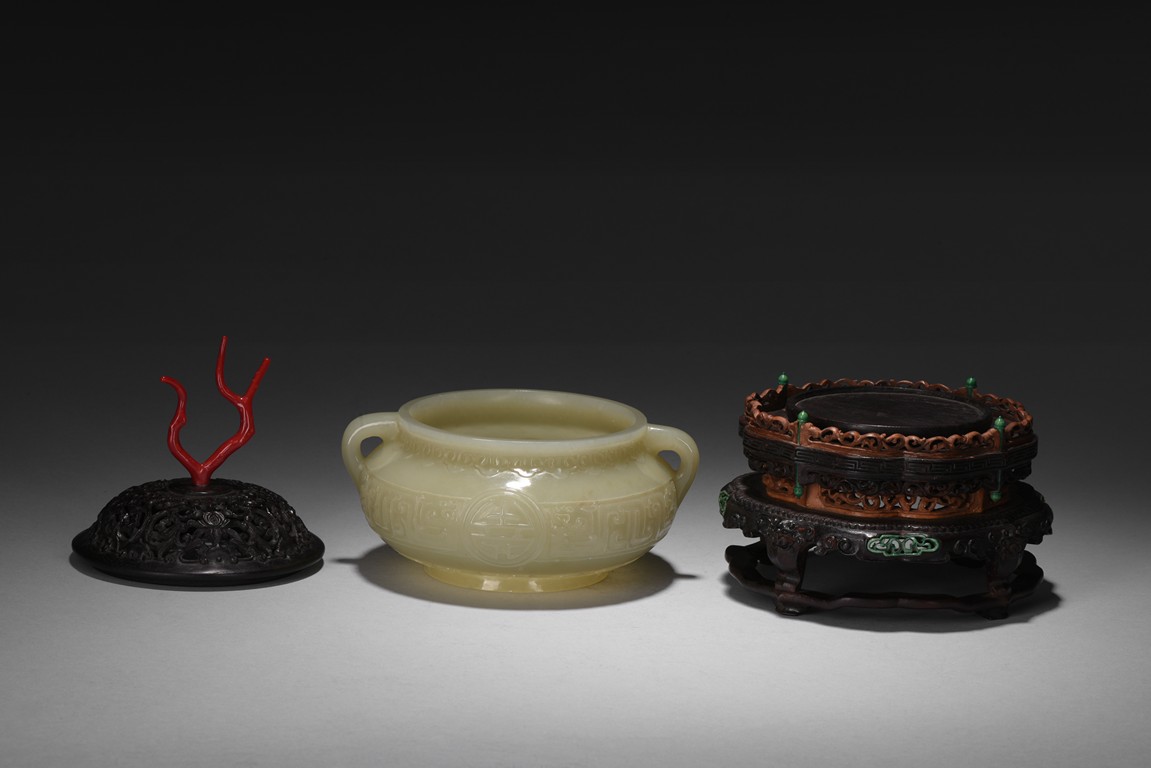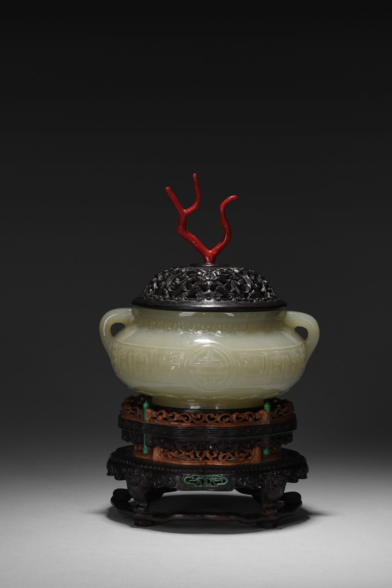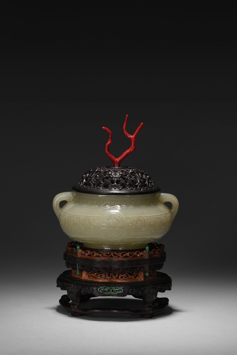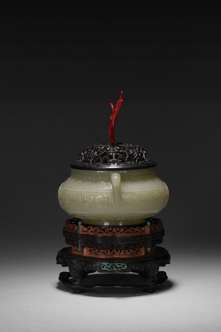 The white jade censer elaborately worked with slightly rounded tapering sides rising from a short foot to broad rounded shoulders surmounted by a short neck decorated with ruyi band, the shoulders flanked by a pair of small handle and around the middle body with band of taotie pattern along two medallion in the front and the reverse, the well-fitted zitan cover pierced with archaistic scrolled pattern surmounted by a natural-shaped red coral as finial, the censer with a three-layer elaborately carved zitan stand.