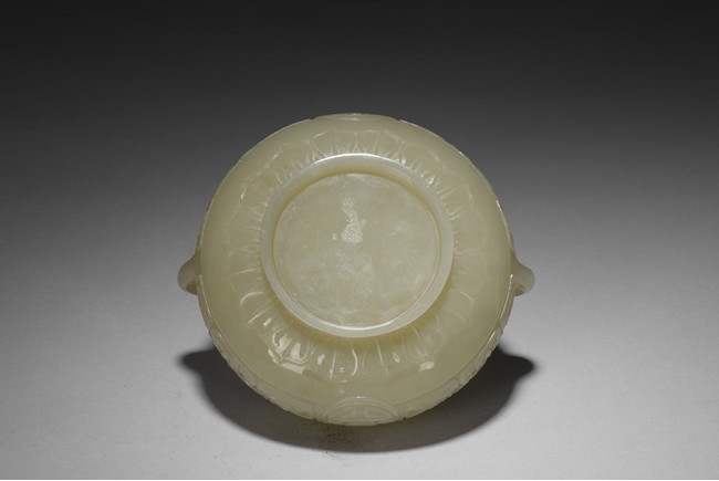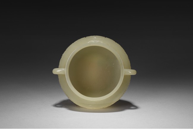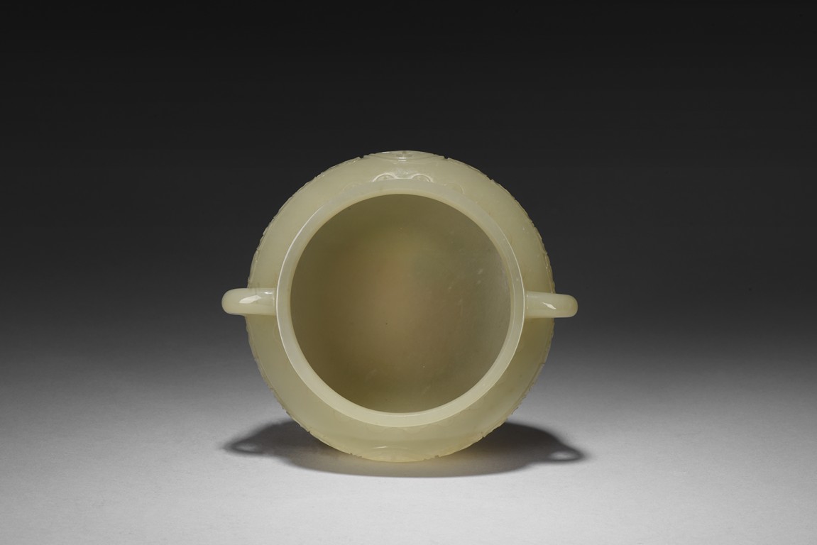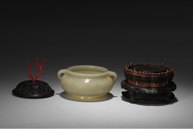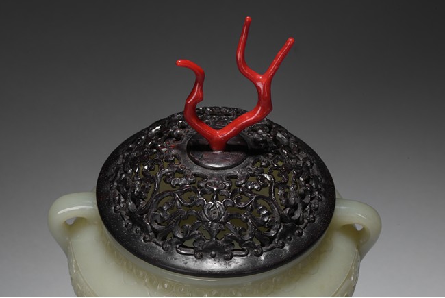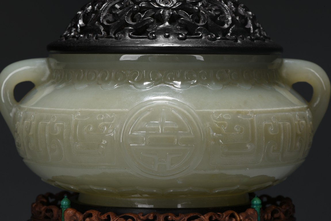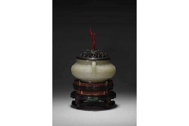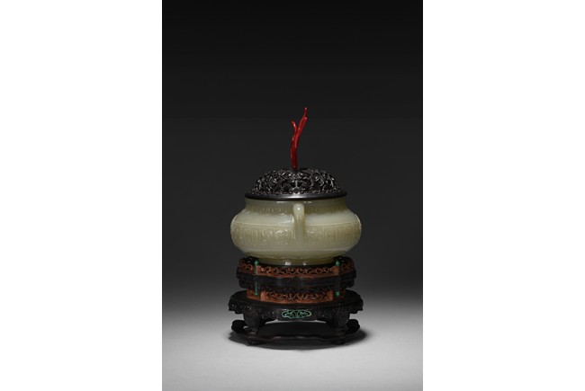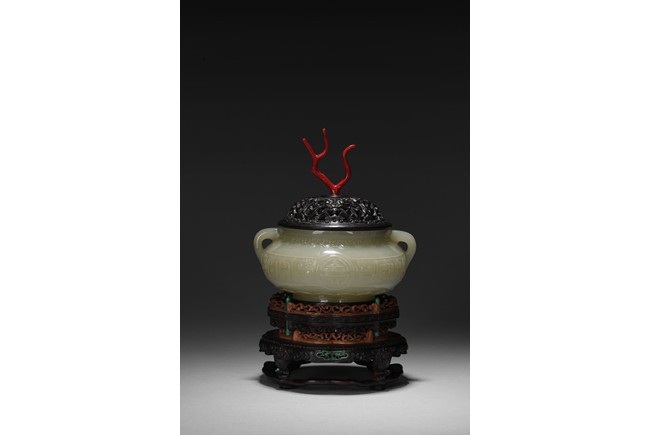 The white jade censer elaborately worked with slightly rounded tapering sides rising from a short foot to broad rounded shoulders surmounted by a short neck decorated with ruyi band, the shoulders flanked by a pair of small handle and around the middle body with band of taotie pattern along two medallion in the front and the reverse, the well-fitted zitan cover pierced with archaistic scrolled pattern surmounted by a natural-shaped red coral as finial, the censer with a three-layer elaborately carved zitan stand.
