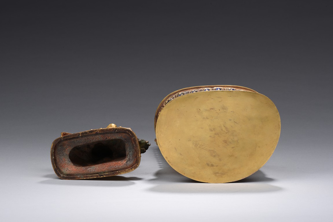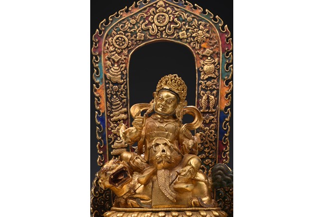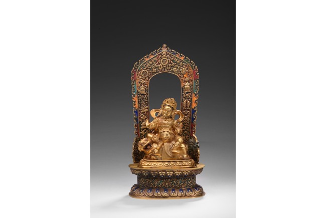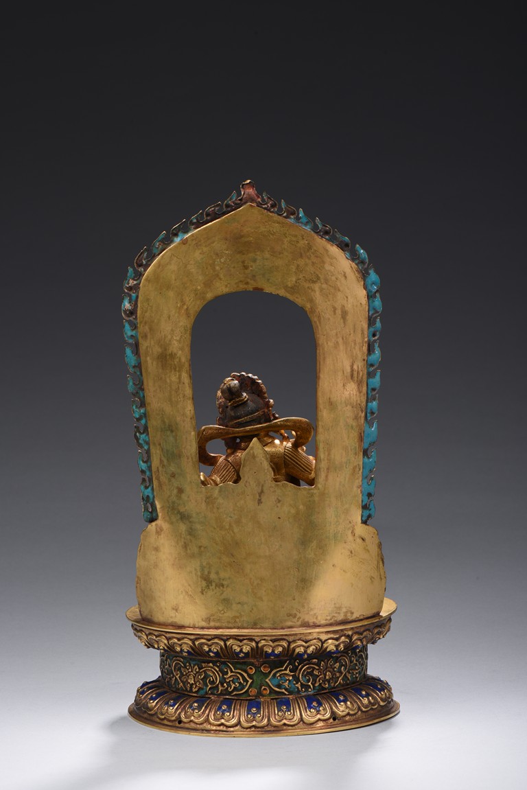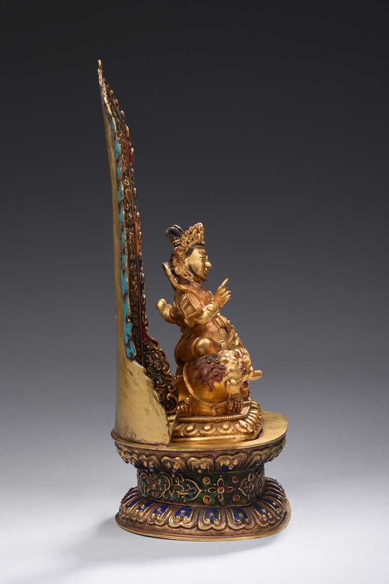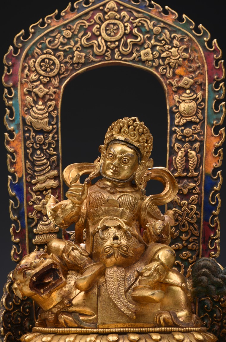 Seated on a lion over a lotus base, his right hand in vitarka mudra with his left holding a mongoose, dressed in robe and adorned with flowing ribbons, the face with hooked nose and arched brows flanked by large earrings, the hair pulled into a high chignon, all upon an elaborate colored cloisonne enamel double lotus stand and mandorla of flame-form decorated with Buddhist eight auspicious emblems. Qing Dynasty period.