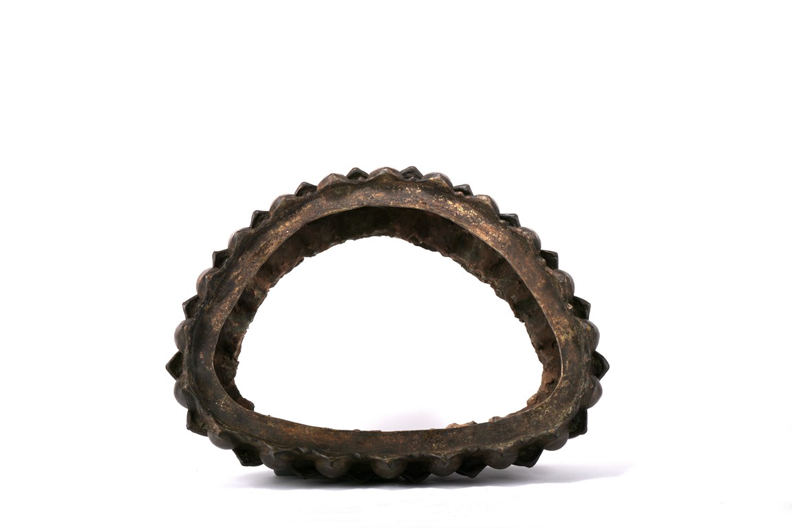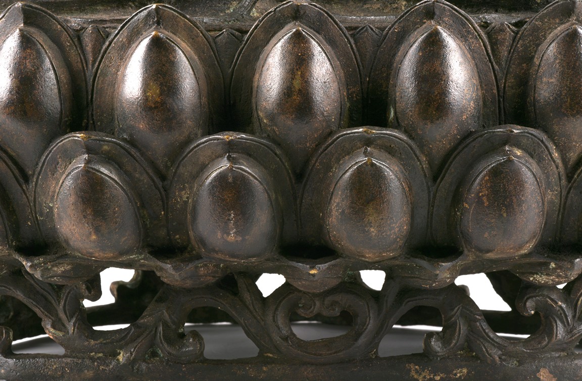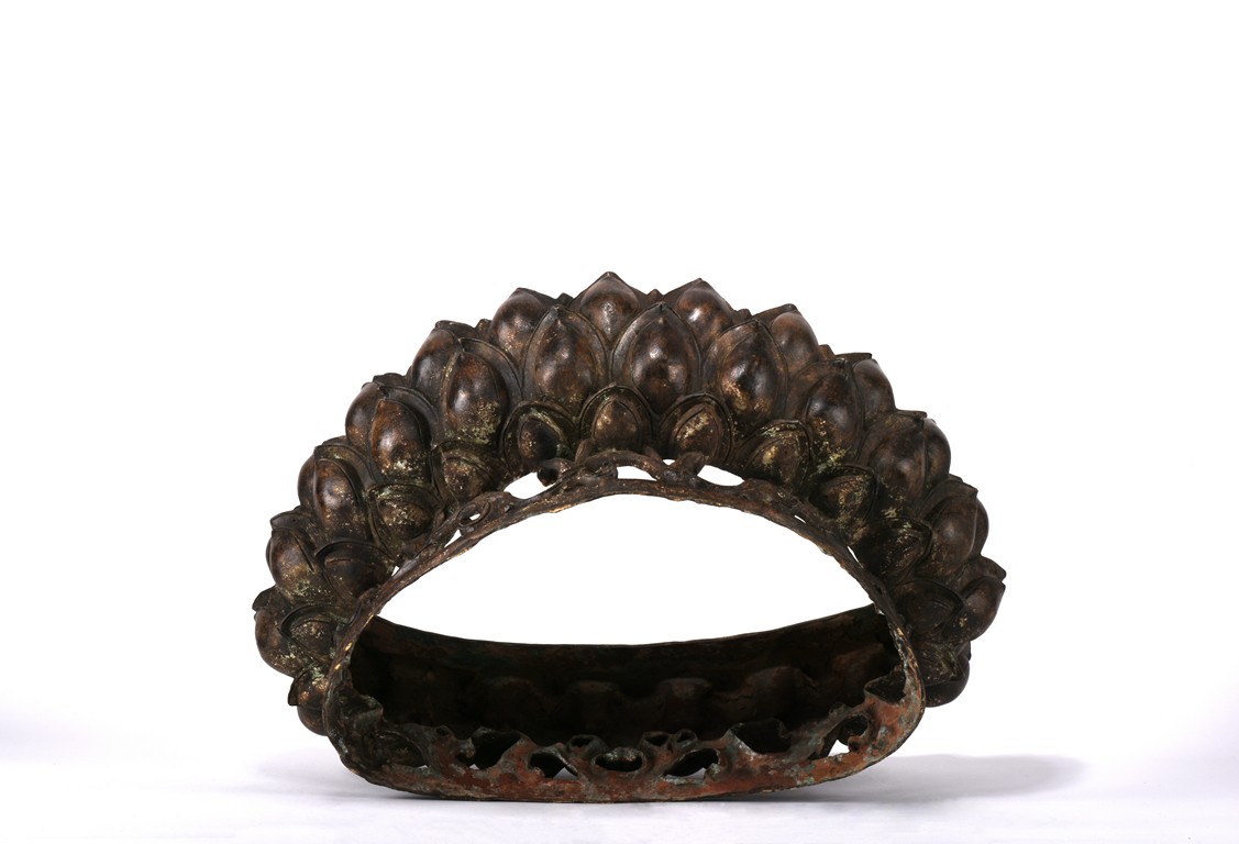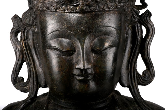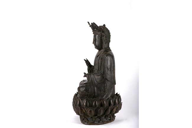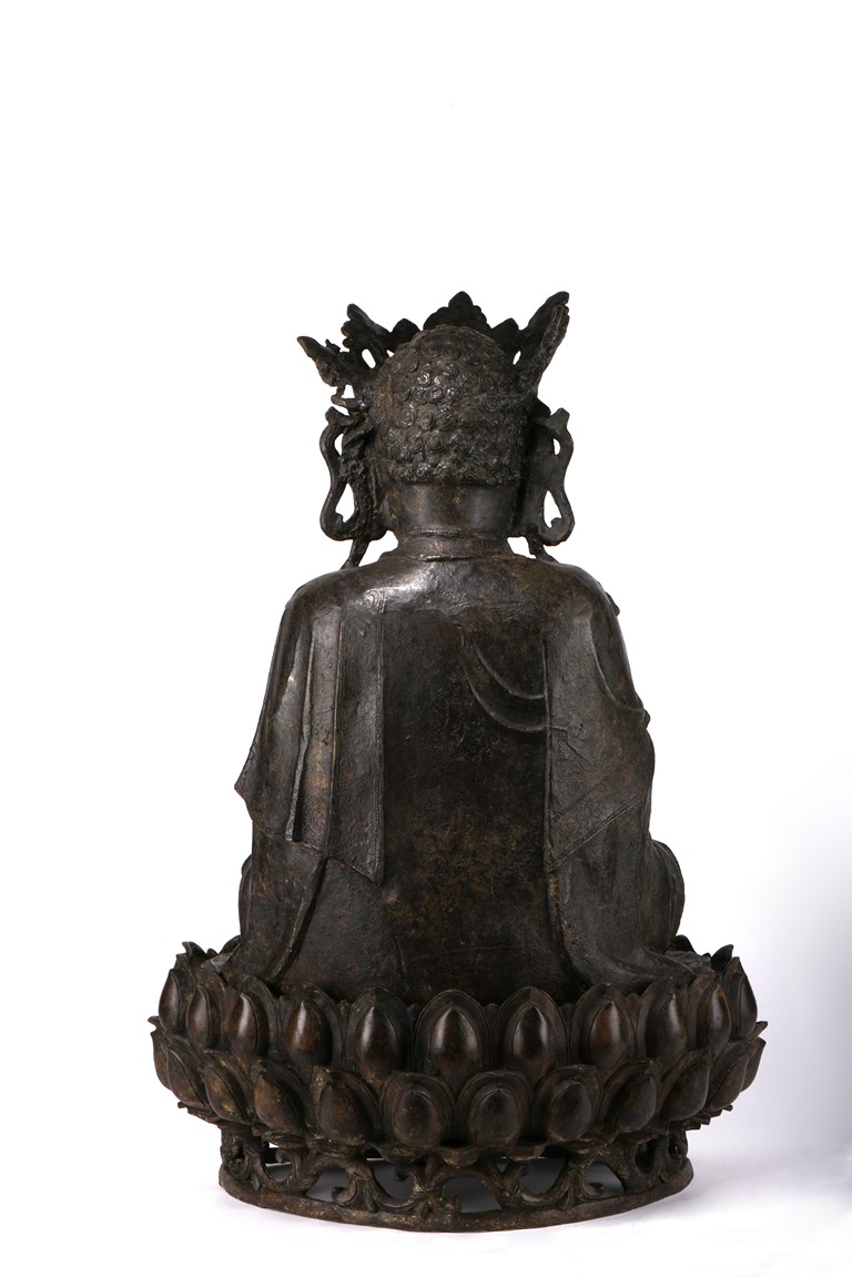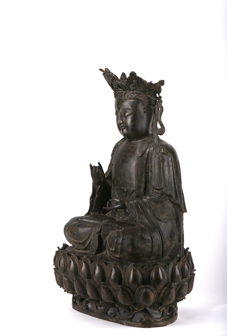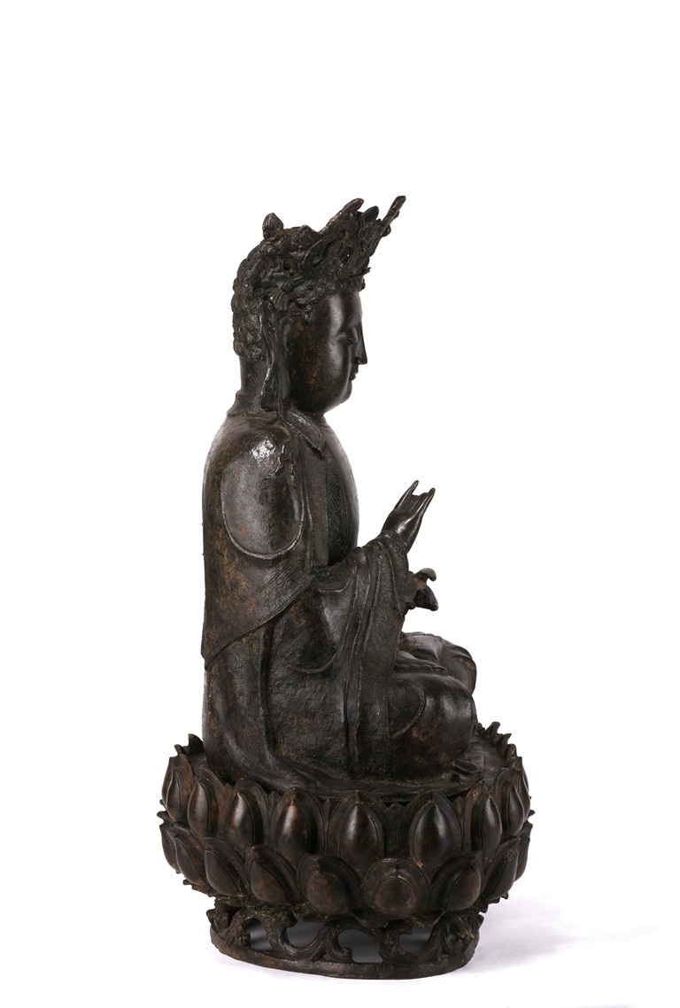 The bodhisattva is shown seated on a double-lotus base with hands in karana mudra. Shown wearing long and loose robe. His face is shown with benevolent expression, flanked by pendulous earlobes and wearing a high tiara enclosing a small figure of Buddha. Ming Dynasty period.