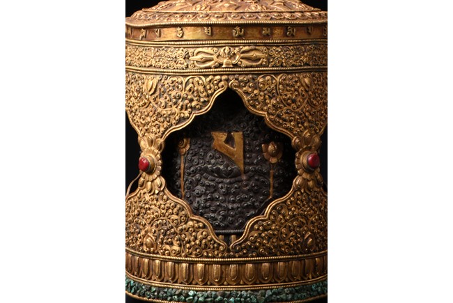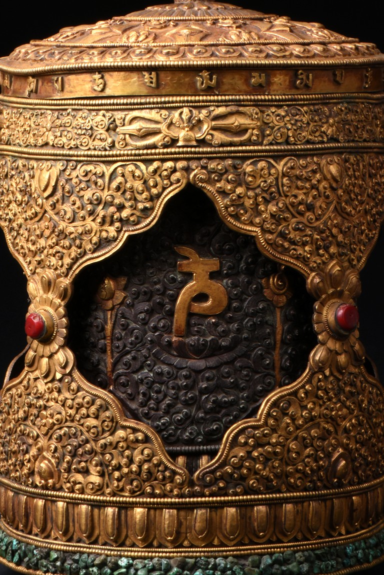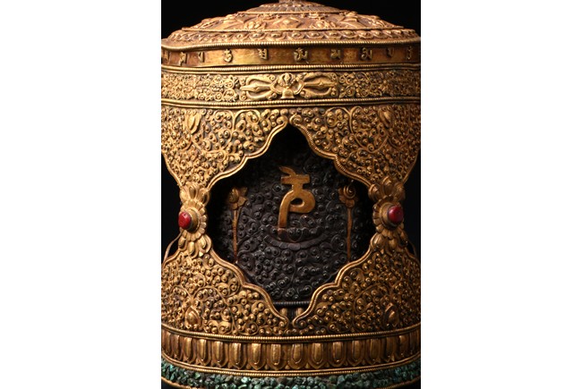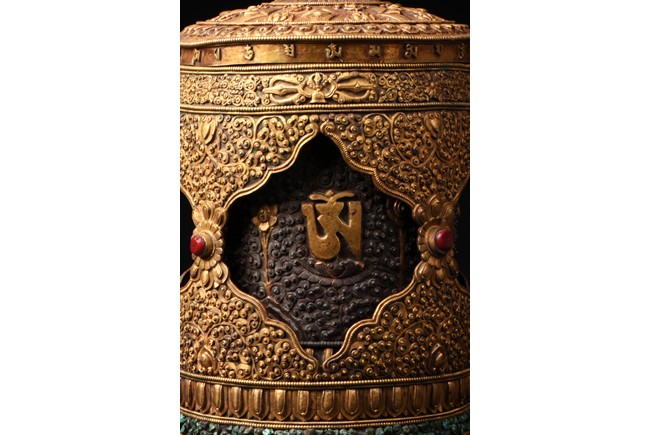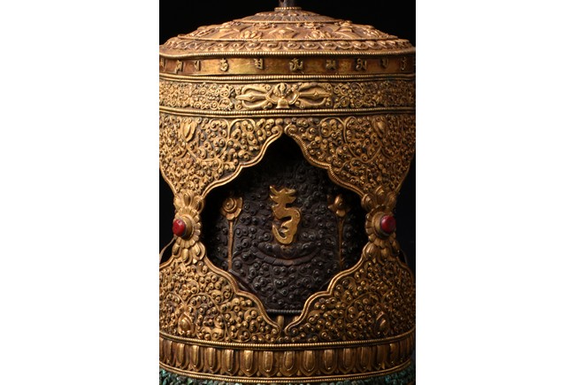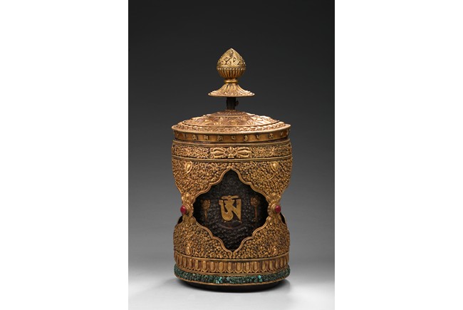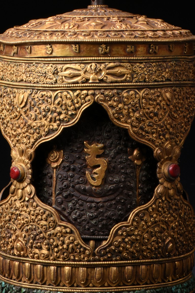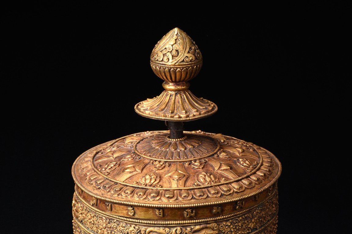Of cylindrical form and with a conforming hat-form cover, the body cast in repousse with elaborate scrolled pattern, the interior revolves and reveals various gilt-bronze Tibetan characters. Qing Dynasty period.