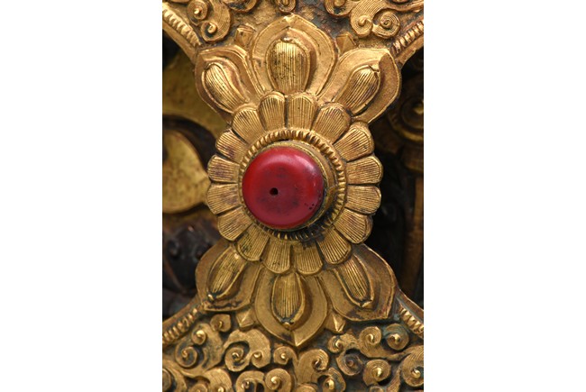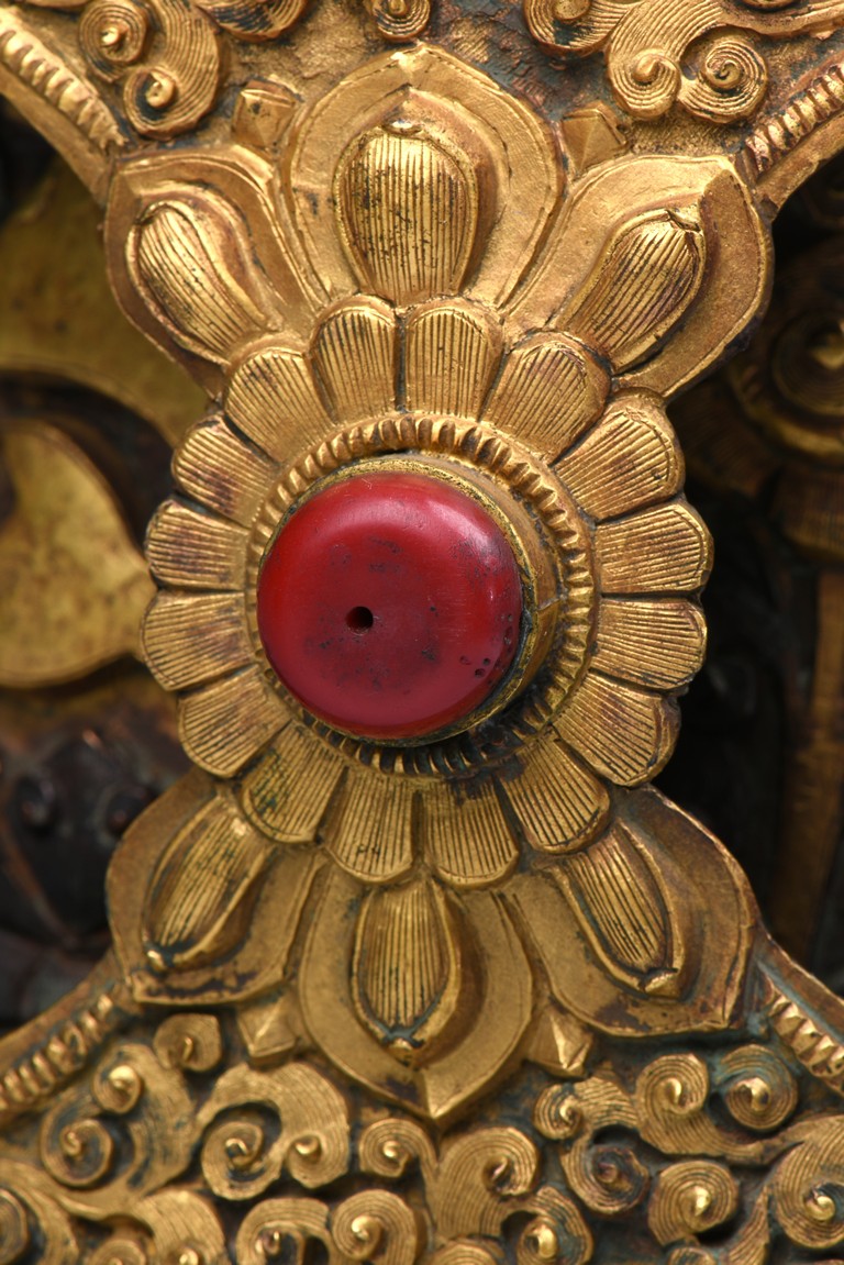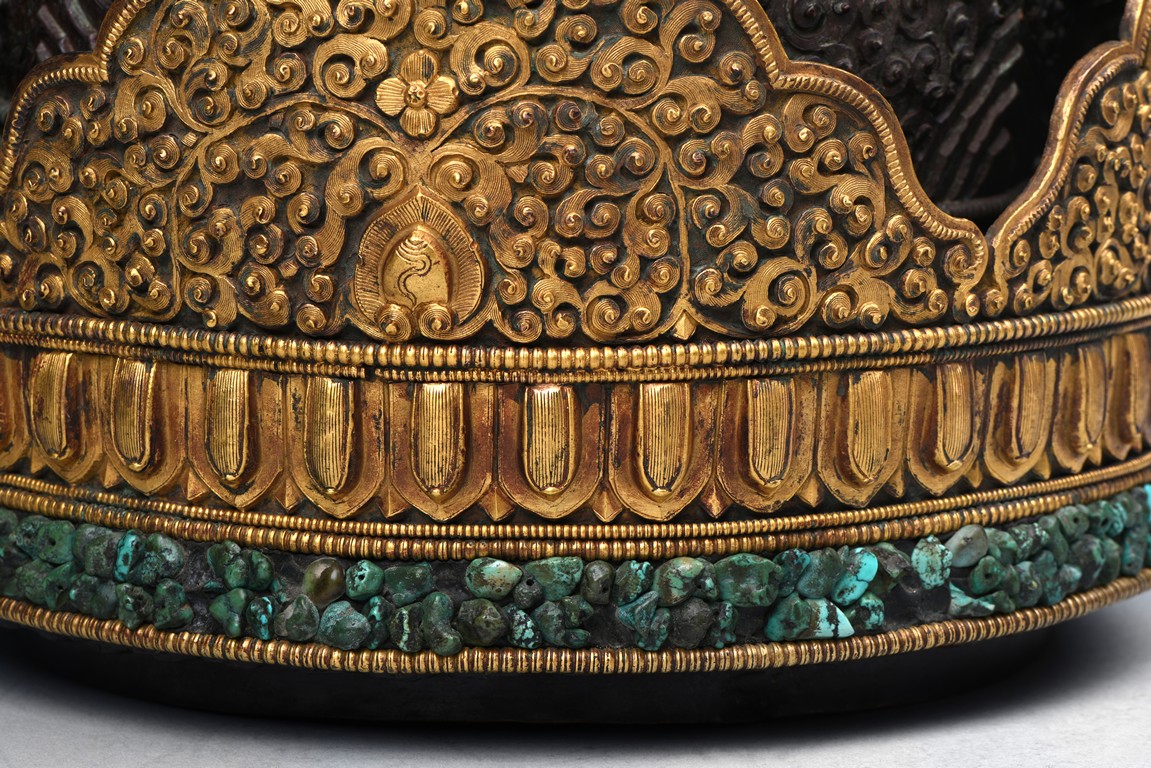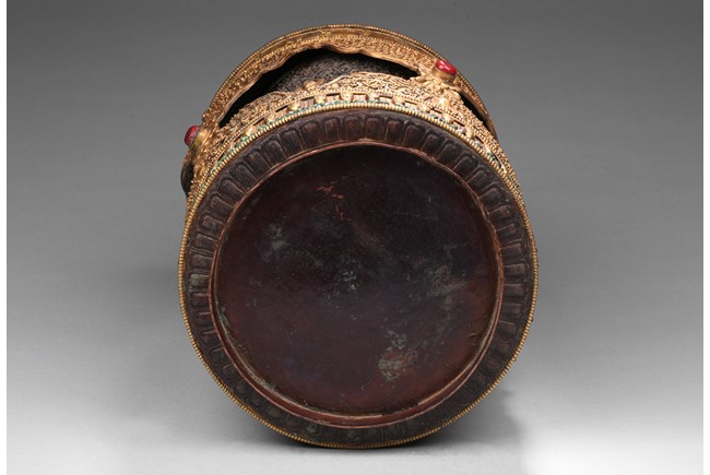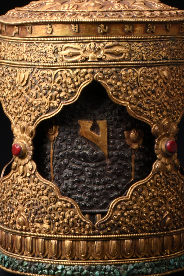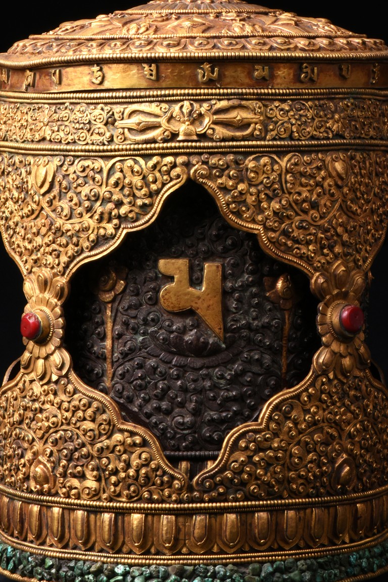 Of cylindrical form and with a conforming hat-form cover, the body cast in repousse with elaborate scrolled pattern, the interior revolves and reveals various gilt-bronze Tibetan characters. Qing Dynasty period.