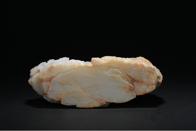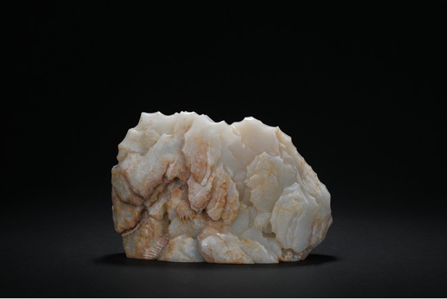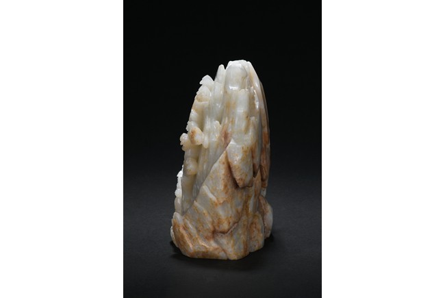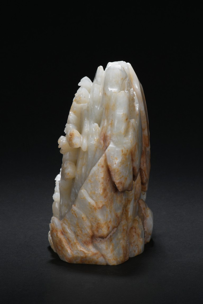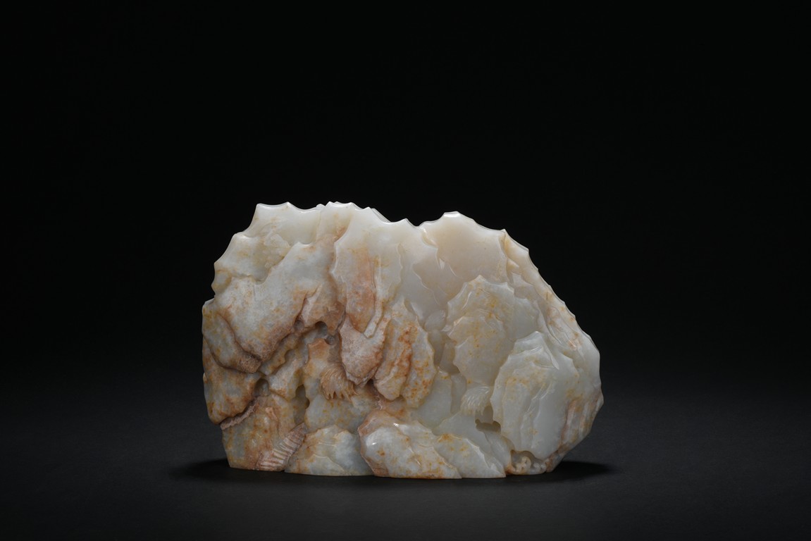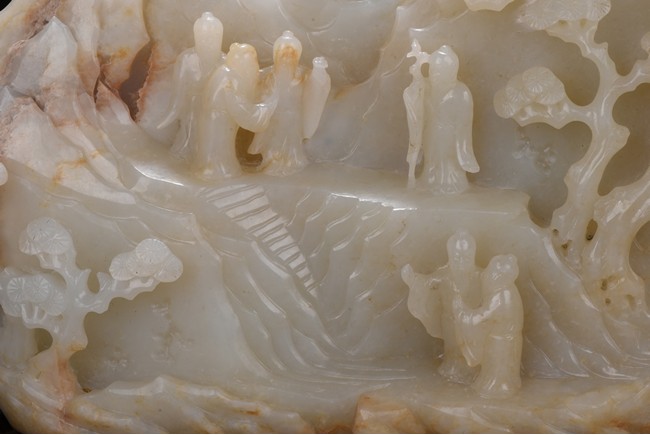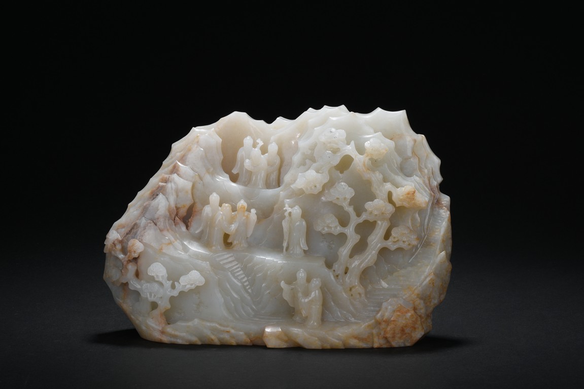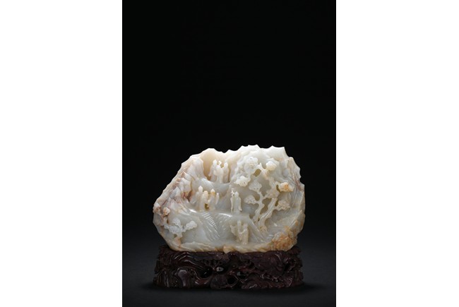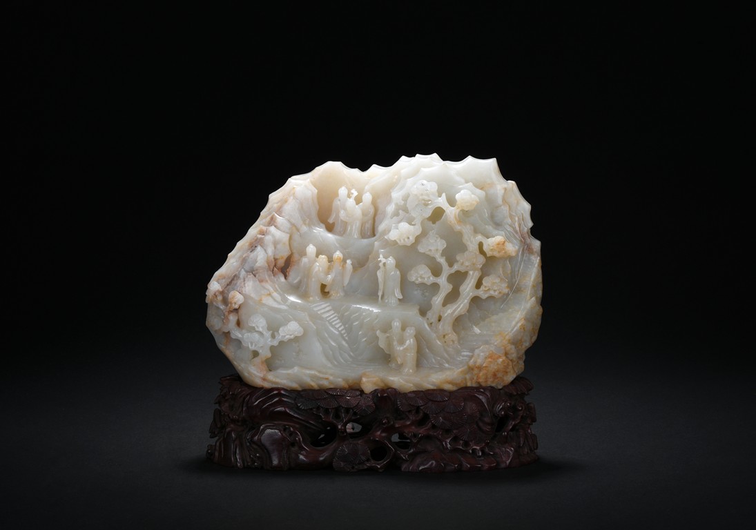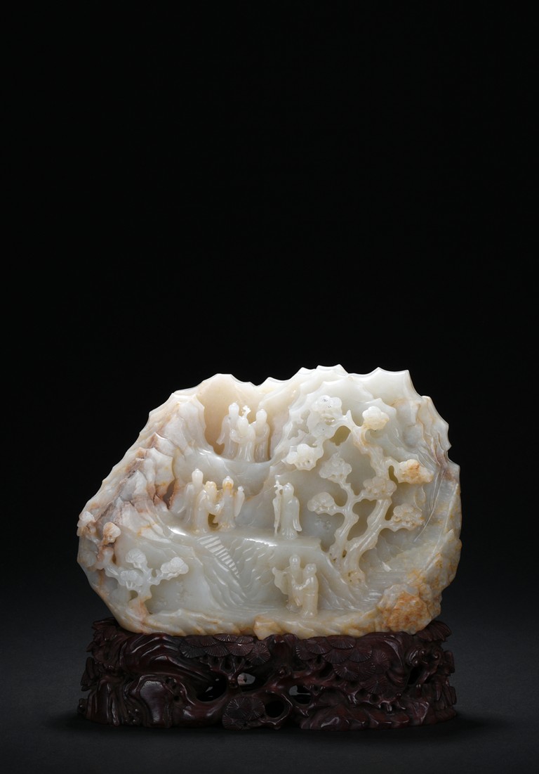 The stone of an attractive white tone with slight russet and brownish tone mottling,elaborately carved to both faces with mountain landscape scenes, the front depicting nine figures strolling along the winding path busy in various scholarly activities, set amid overhanging craggy rocks and scattered pian trees, the reverse with a various overhanging craggy rocks along the path. The boulder with a fitted wood stand. Qing Dynasty Qianlong period.