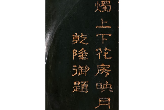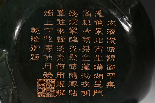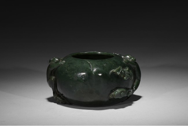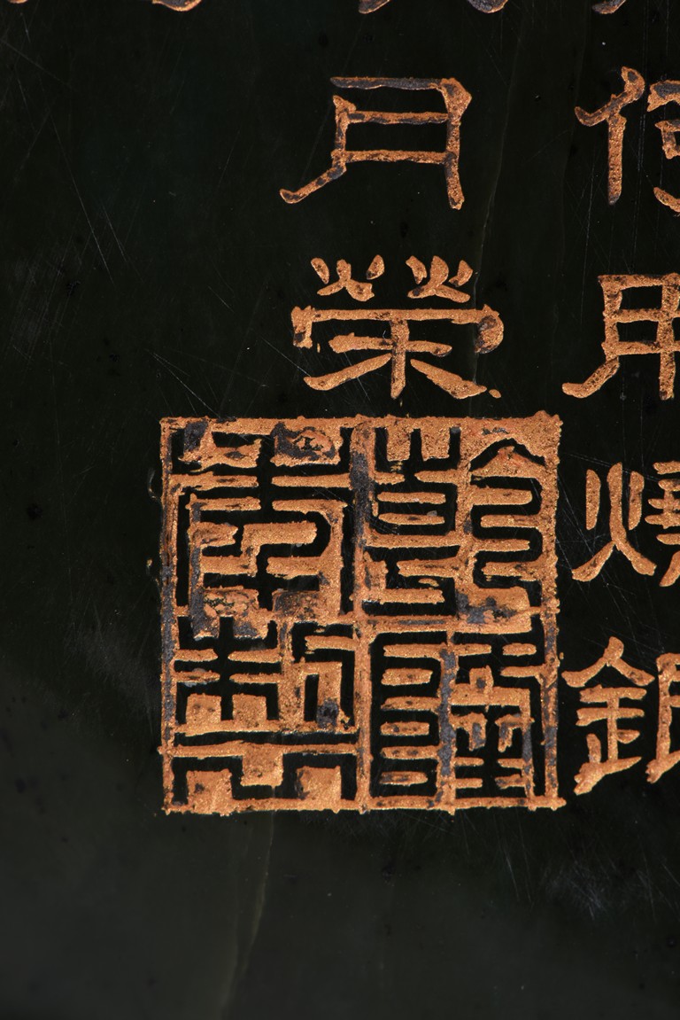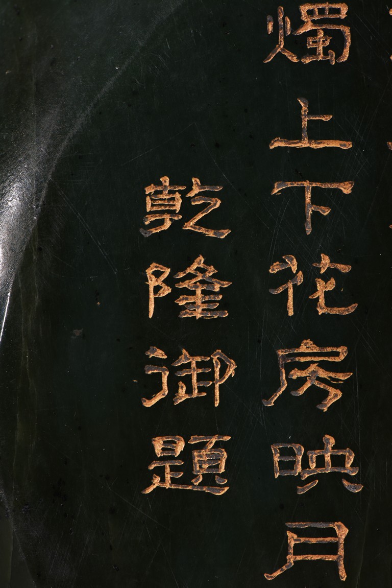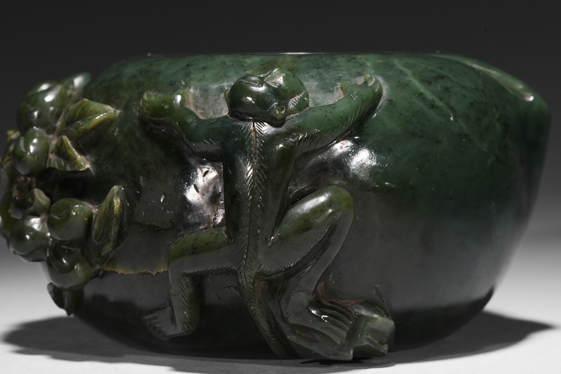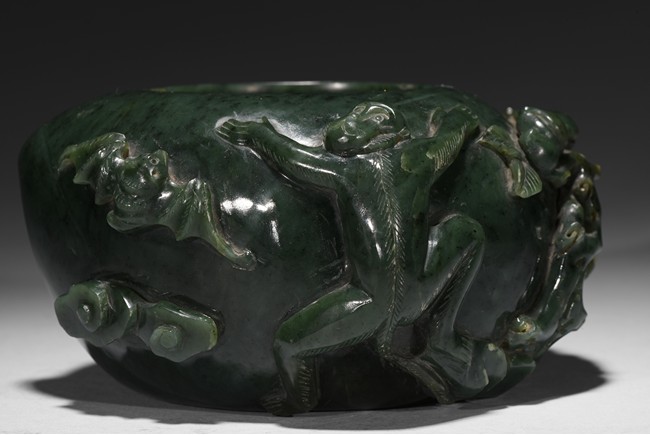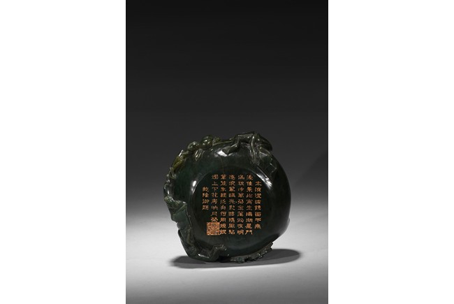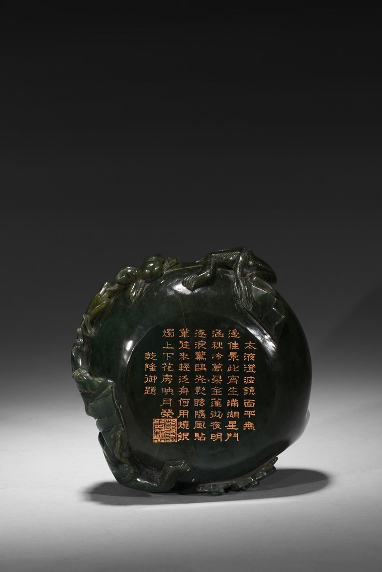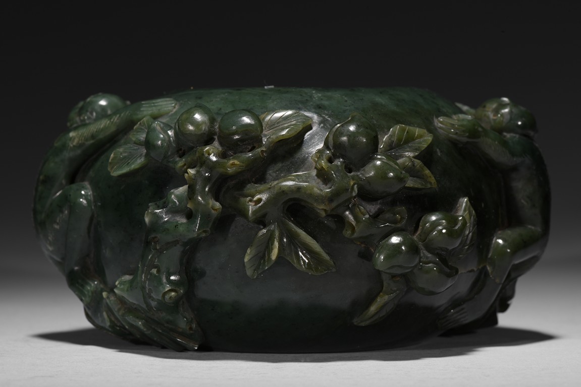 Exquisitely carved and pierced in the form of a hollowed peach form , carved around the body in varying levels of relief with two monkeys clambering to both sides, a bat with outstretched wings and two long leafy branches meandering across the surface with smaller peaches extending to the underside rim, the stone of an even spinach green color accentuated with dark speckles, the base with an poem inscription in gilt.