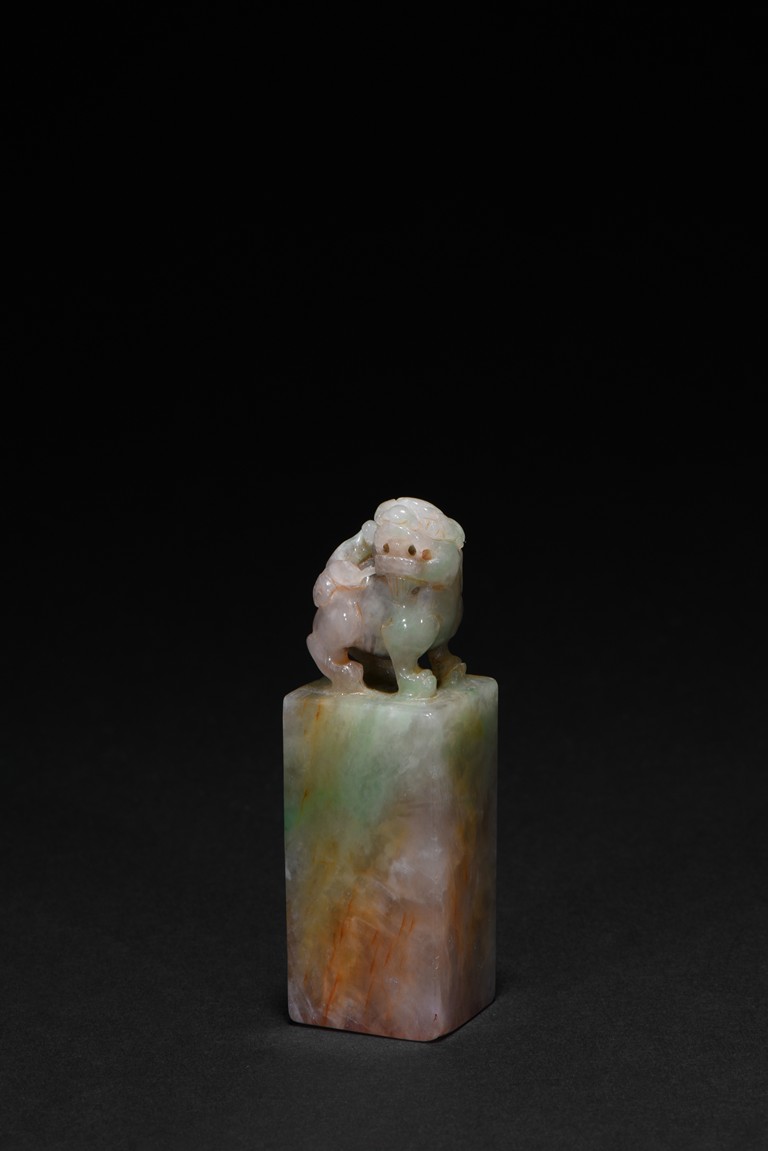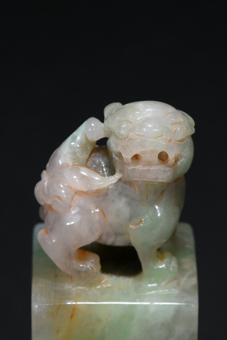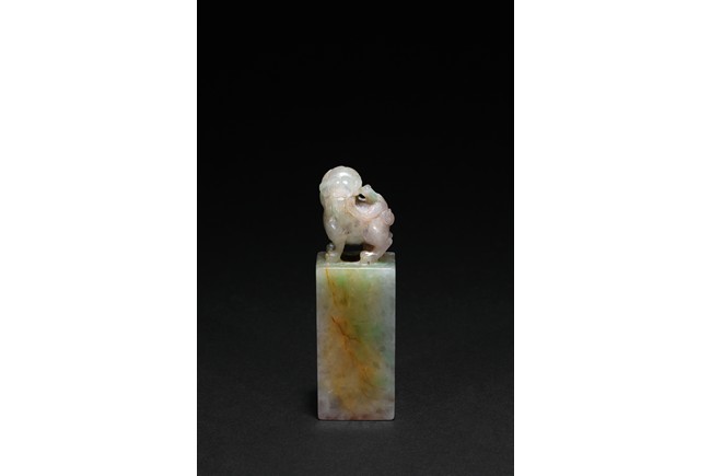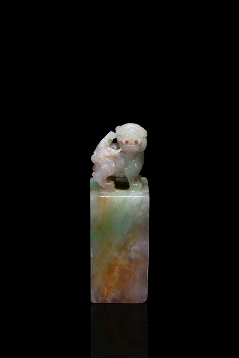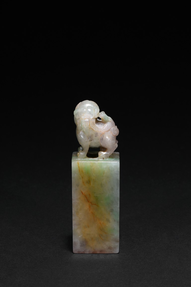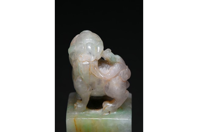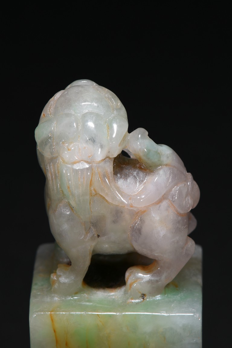 Carved with a lion with powerful muscle standing atop a long rectangular shaped plinth, the bifurcated lion tail extending upwards on both sides of the body close to its face, the semi-translucent jadeite of mottled apple green and celadon tone, with streaks of bright green, lavender, and honey colour. The base with a three character 'Su Qin Wang' mark. Qing Dynasty period.