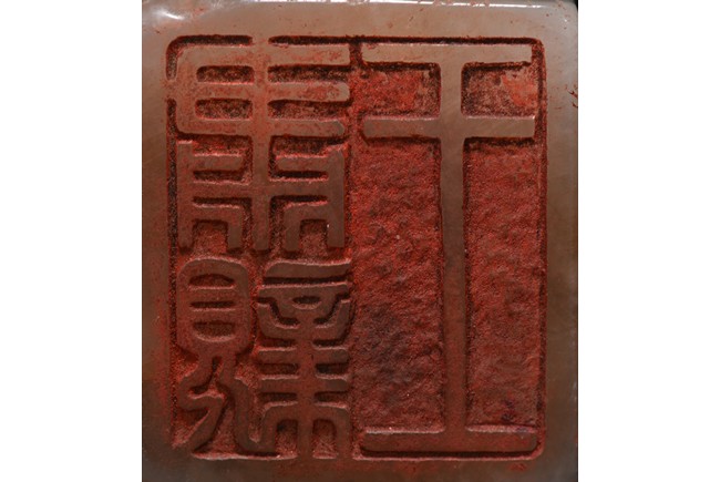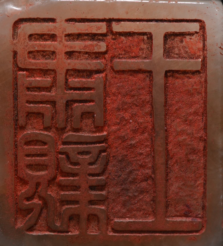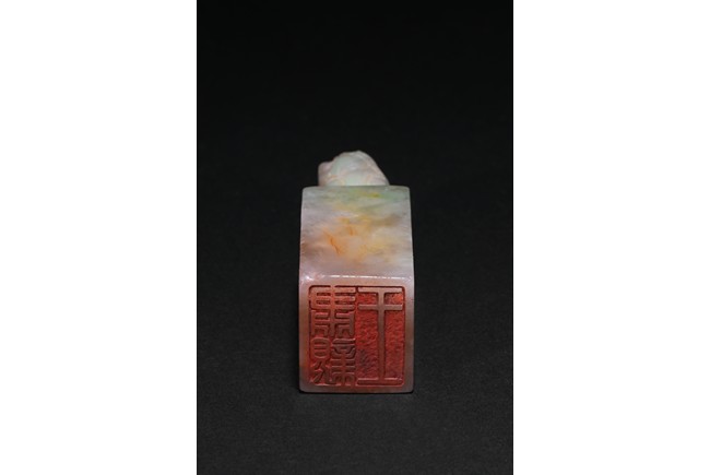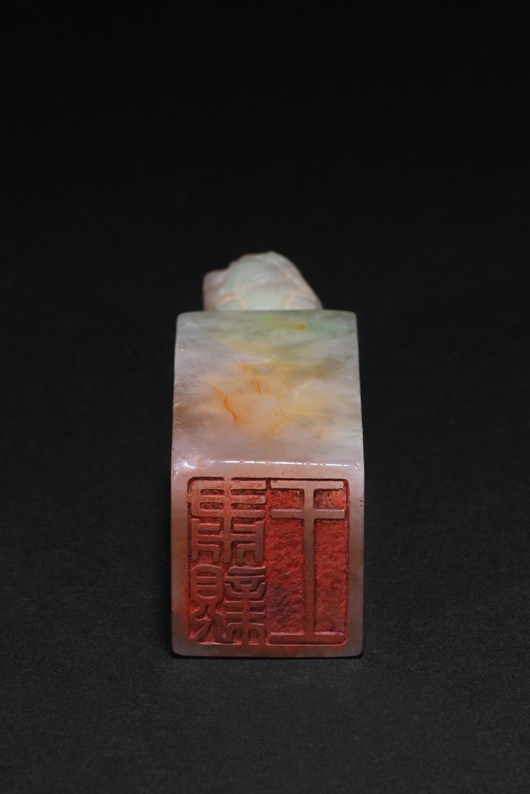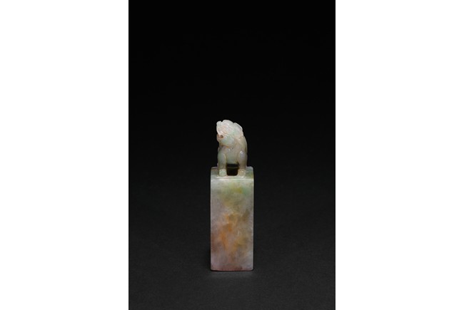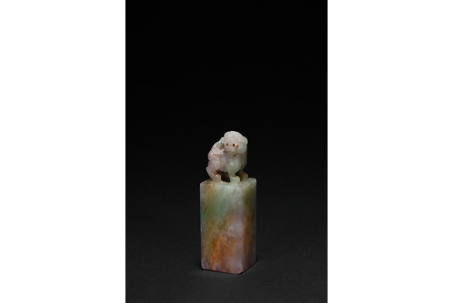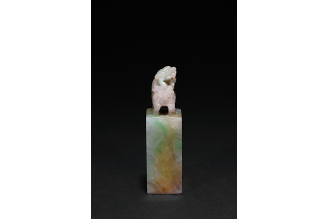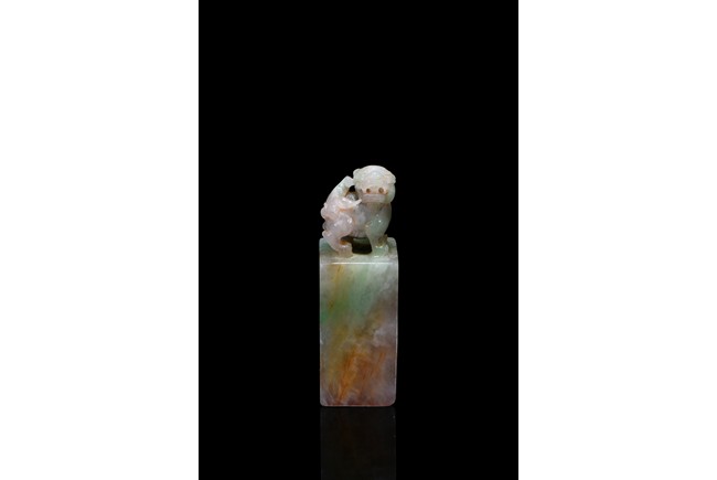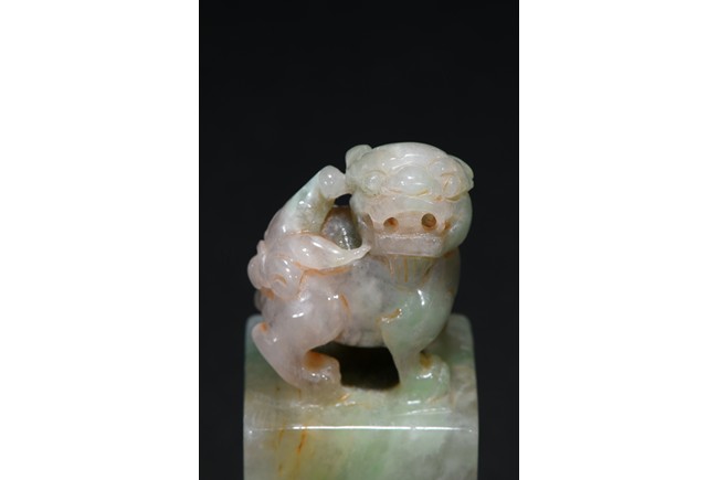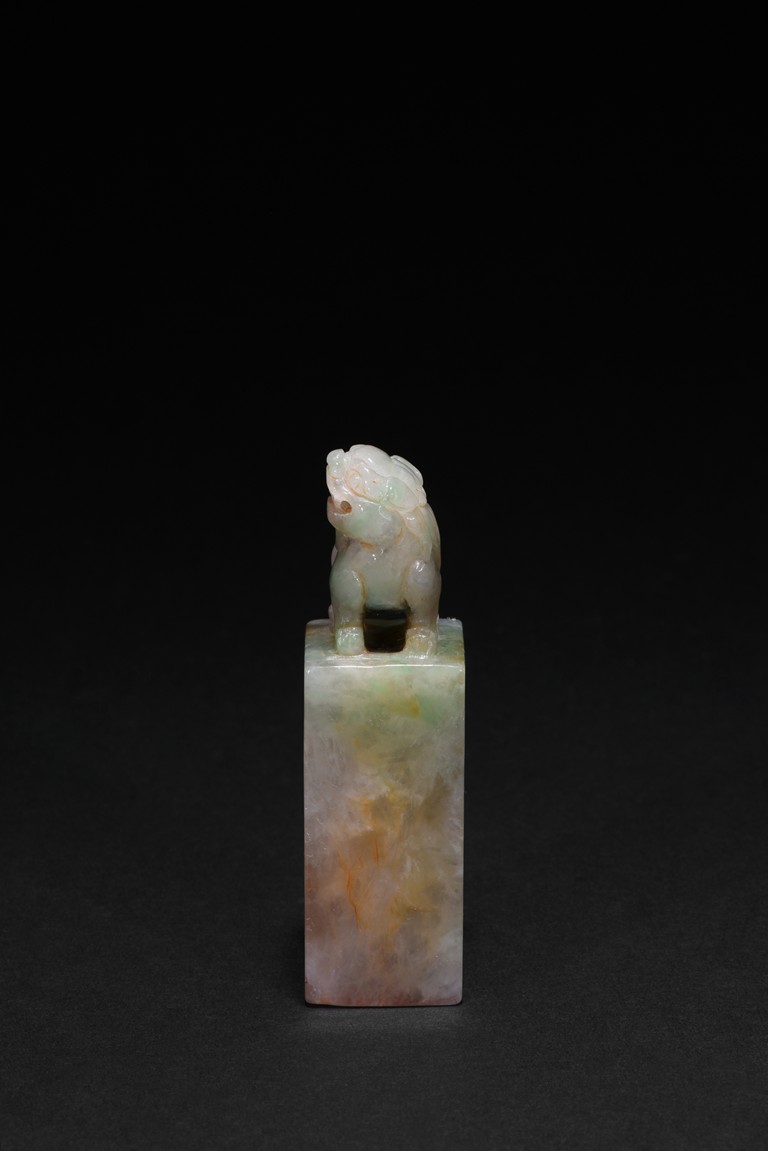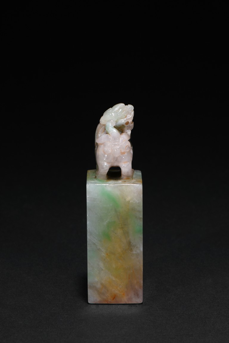 Carved with a lion with powerful muscle standing atop a long rectangular shaped plinth, the bifurcated lion tail extending upwards on both sides of the body close to its face, the semi-translucent jadeite of mottled apple green and celadon tone, with streaks of bright green, lavender, and honey colour. The base with a three character 'Su Qin Wang' mark. Qing Dynasty period.