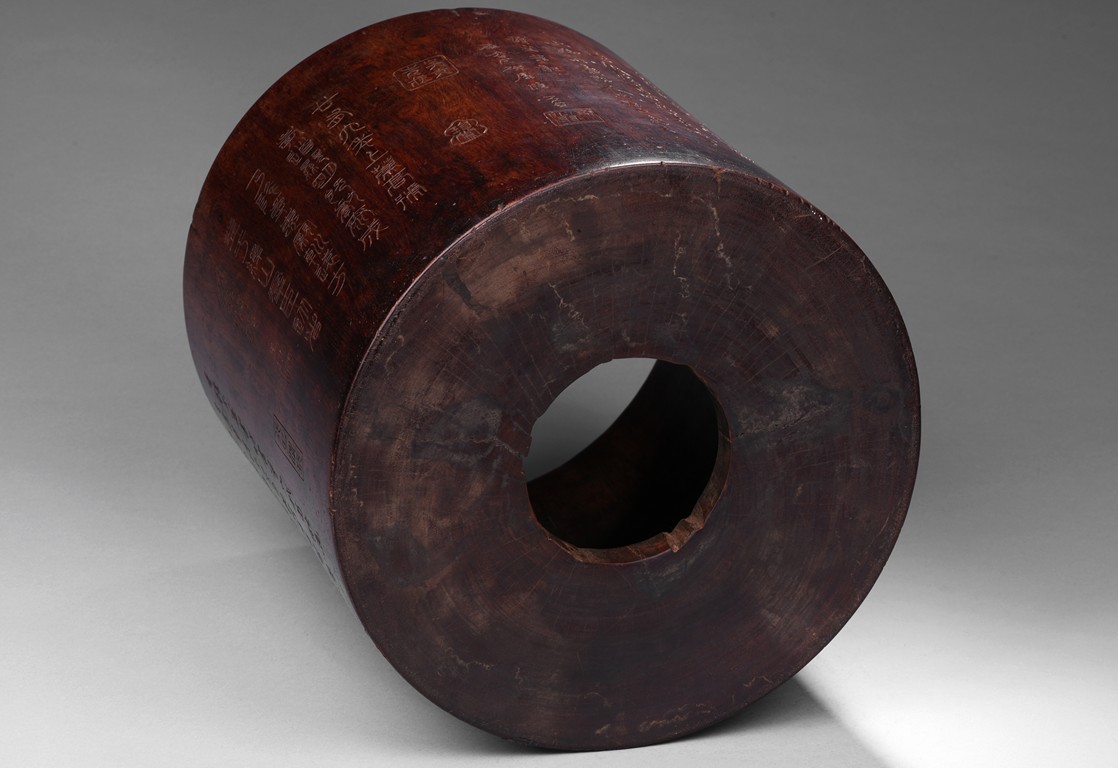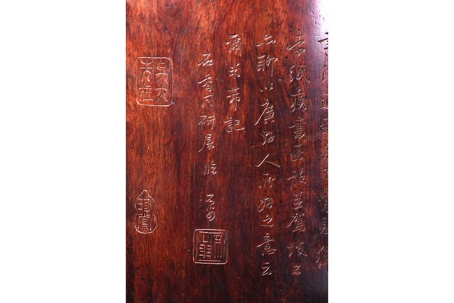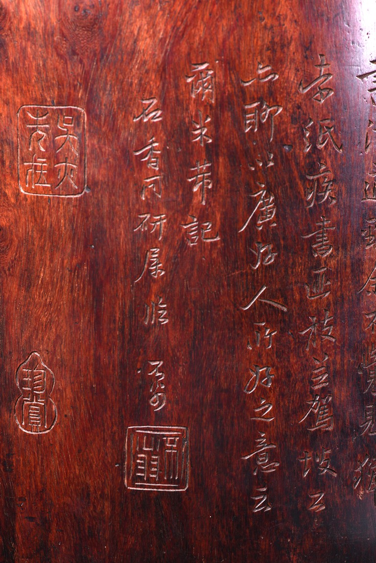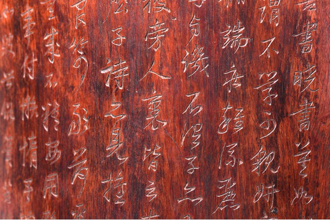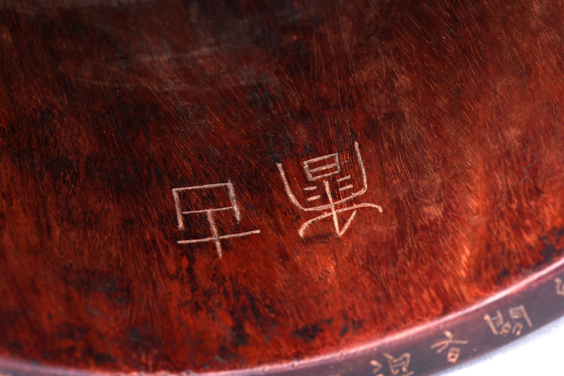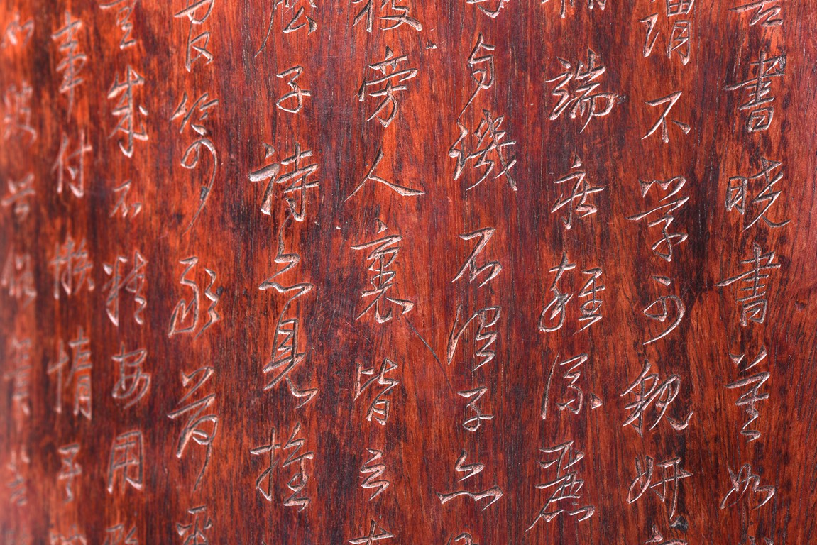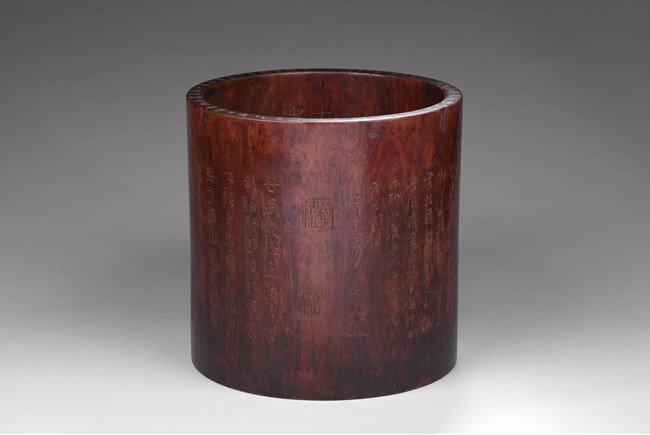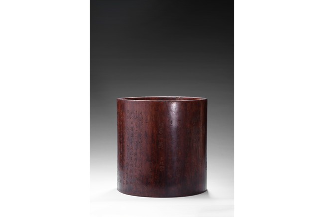Patinated to a variegated amber-brown tone, of cylindrical form and carved a hollowed-out form, the base pierced with a central aperture, around the exterior finely carved with poem in different script style and three seals of the artist. The rim further incised with inscription. Qing Dynasty period.