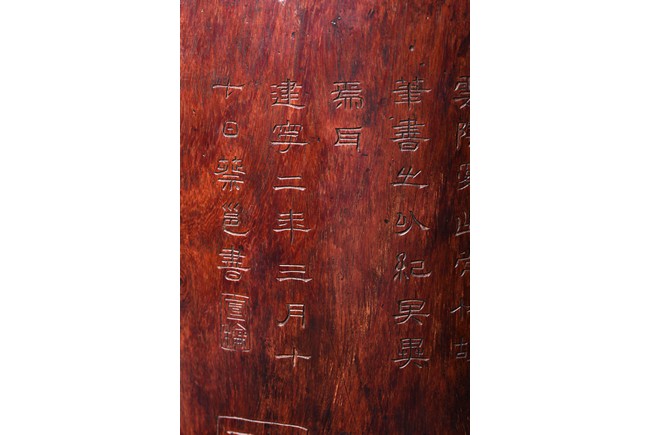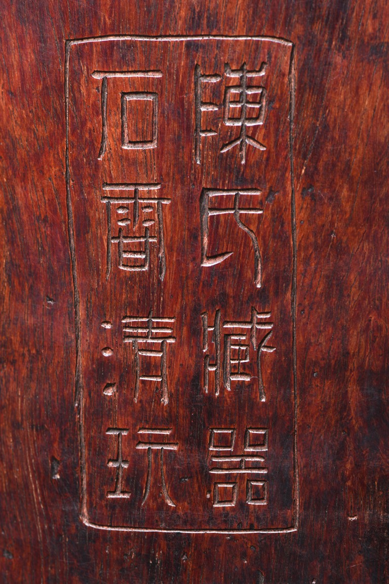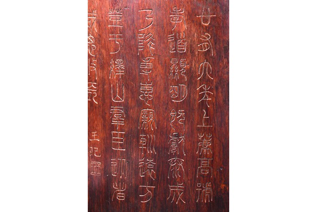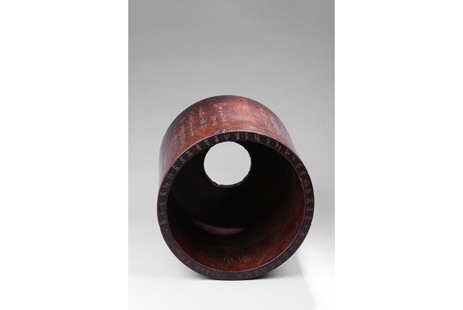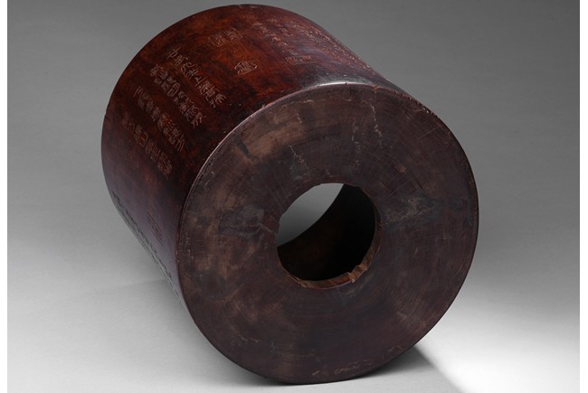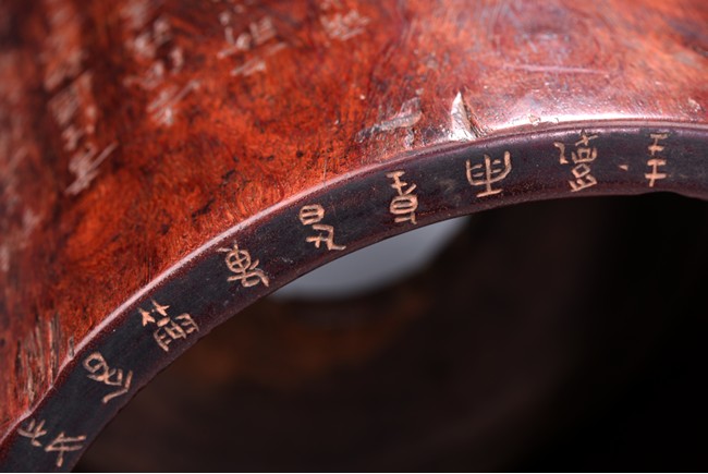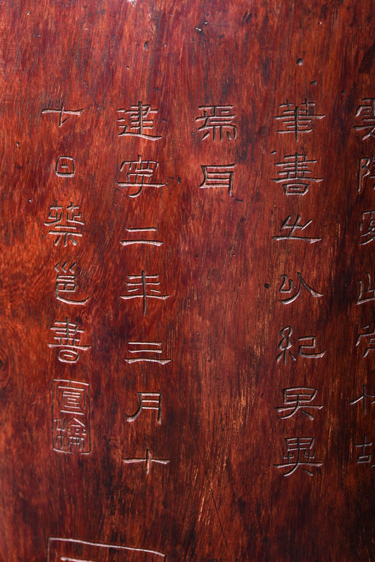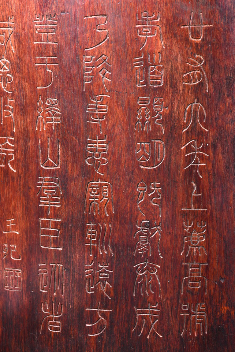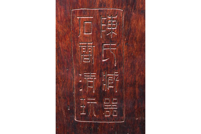 Patinated to a variegated amber-brown tone, of cylindrical form and carved a hollowed-out form, the base pierced with a central aperture, around the exterior finely carved with poem in different script style and three seals of the artist. The rim further incised with inscription. Qing Dynasty period.