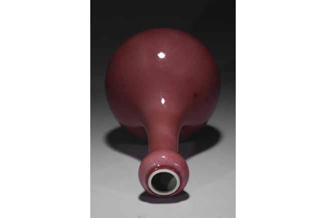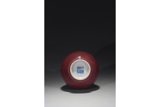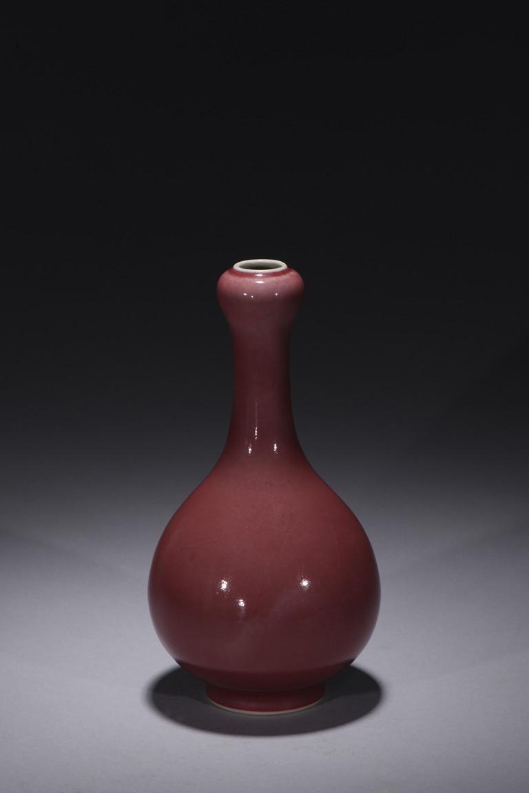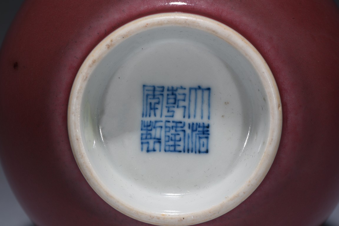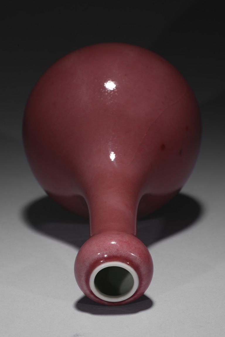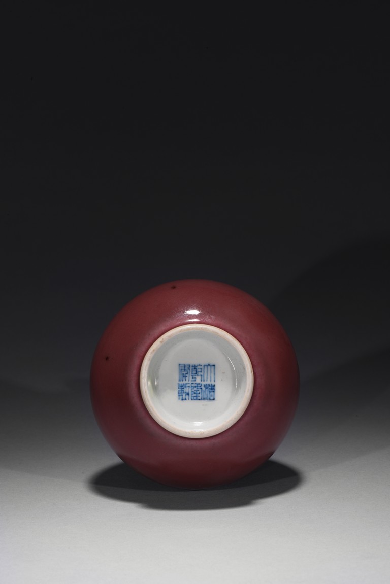 The pear-shaped body rising from a straight foot to a garlic mouth with a straight lip, the exterior covered with light red glaze with milky-lavender streaks drizzling down from the cream-coloured rim, the base inscribed with the seal mark in underglaze blue beneath a white glaze. Qing Dynasty Qianlong period.