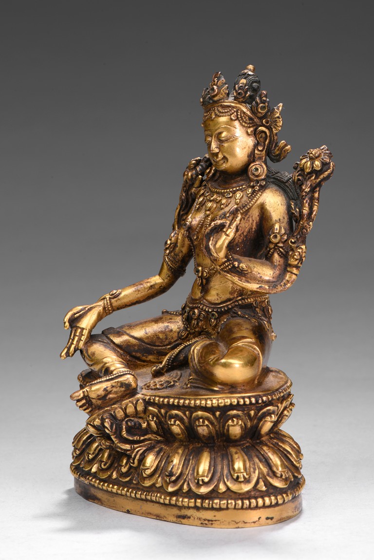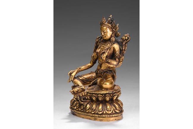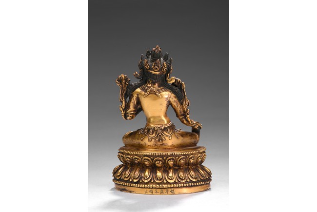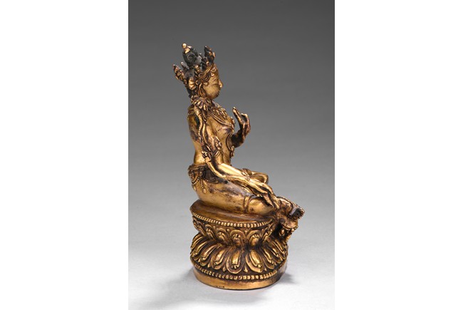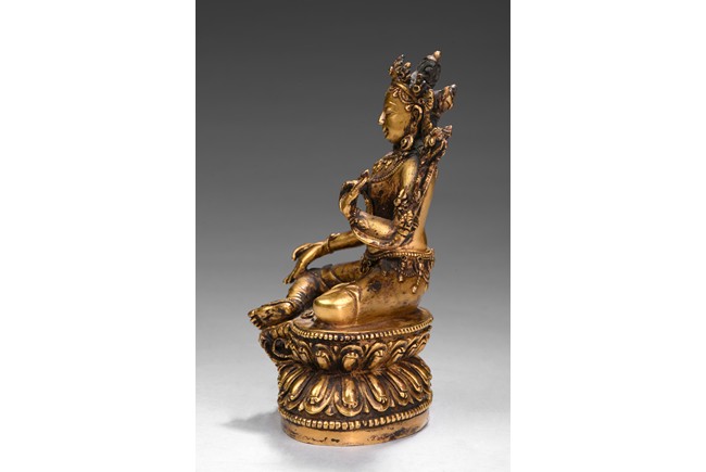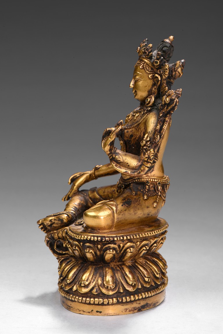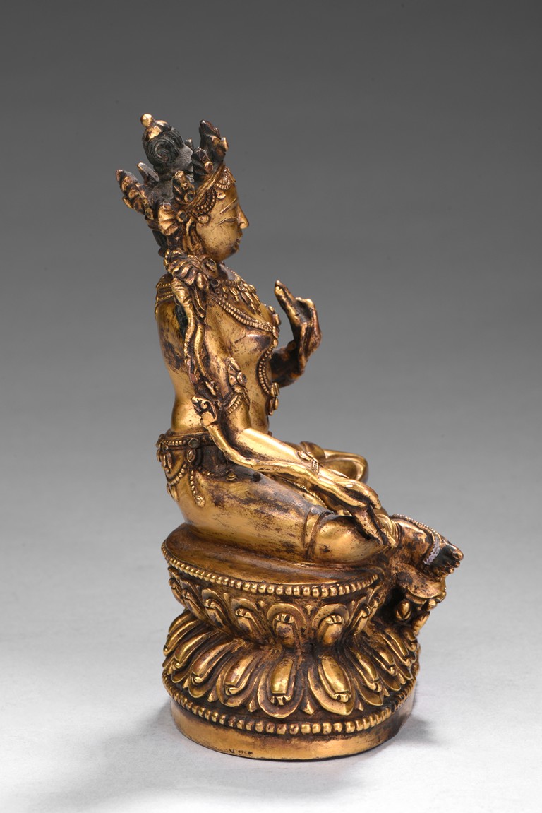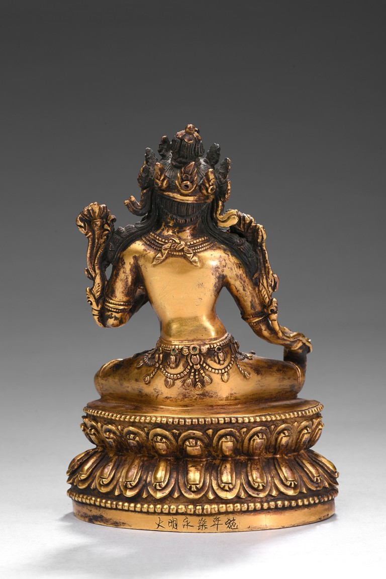 Seated in lalitasana on a double-lotus base with her pendant leg resting on an extended lotus blossom, her hands in vitarka mudra, clad in a dhoti secured with an elaborate belt, adorned in various jewelry and flanked by lotus blossoms at her shoulders, the reverse of the base bottom with six character 'Yong Le' mark. Republic period.
