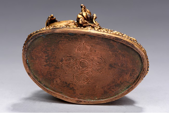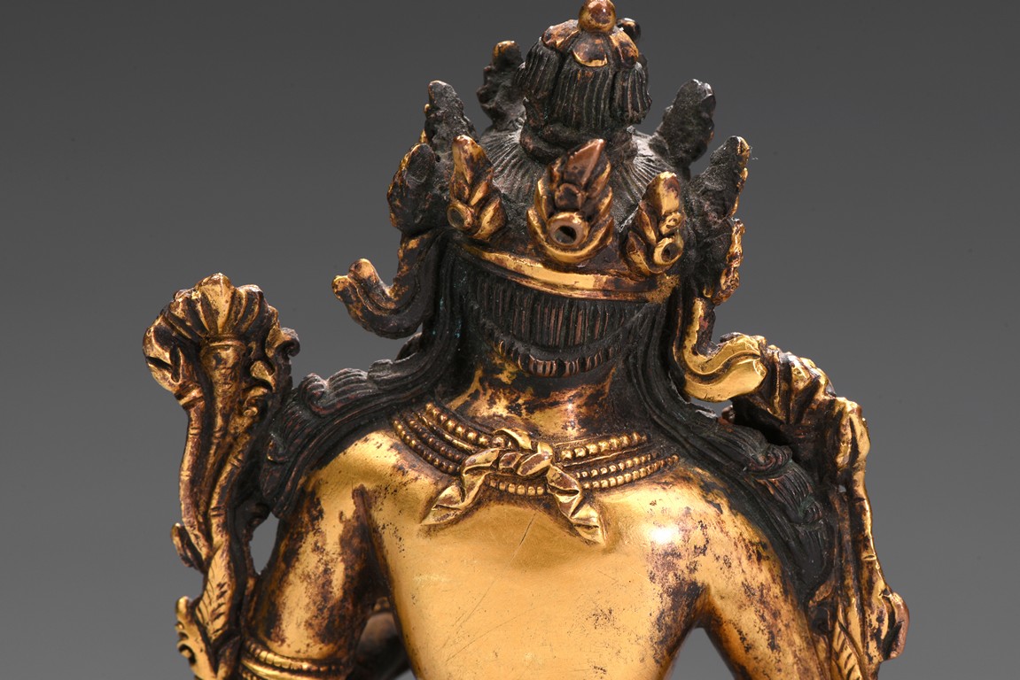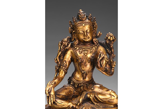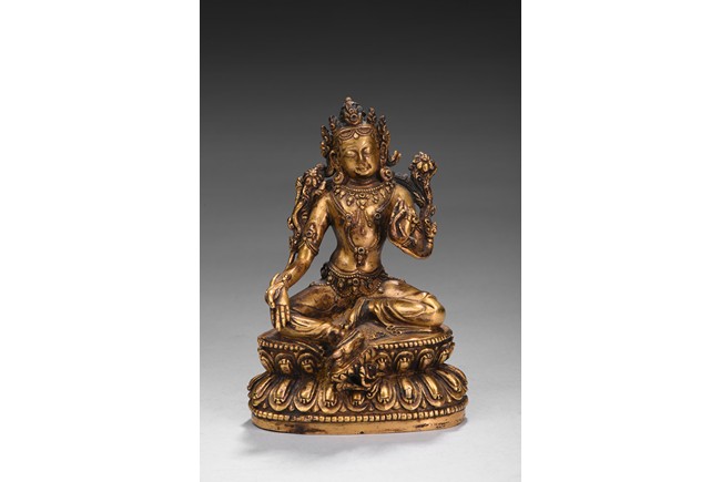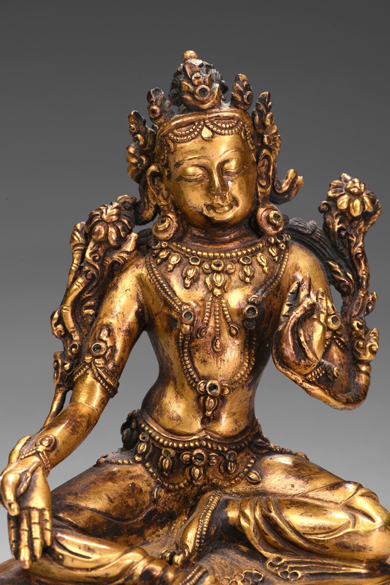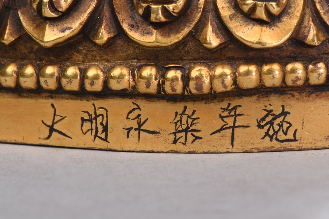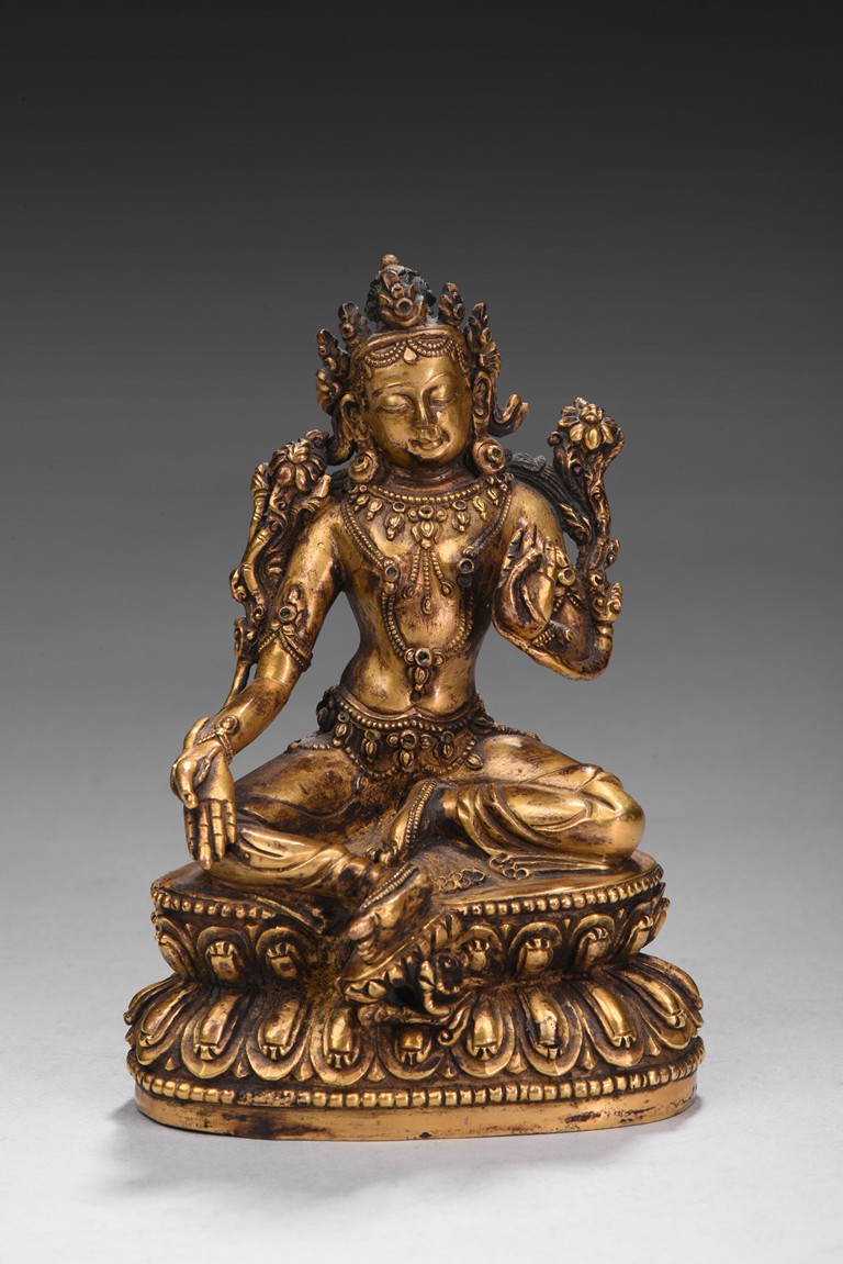 Seated in lalitasana on a double-lotus base with her pendant leg resting on an extended lotus blossom, her hands in vitarka mudra, clad in a dhoti secured with an elaborate belt, adorned in various jewelry and flanked by lotus blossoms at her shoulders, the reverse of the base bottom with six character 'Yong Le' mark. Republic period.