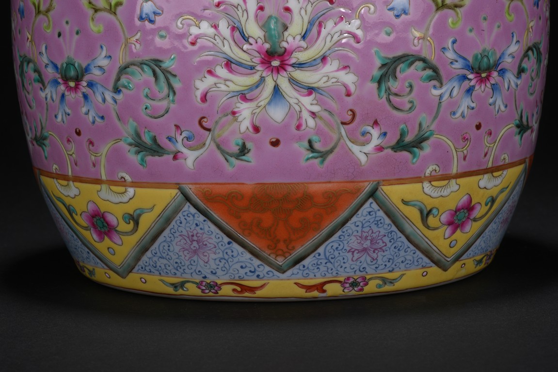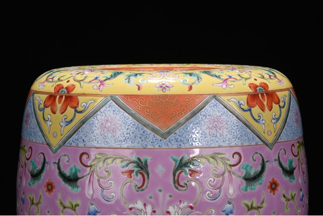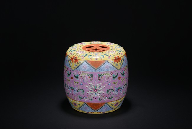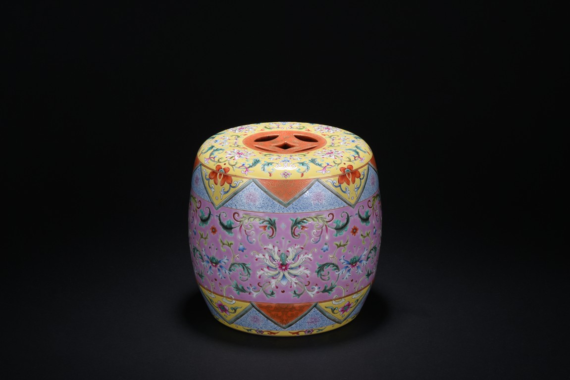 The barrel-shaped stool with a pierced 'coin' motif on the slightly convex top, painted in famille-rose palette with a floral motif of chrysanthemums on a yellow ground draping over the sides terminating in eight triangle pattern enclosed scrolled ruyi or peonies, the body finely enamelled with meandering lotus scrolls reserved on pink ground, close to the base with the similar triangle pattern to the stool top rim. Qing Dynasty period.