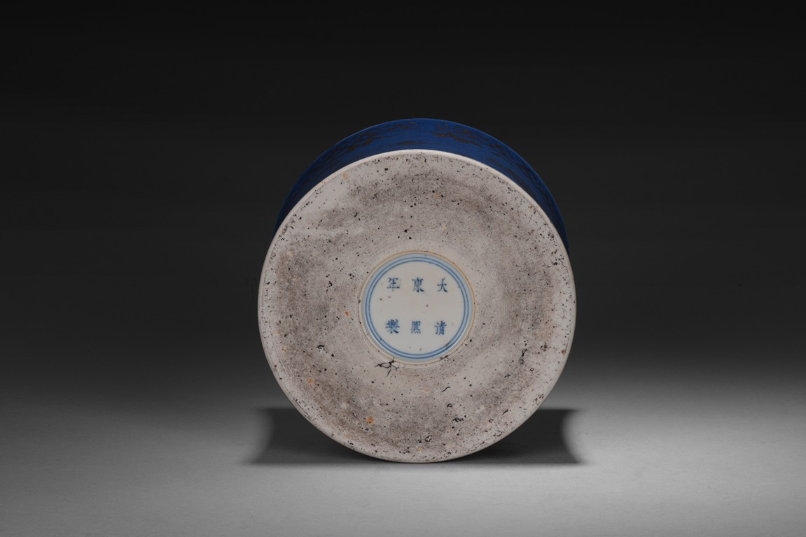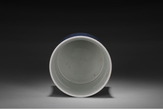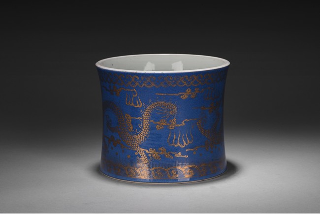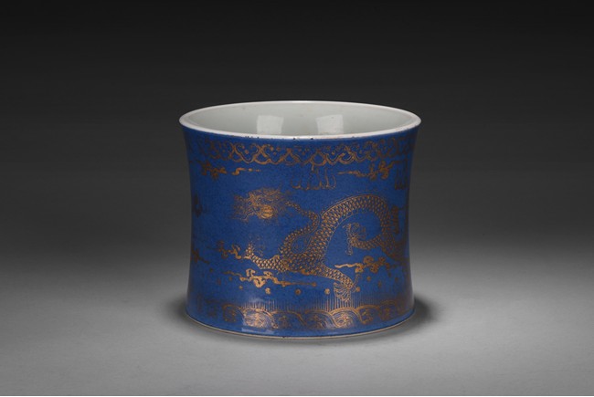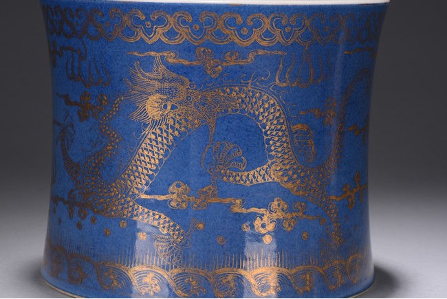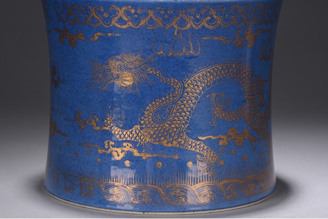 Of waisted cylindrical form, the exterior gilt with a continuous scene of two dragons standing amidst scrolled clouds below ruyi band. Late Qing Dynasty period.
