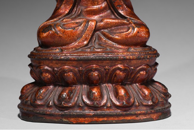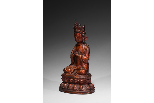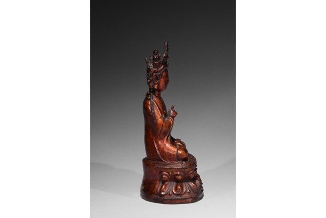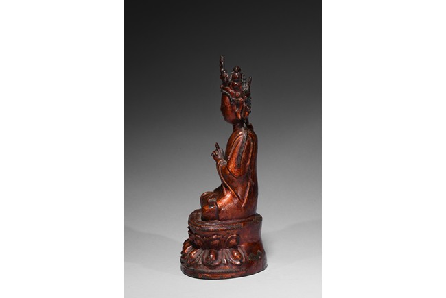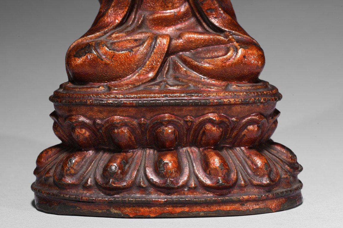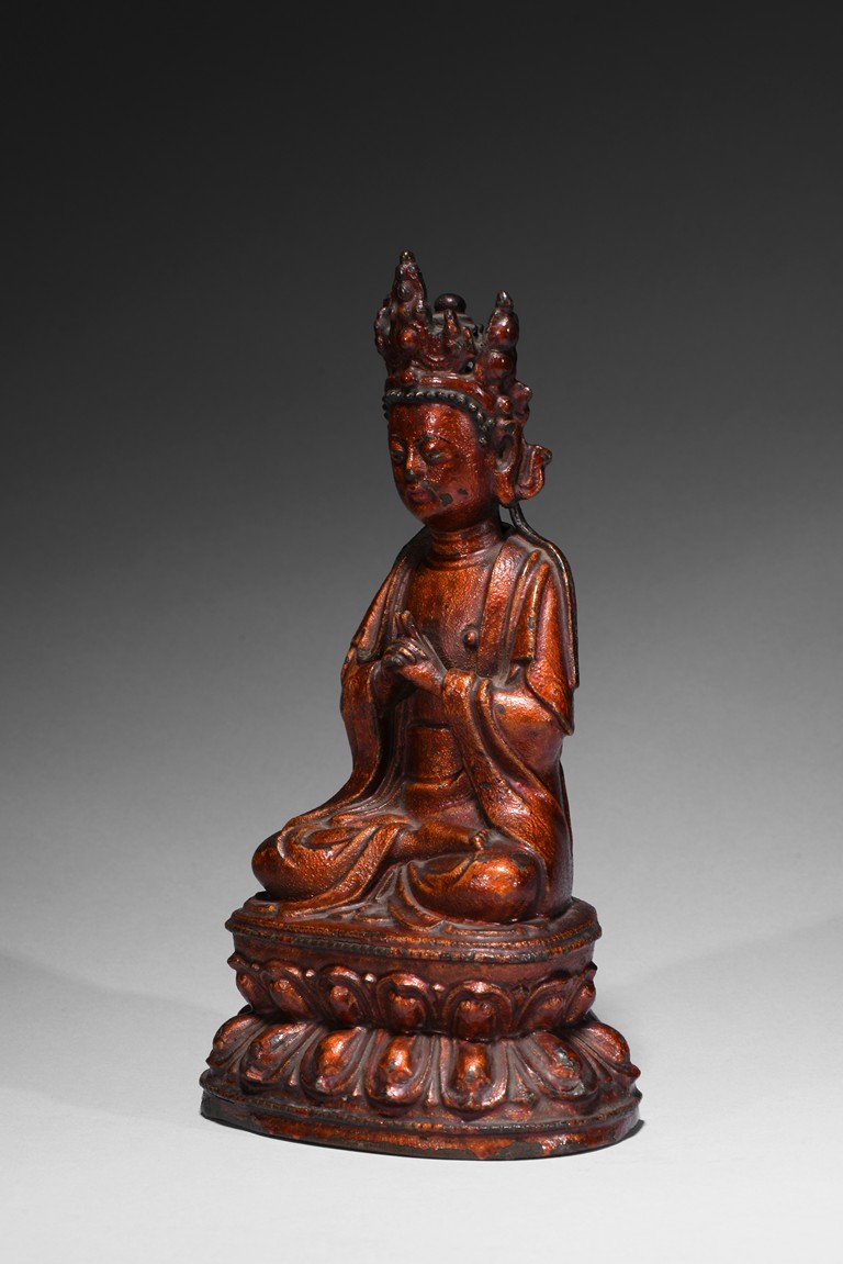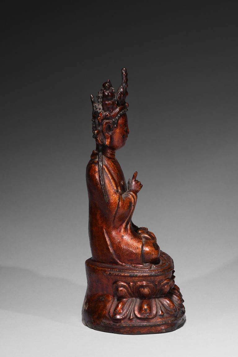 Cast seated upon double lotus throne, hands in abhisekana mutra, face with meditative expression, wearing an elaborate crown. Qing Dynasty period.