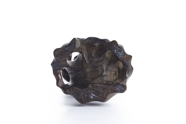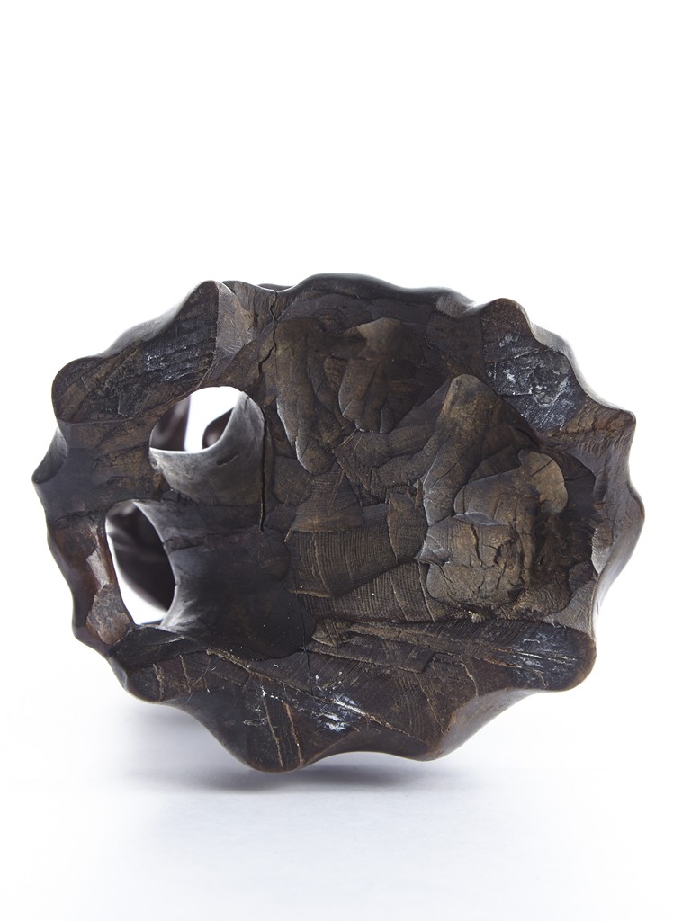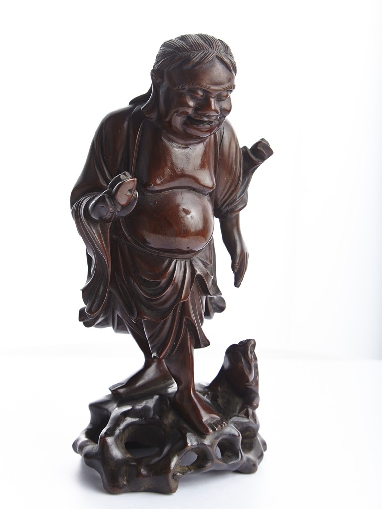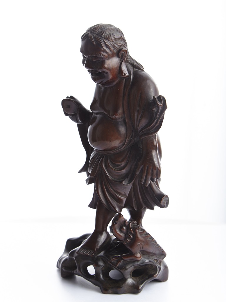 Shown standing on base with golden toad on his left, his right hand holding a coin, wearing long robes exposing belly, the face with laughing expression with mouth open, hair finely incised. Republic period.