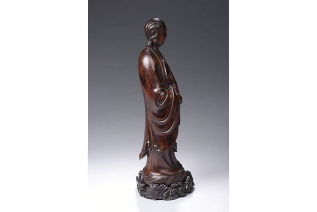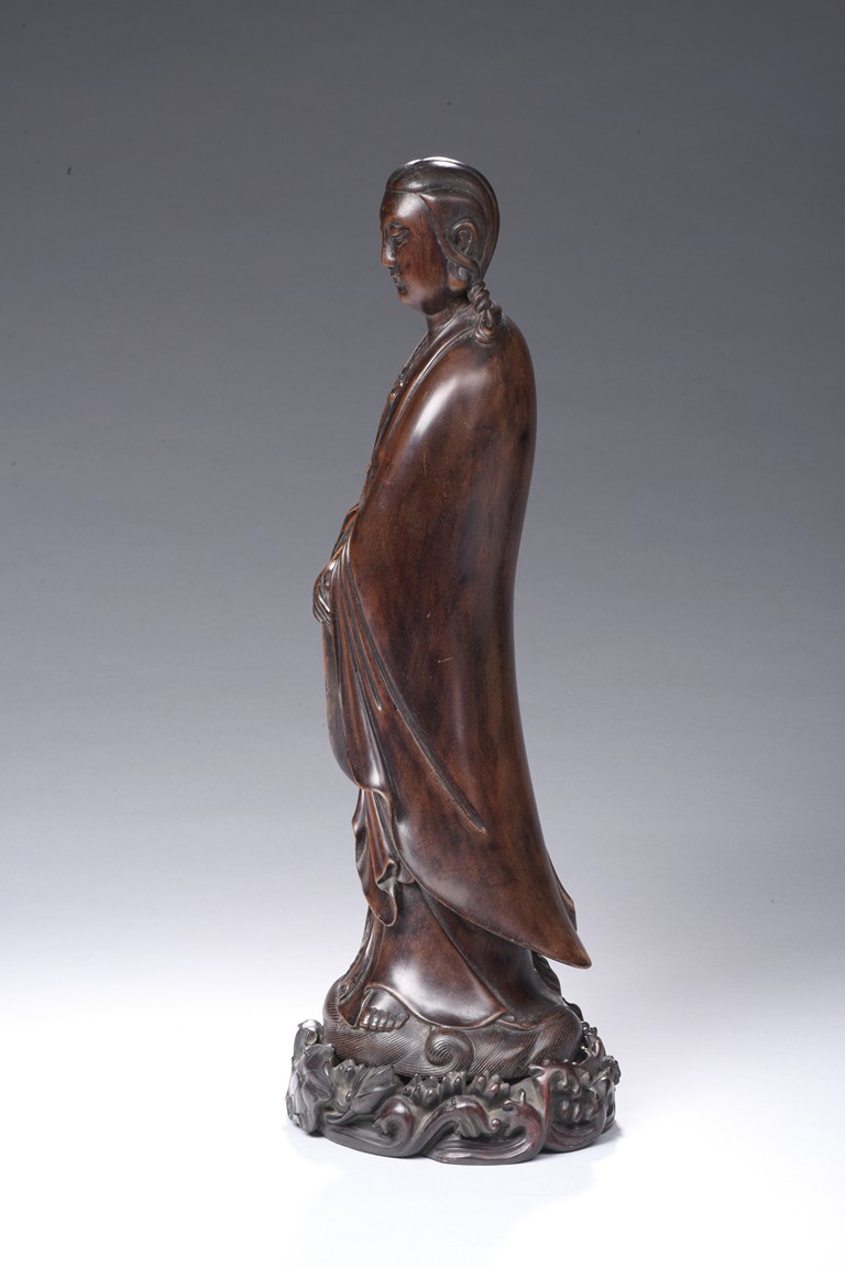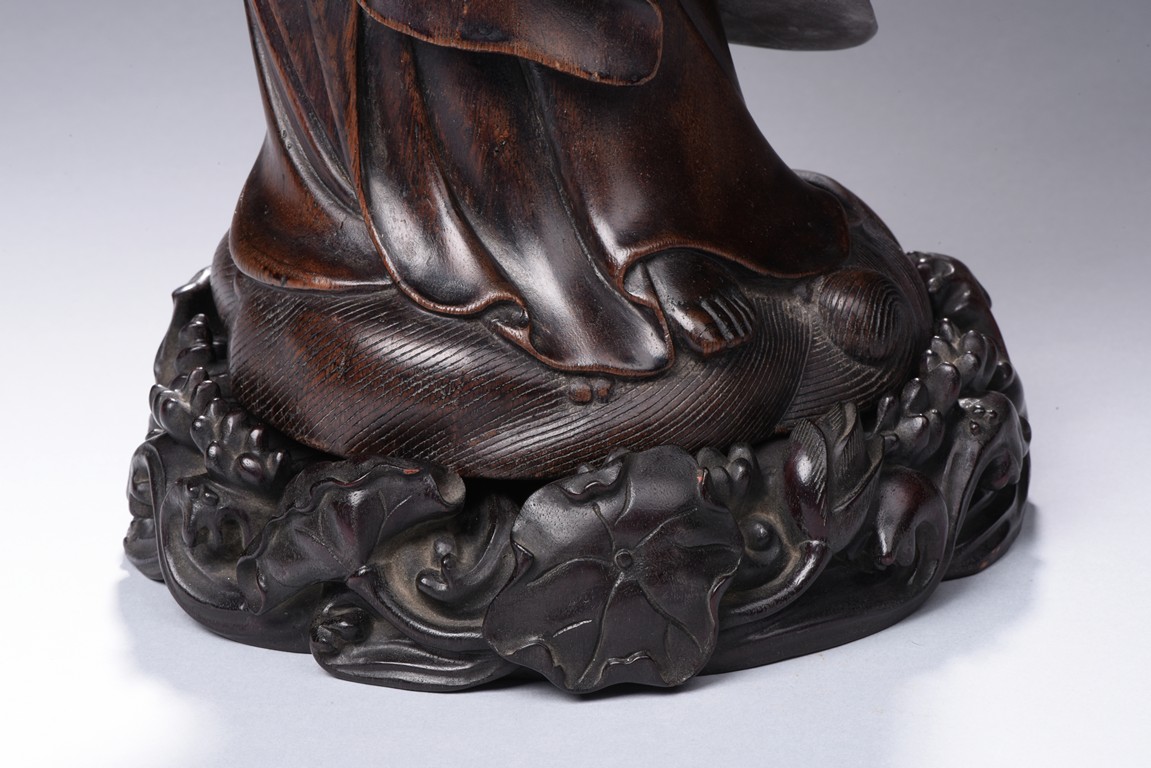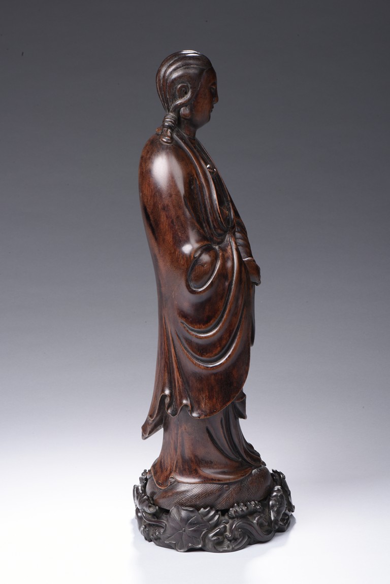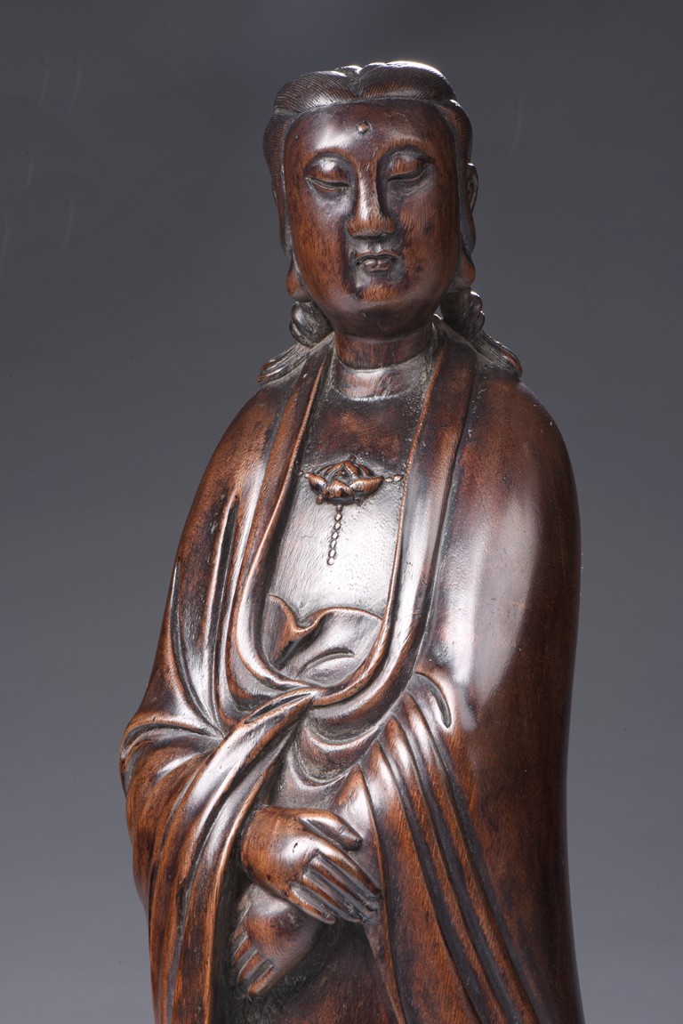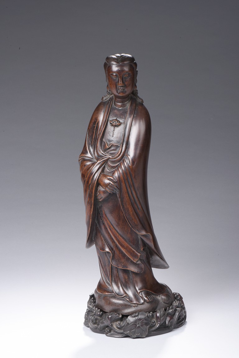 Carved standing with the head turned slightly to the left, wearing a loose fitting robe billowing in the wind and opening at the chest to reveal the beaded necklace, her slender hands emerging from the sleeves to hold before the belly, the face with downcast eyes and a serene expression, with a fitted carved blooming lotus flower zitan stand. Qing Dynasty period.