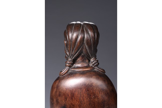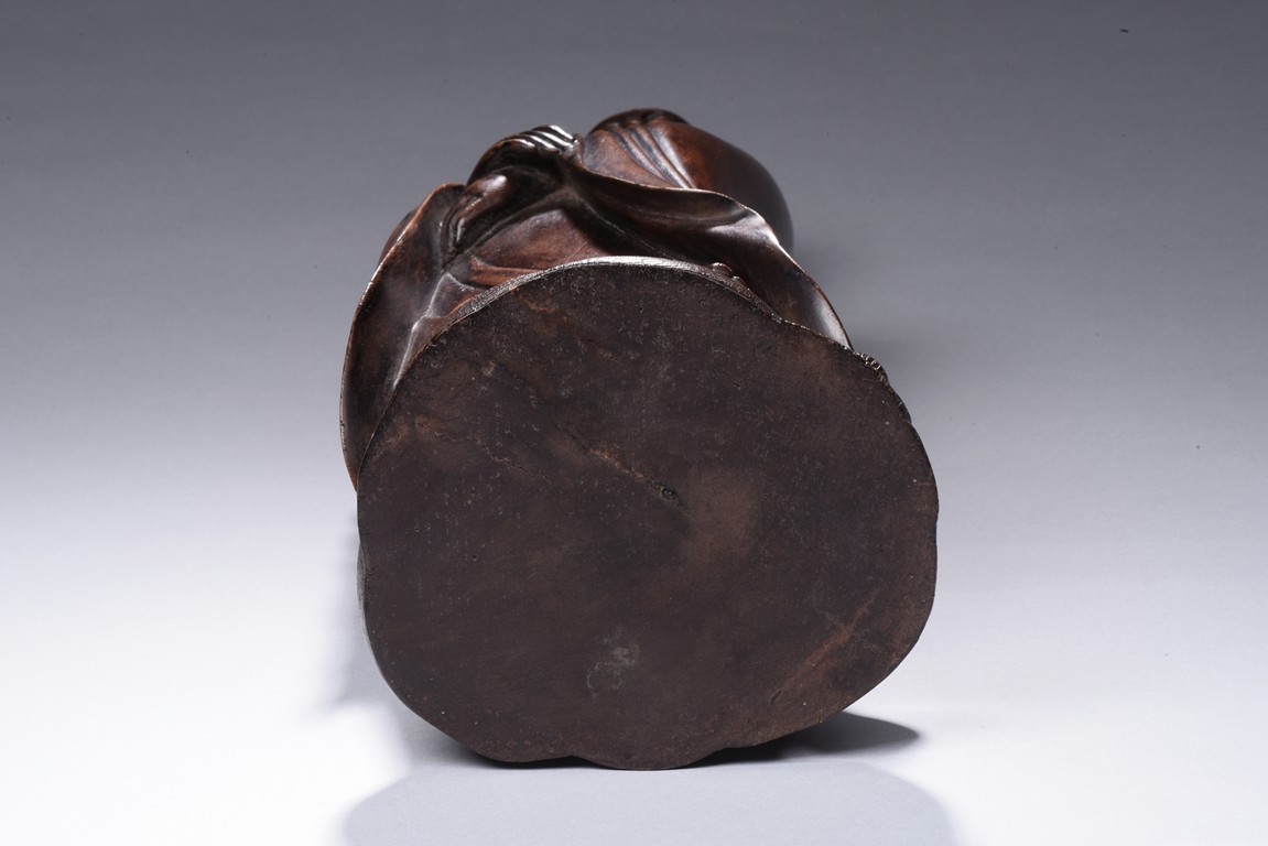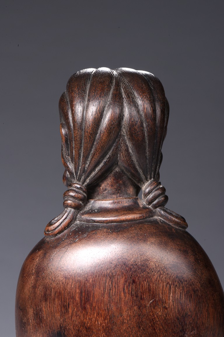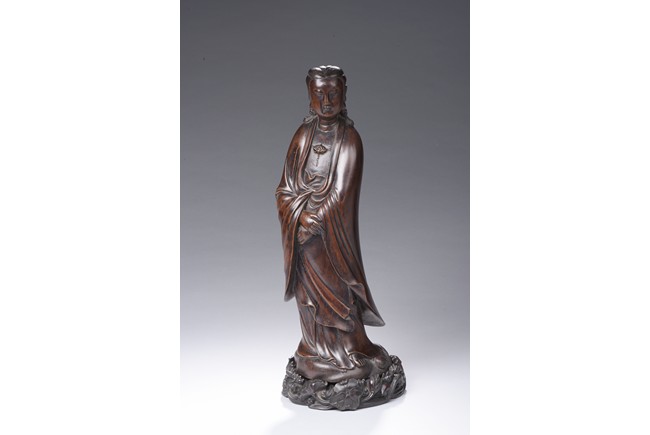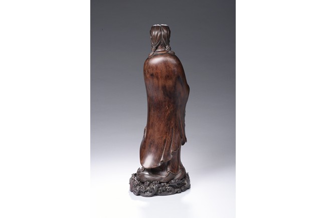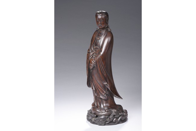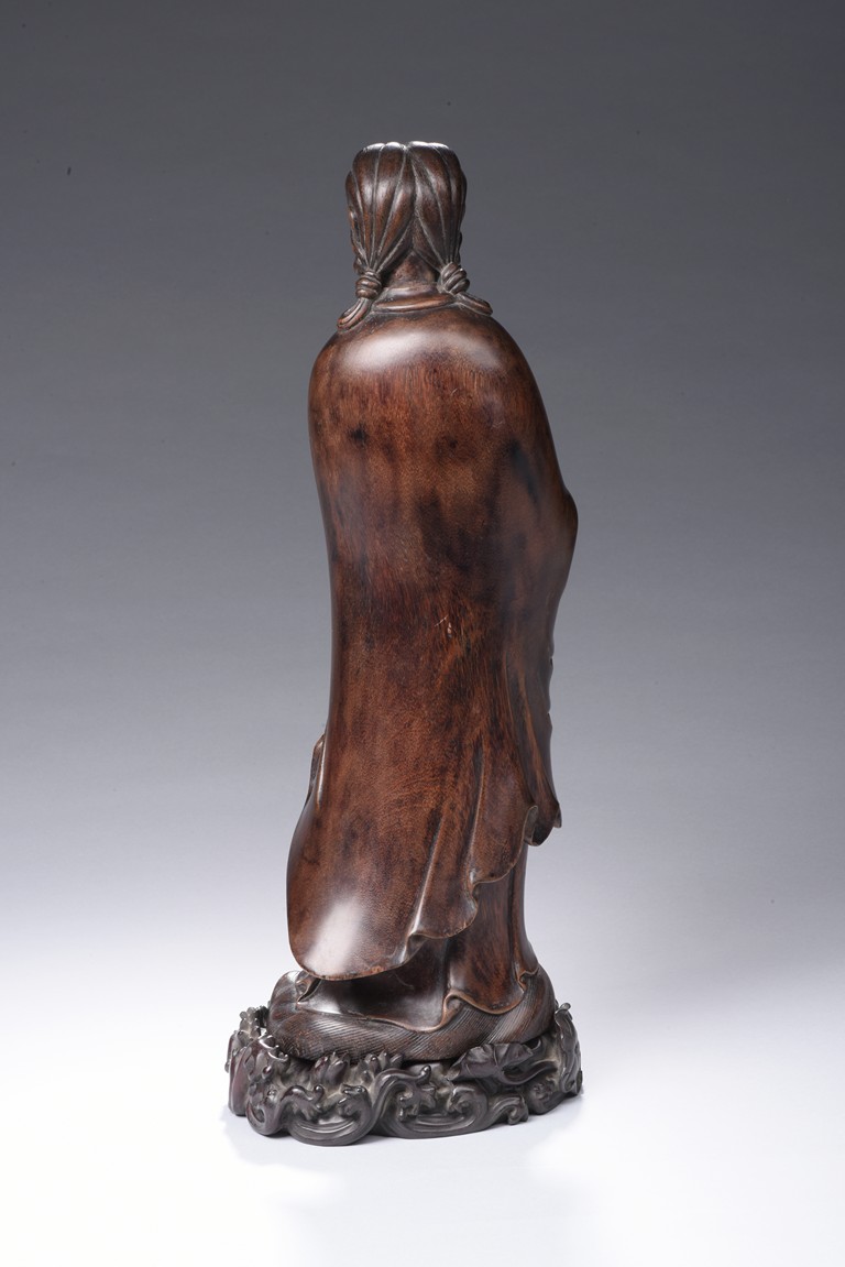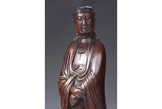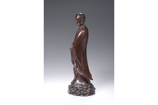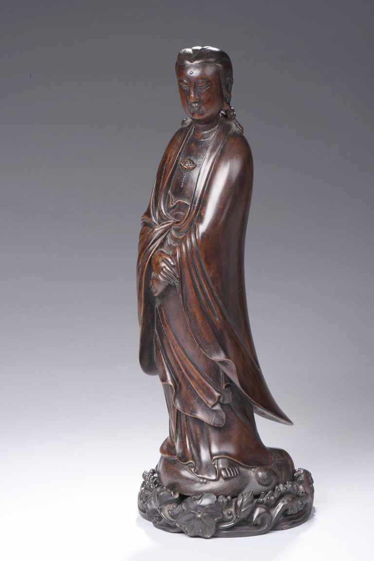 Carved standing with the head turned slightly to the left, wearing a loose fitting robe billowing in the wind and opening at the chest to reveal the beaded necklace, her slender hands emerging from the sleeves to hold before the belly, the face with downcast eyes and a serene expression, with a fitted carved blooming lotus flower zitan stand. Qing Dynasty period.